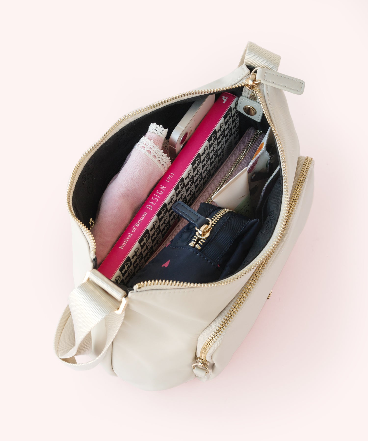 綺麗見えと便利な収納が叶うワンショルダーバッグ。フロントのファスナーポケットはややマチがあって大きく開閉できるので、スマホやカードケースなどの出し入れがストレスフリー。ボディーはころんとした優しいフォルムにこだわり、フロントにクローバーやロゴのメタルアクセントをプラスして、身に着けた時にカジュアルすぎないデザインに仕上げています。ショルダーテープは長さの調整で肩掛けも斜め掛けも可能。トレンドのハーフムーン型ボディーのメインコンパートメントはカーブを描くようにファスナーを付いていて、心地よく体に沿うような形も魅力です。とっても軽く程よい大きさなので、デイリーや通勤・ご旅行など幅広いシーンに活躍するおすすめのアイテムです。【対応しているもの】・長財布(約10cm×20cm):横のみ〇・ペットボトル横向き(500ml)【仕様】・内ポケット:2(オープン・ジップ)・外ポケット:1(ジップ)※ご注文後の変更・キャンセルおよびお客様のご都合による返品は出来ません。ご注文にお間違いがないようご確認ください。返品・交換について