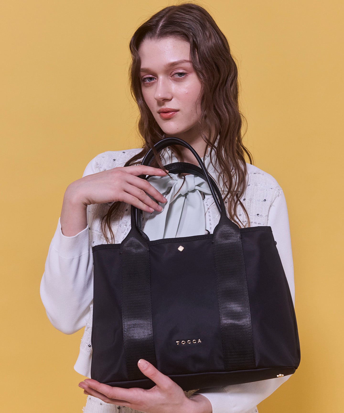 ハンドルは長めなのでコートスタイルでも肩入れがよく、荷物が重くなっても肩に負担がかかりにくいやや太めの幅に。マグホックタイプの口元は開閉がスムーズで、中の書類などをさっと取り出しやすい様配慮しています。