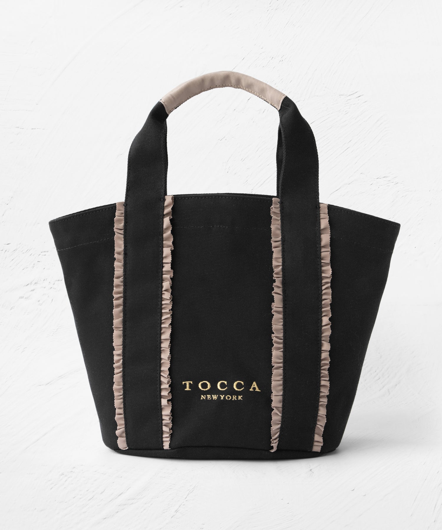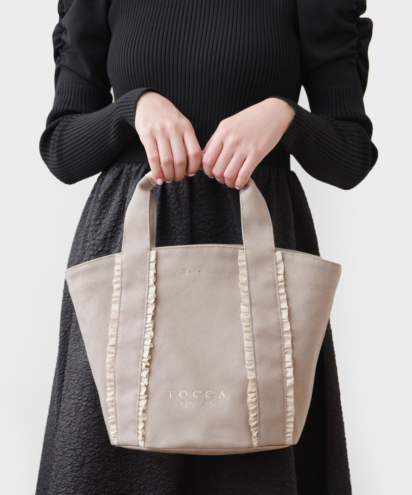 オールブラックのほか、フリルとハンドルをバイカラーにした配色のタイプも大人っぽくておしゃれ。大きすぎないサイズ感ながら見た目以上にたっぷり収納ができ、デイリーはもちろん通勤やオンタイムにもぴったり。