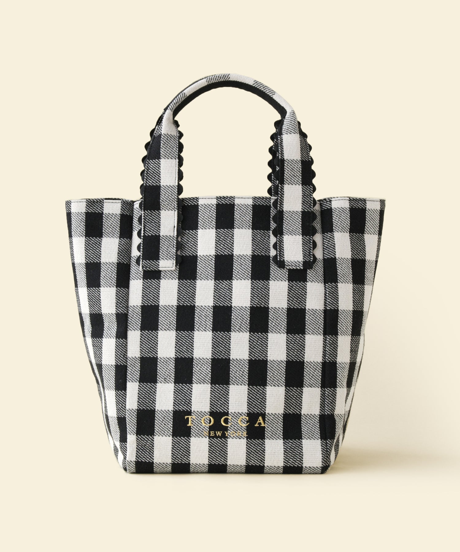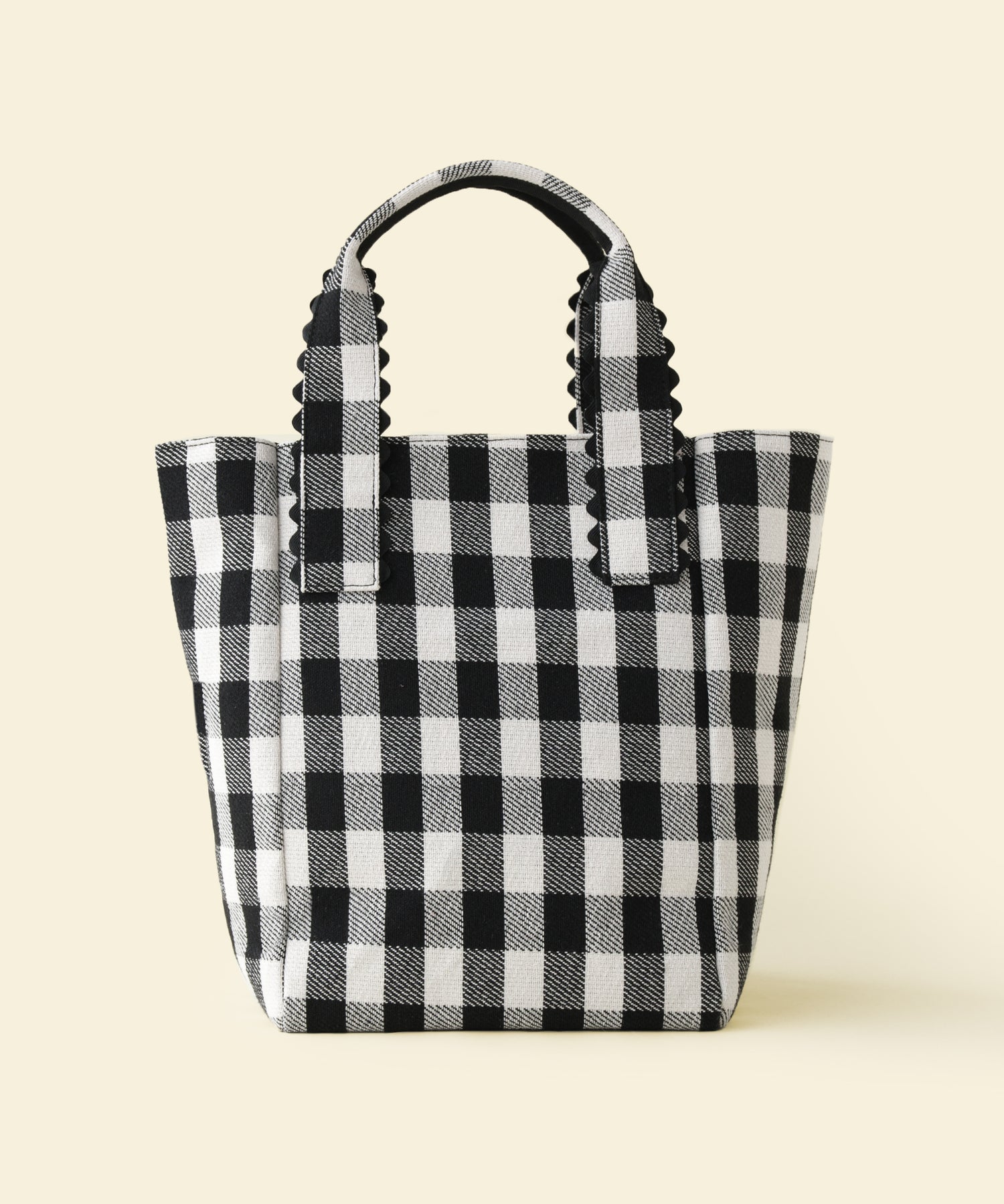 フリルのような繊細なウェーブのブレードでハンドルをトリミングして、カラーアクセントを利かせたトートバッグ。