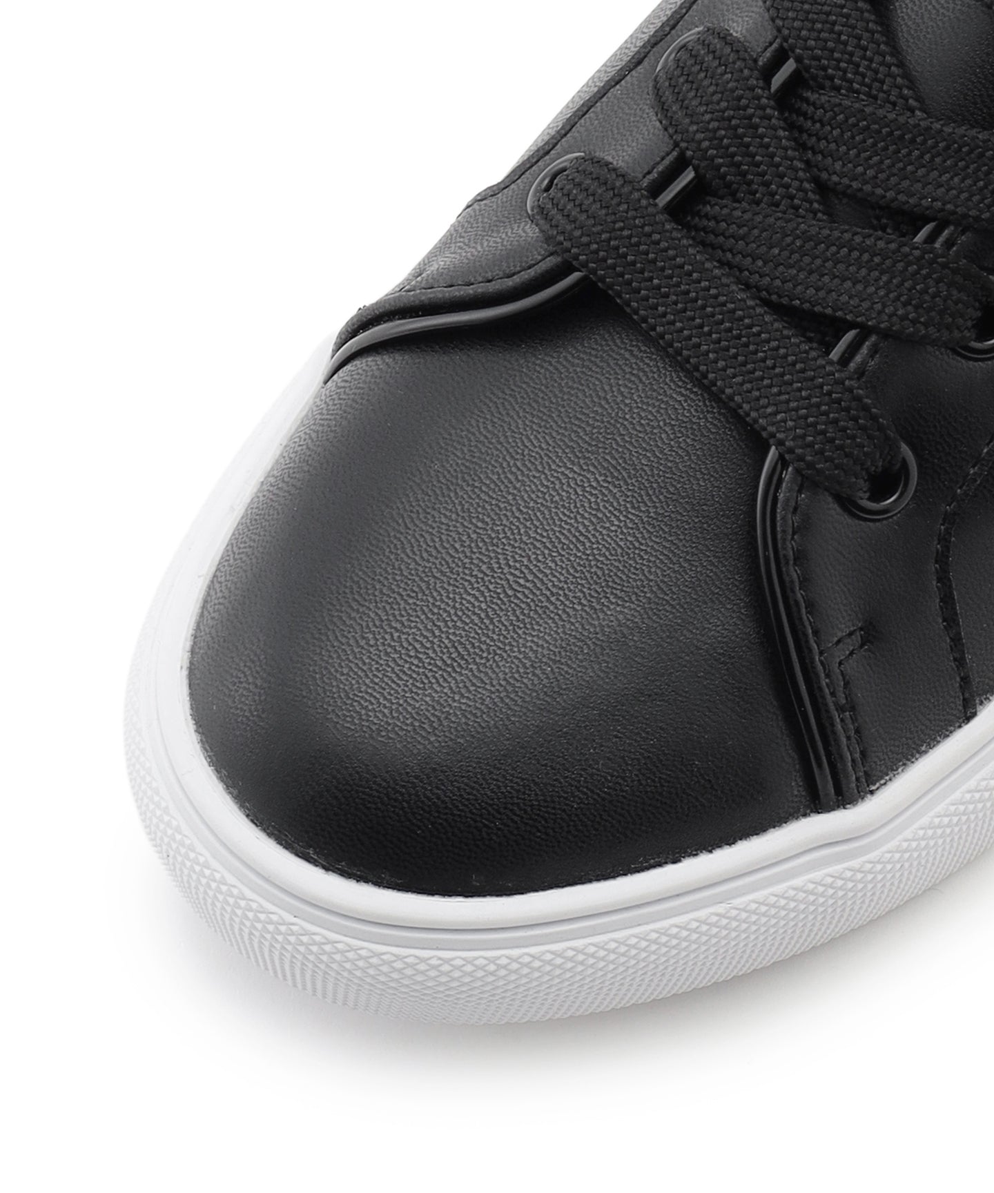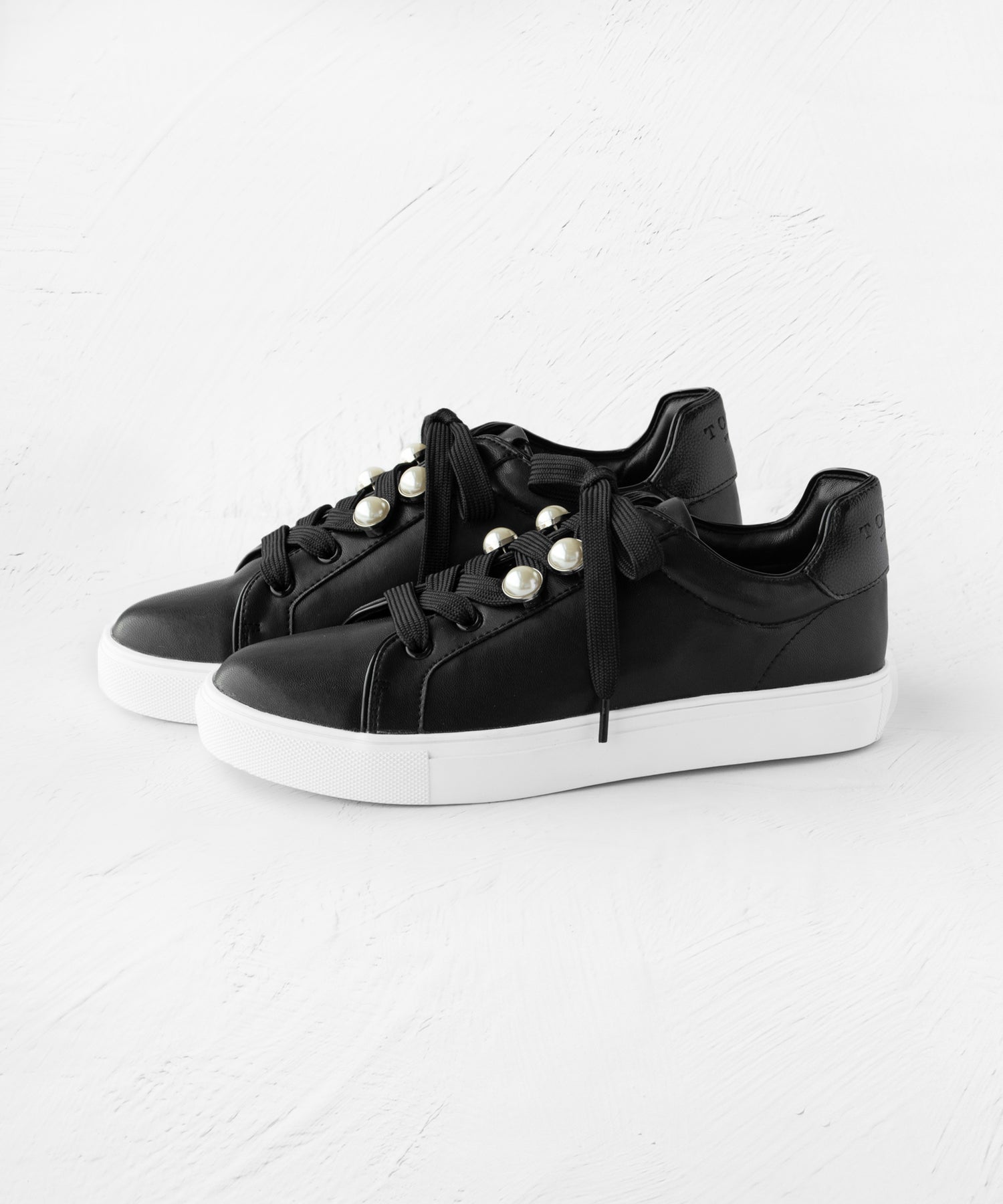 シューレースのホールにパールのアクセントを施した、上品でロマンティックな晴雨兼用フェイクレザースニーカー。