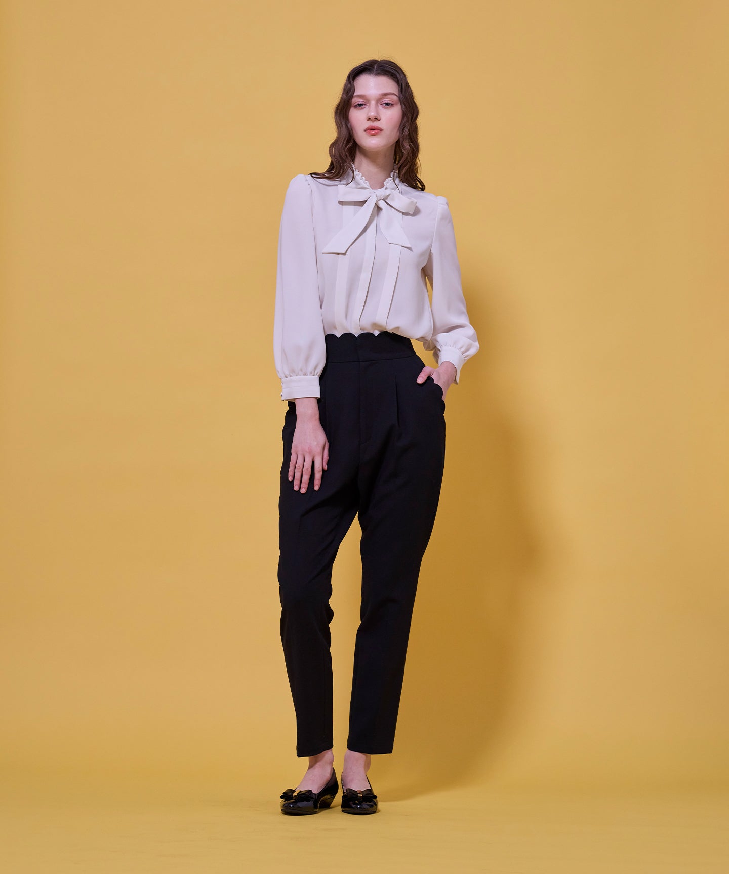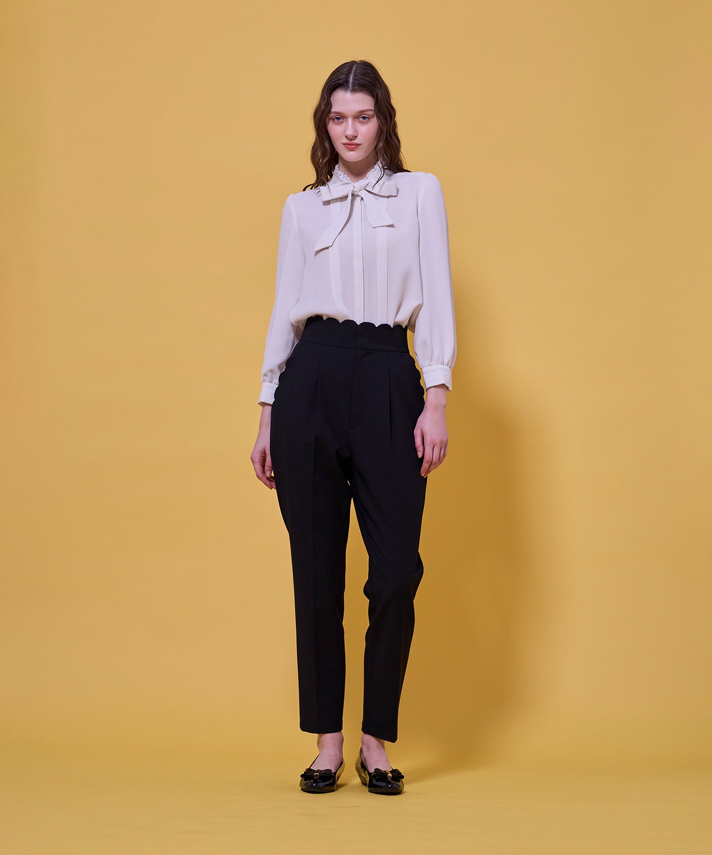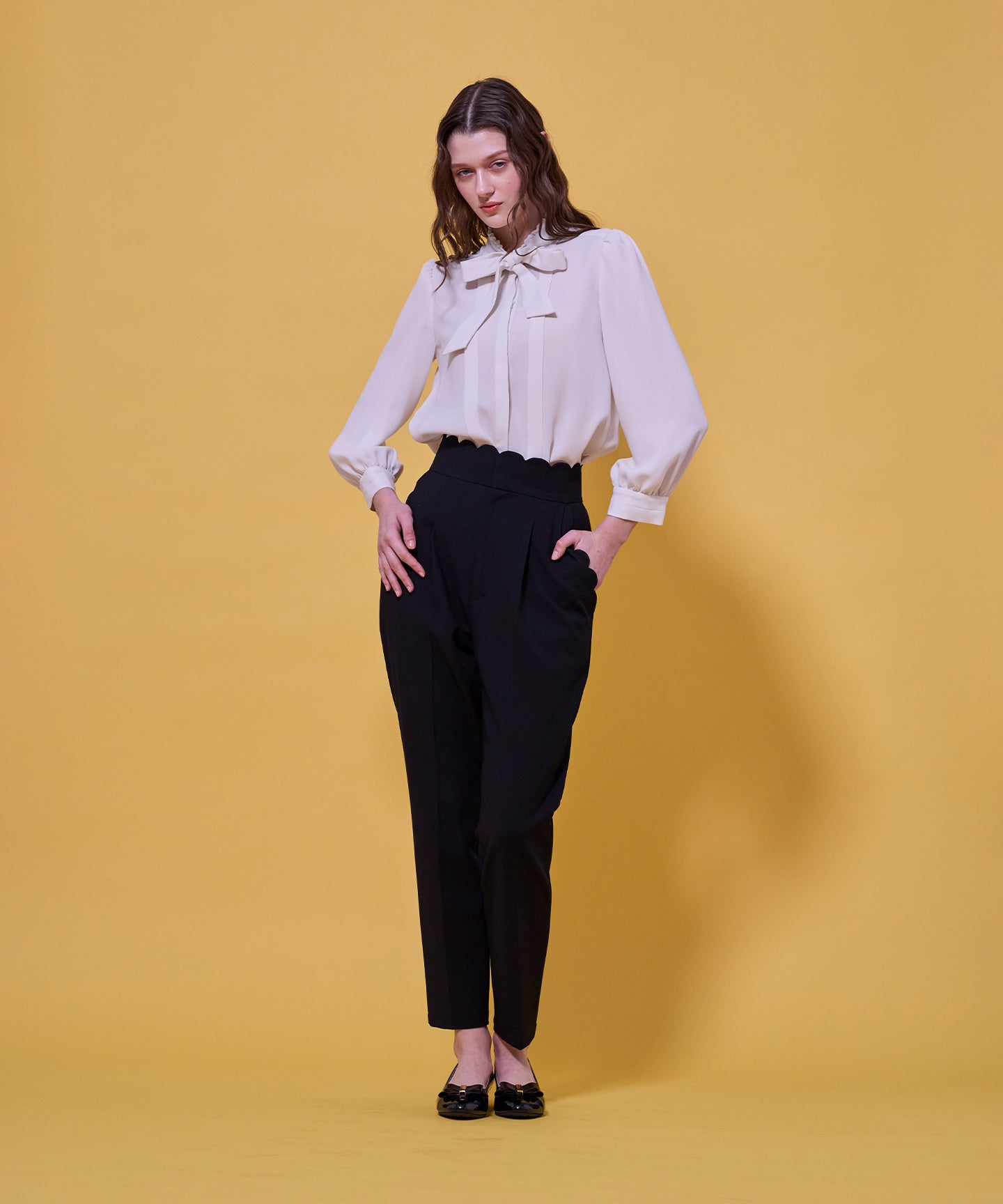 ウエストとポケット部分にスカラップカットを施した、フェミニンな表情のハイウエストパンツ。