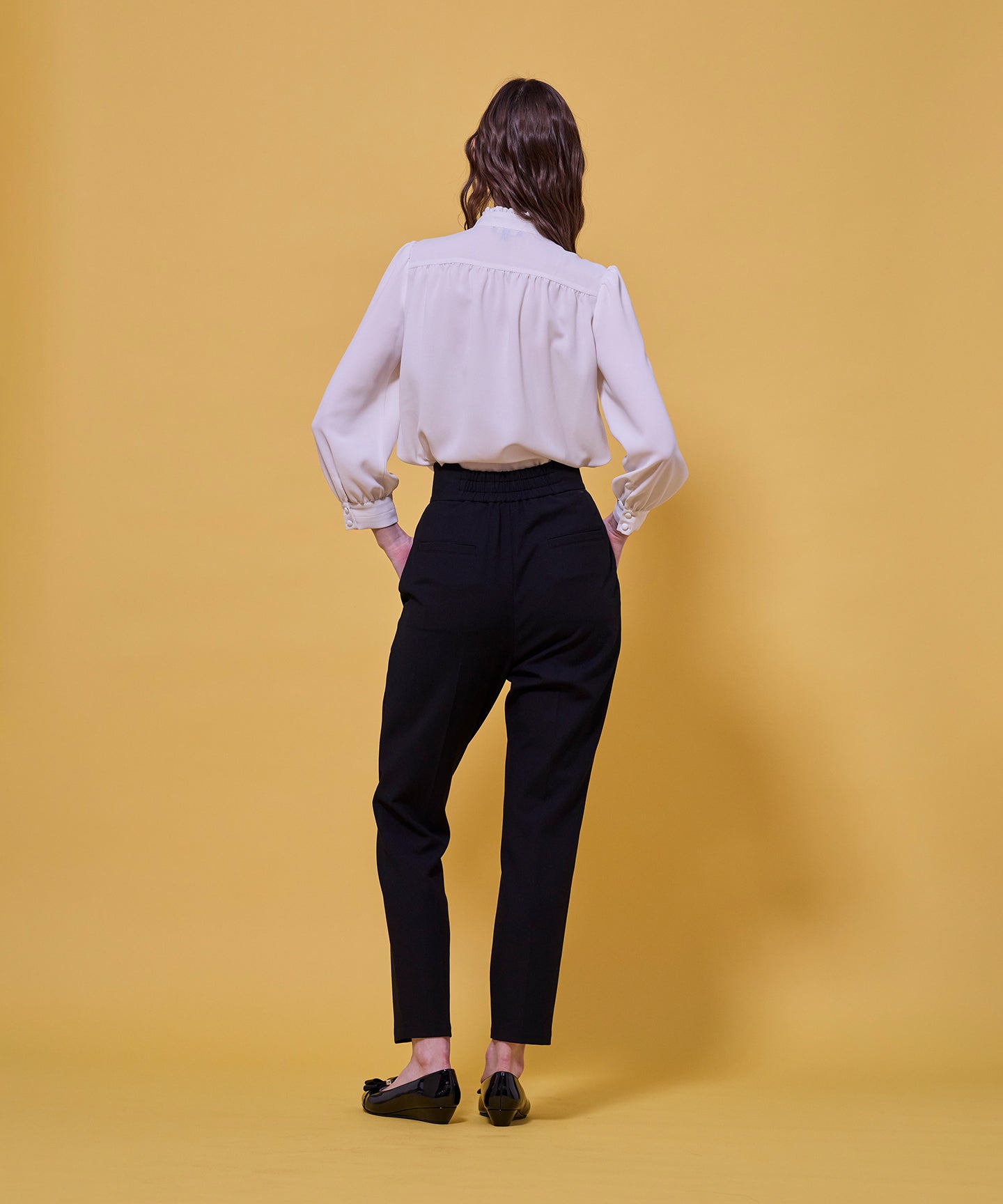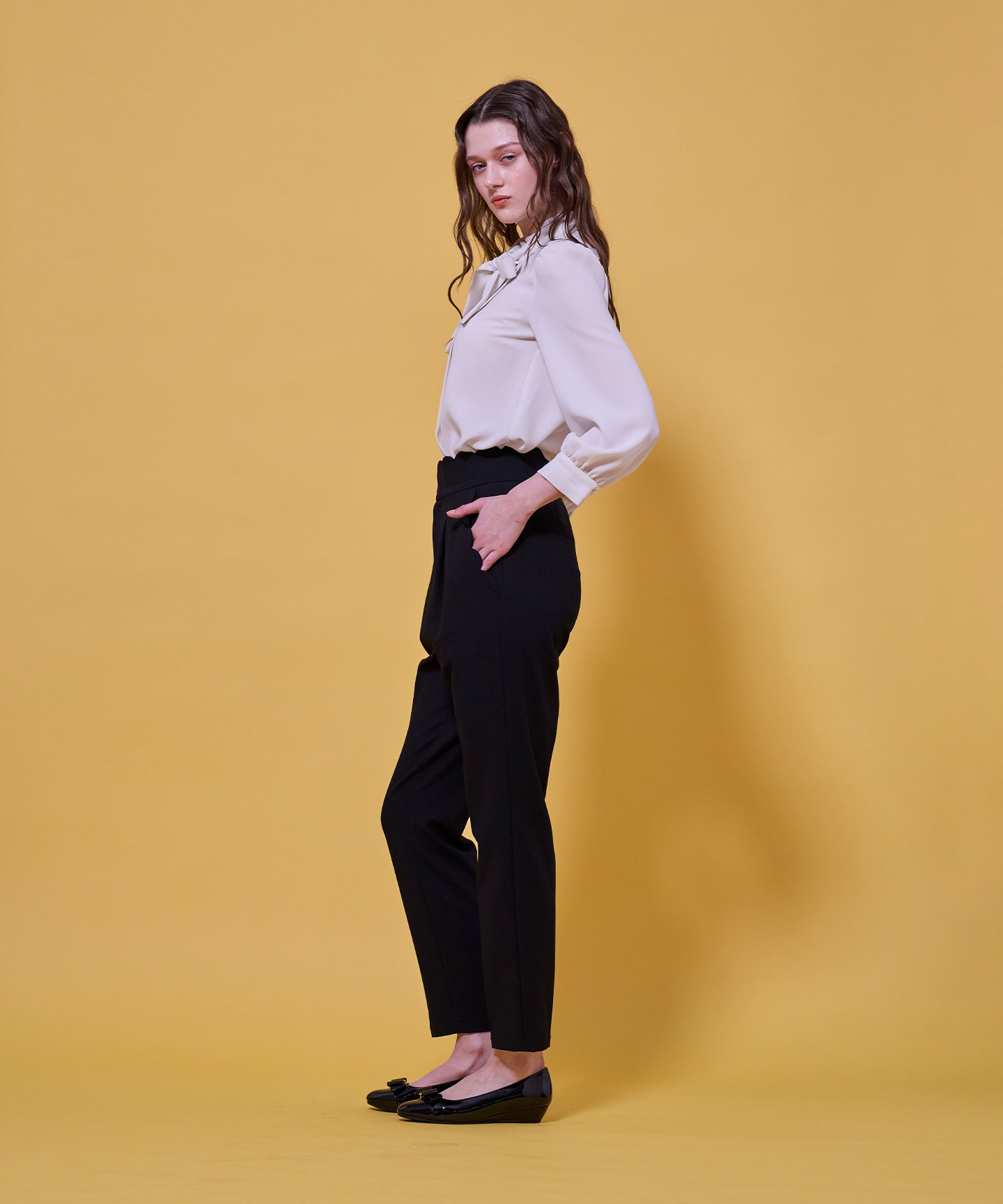 シンプルなシルエットに女性らしいニュアンスを添え、スタイリングにさりげない華やかさをプラスしてくれます。 ハイウエストならではの美しいフィット感が、脚長効果とスタイルアップを叶え、すっきりとした印象に。