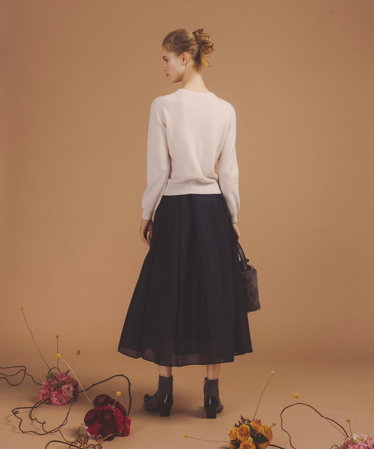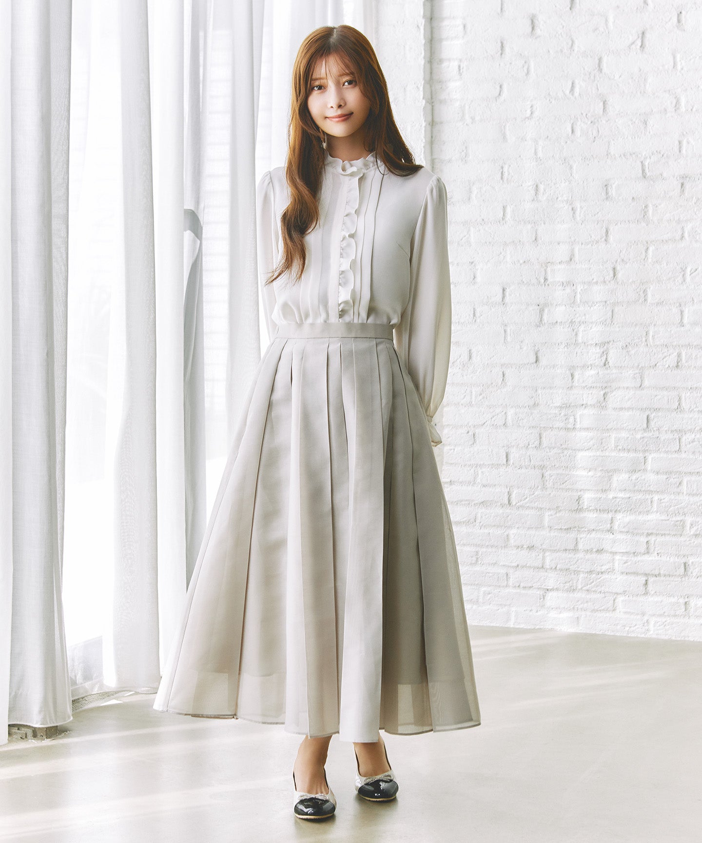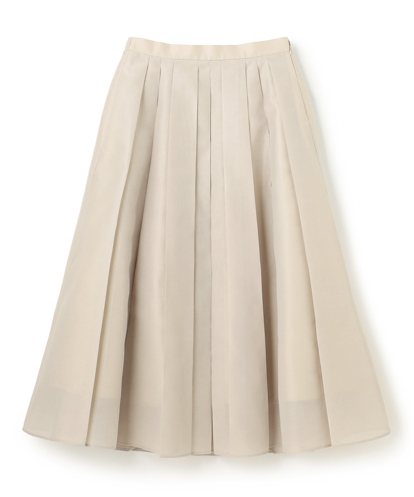 繊細なオーガンジー素材にプリーツを施した、珍しいデザインが目を惹く一枚。透明感のある軽やかな素材に、シャープなプリーツラインを重ねることで、甘すぎず大人の洗練された印象に仕上げました。