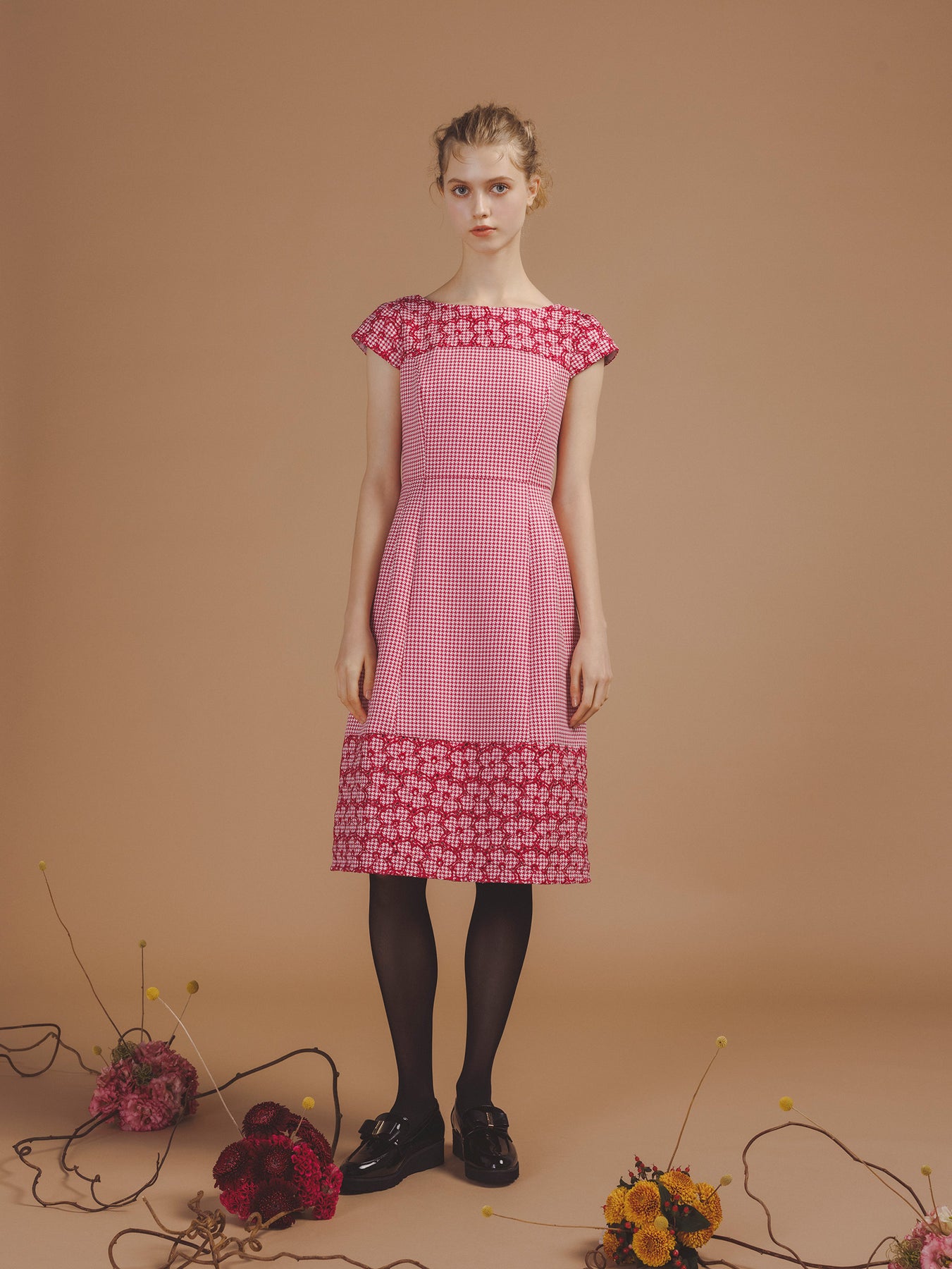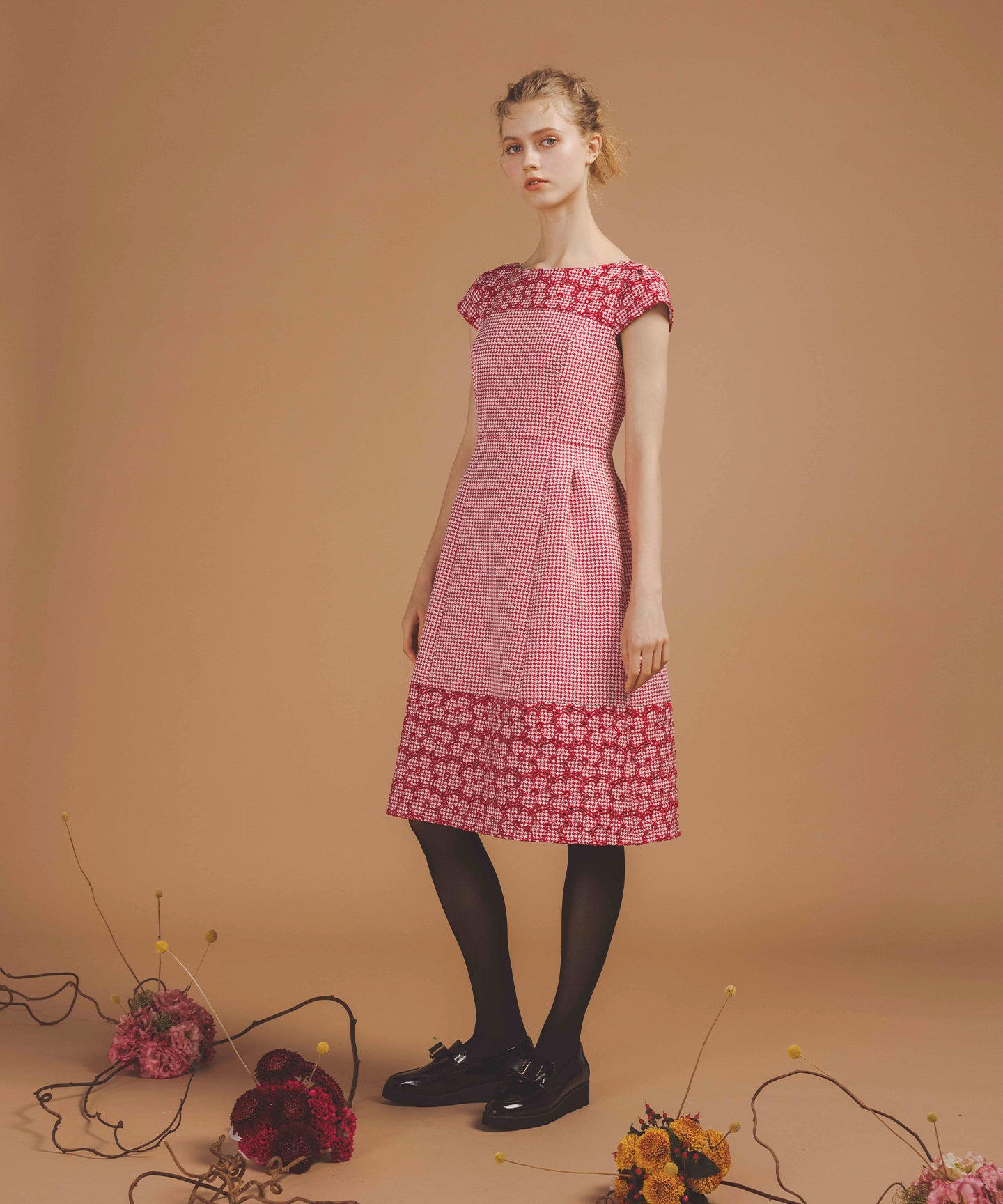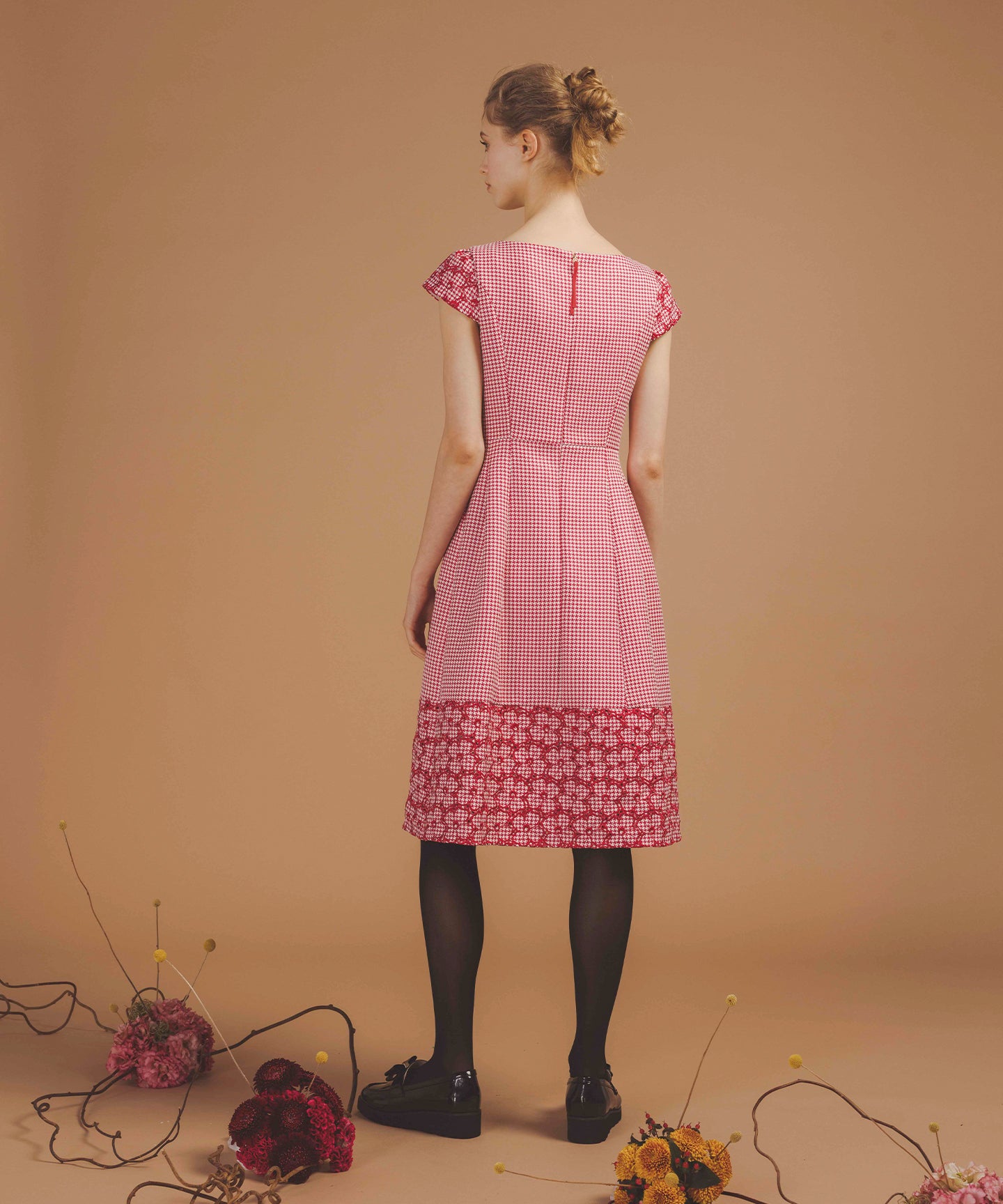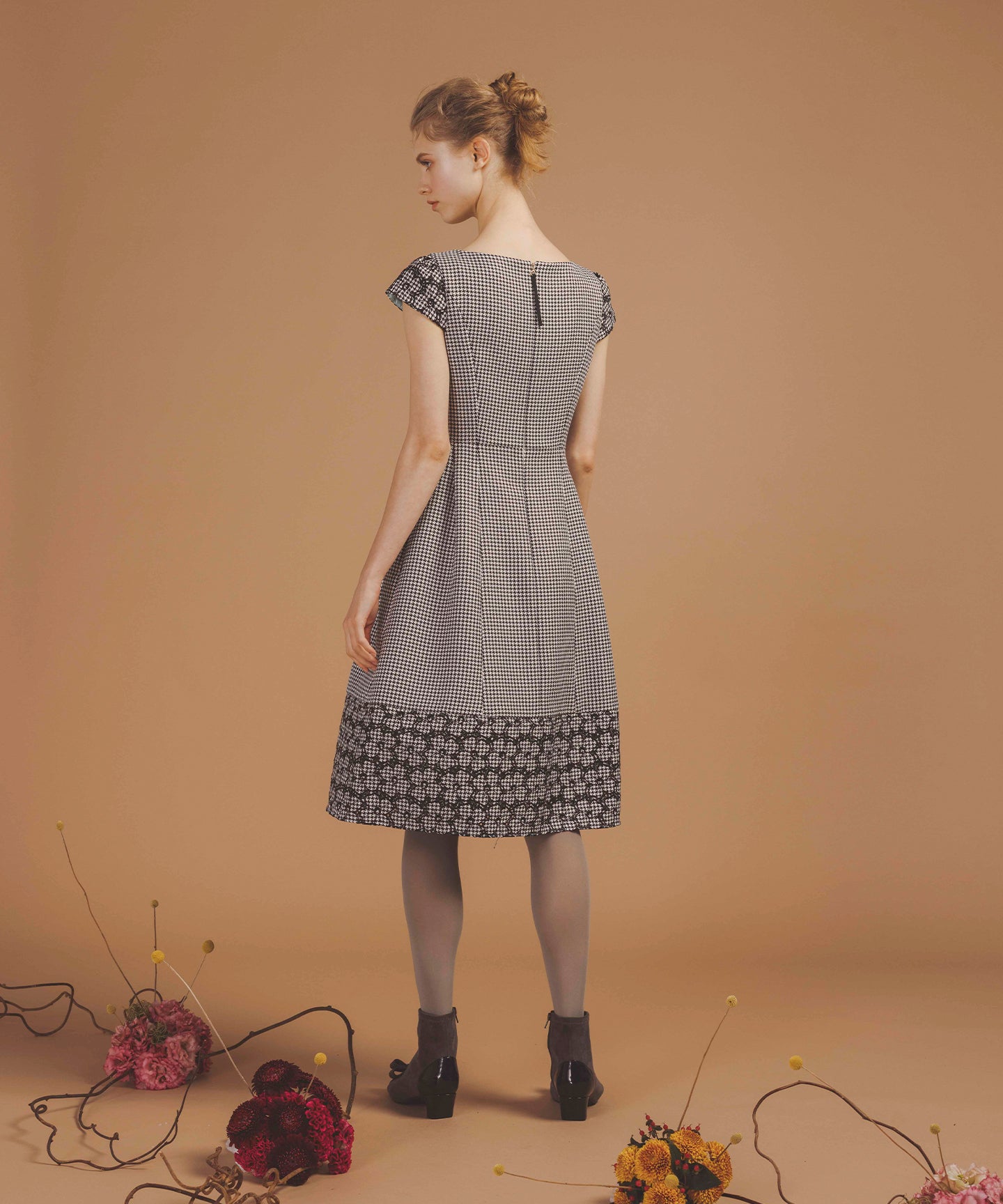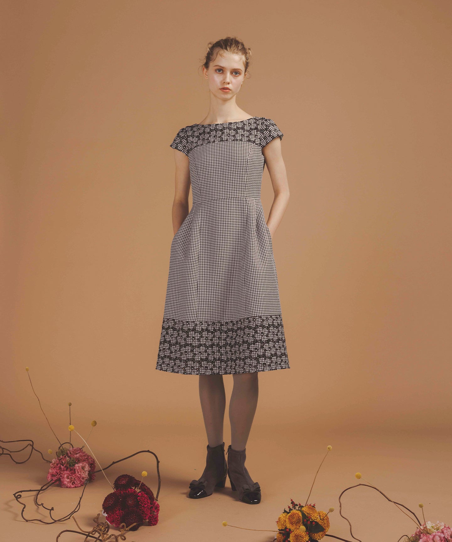 千鳥柄のジャカード生地に刺繍をあしらった、クラシカルで洗練された雰囲気を纏うドレス。 立体感のあるジャカード織りならではの上質な風合いに、丁寧に施された刺繍が華やかなアクセントを添え、ワントーンながらも奥行きのある表情を生み出しています。 刺繍の間にはアイレット(小さな透かし穴)を施し、重たくなりがちな秋冬の素材感に、軽やかで抜け感のある印象をプラス。日常から特別なシーンまで幅広くお召いただけます。