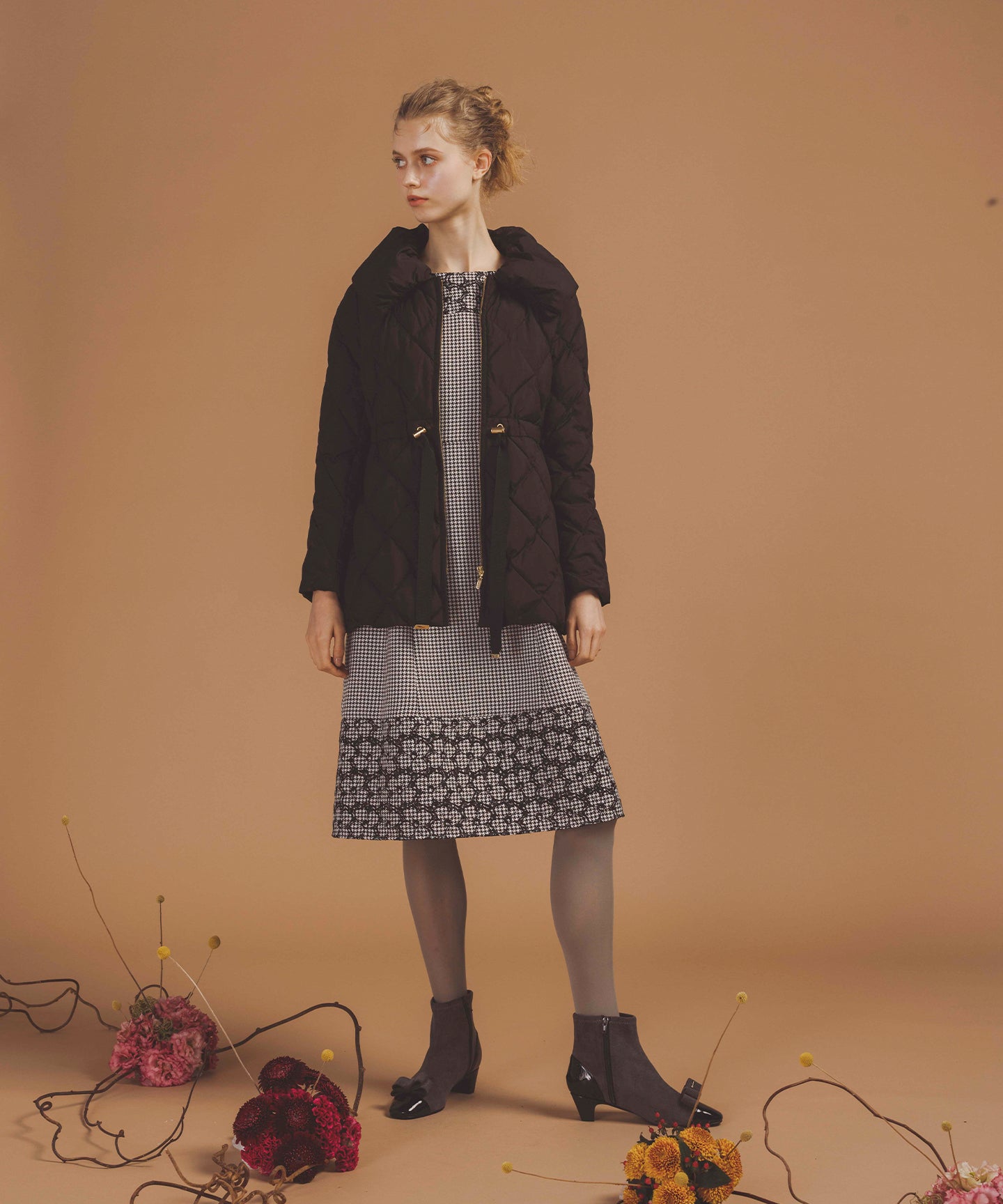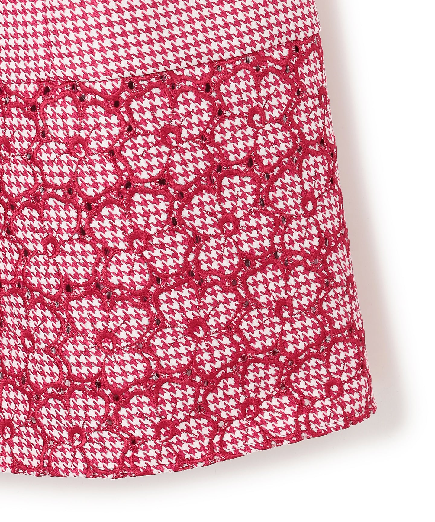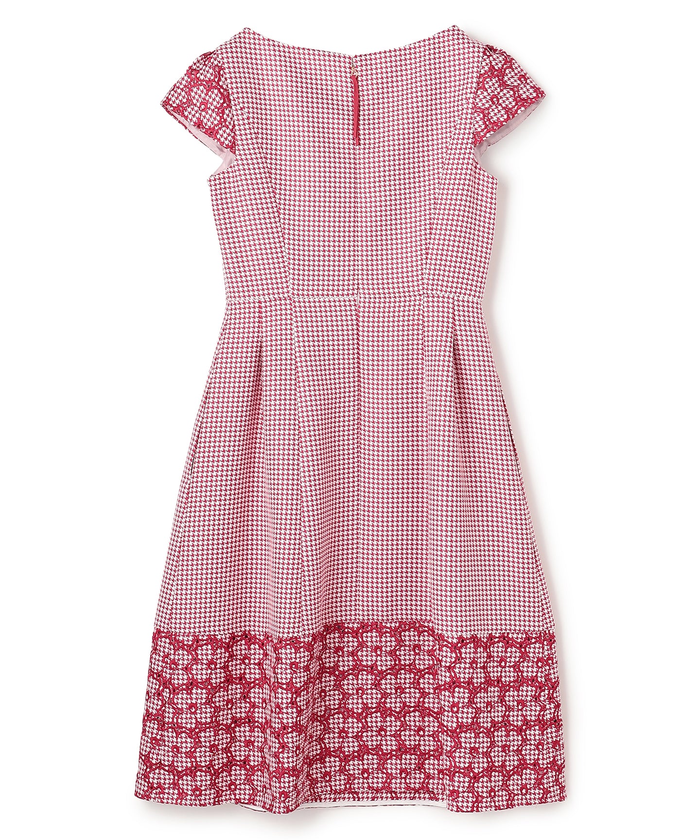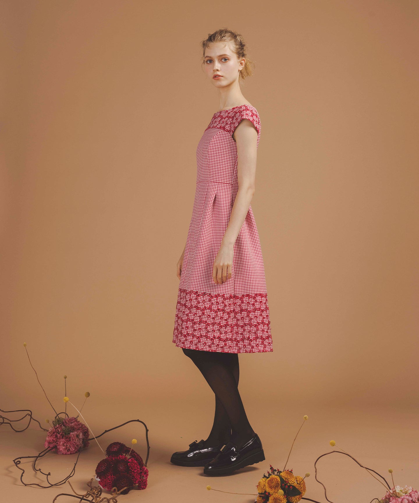 千鳥柄のジャカード生地に刺繍をあしらった、クラシカルで洗練された雰囲気を纏うドレス。 立体感のあるジャカード織りならではの上質な風合いに、丁寧に施された刺繍が華やかなアクセントを添え、ワントーンながらも奥行きのある表情を生み出しています。 刺繍の間にはアイレット(小さな透かし穴)を施し、重たくなりがちな秋冬の素材感に、軽やかで抜け感のある印象をプラス。日常から特別なシーンまで幅広くお召いただけます。