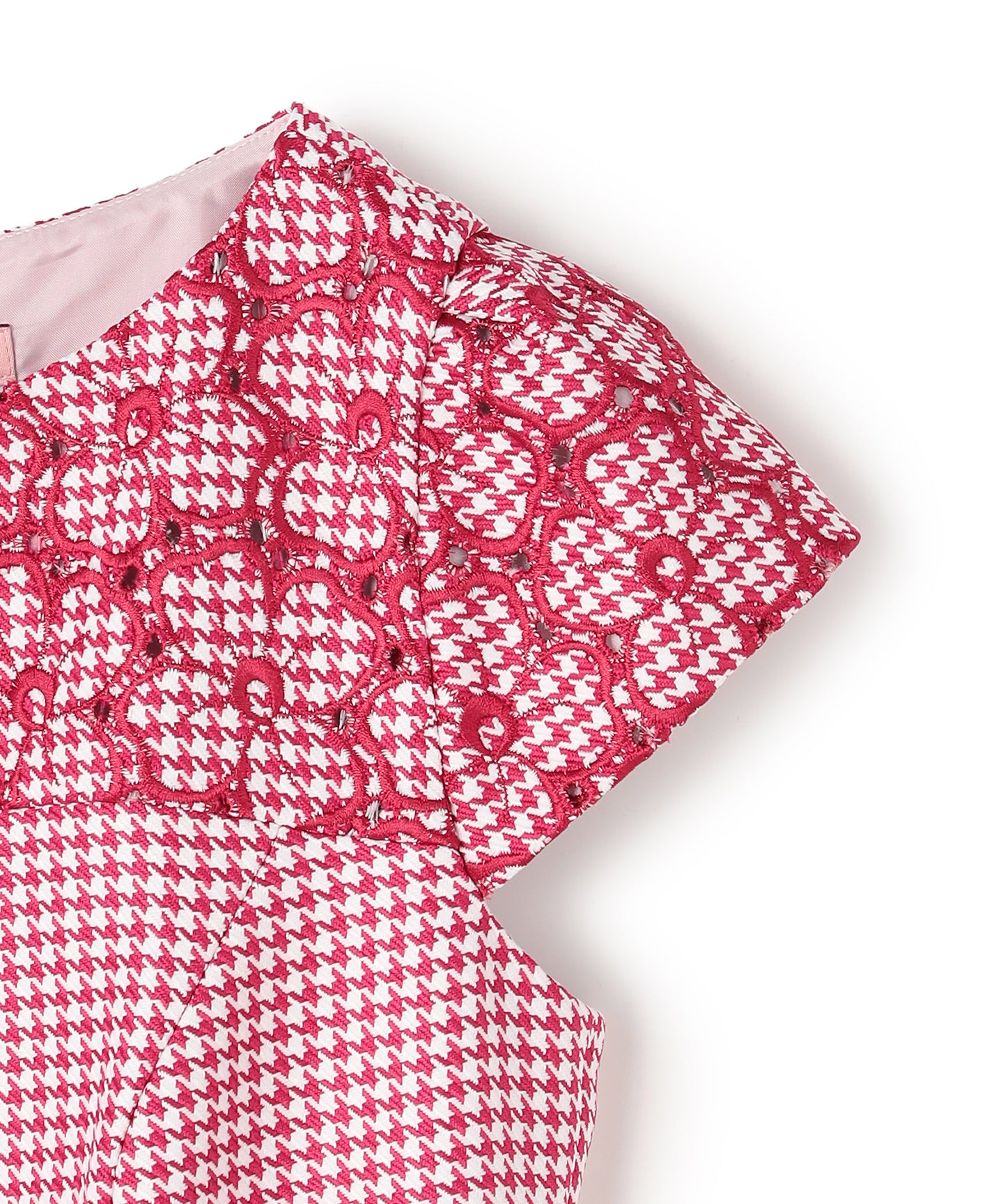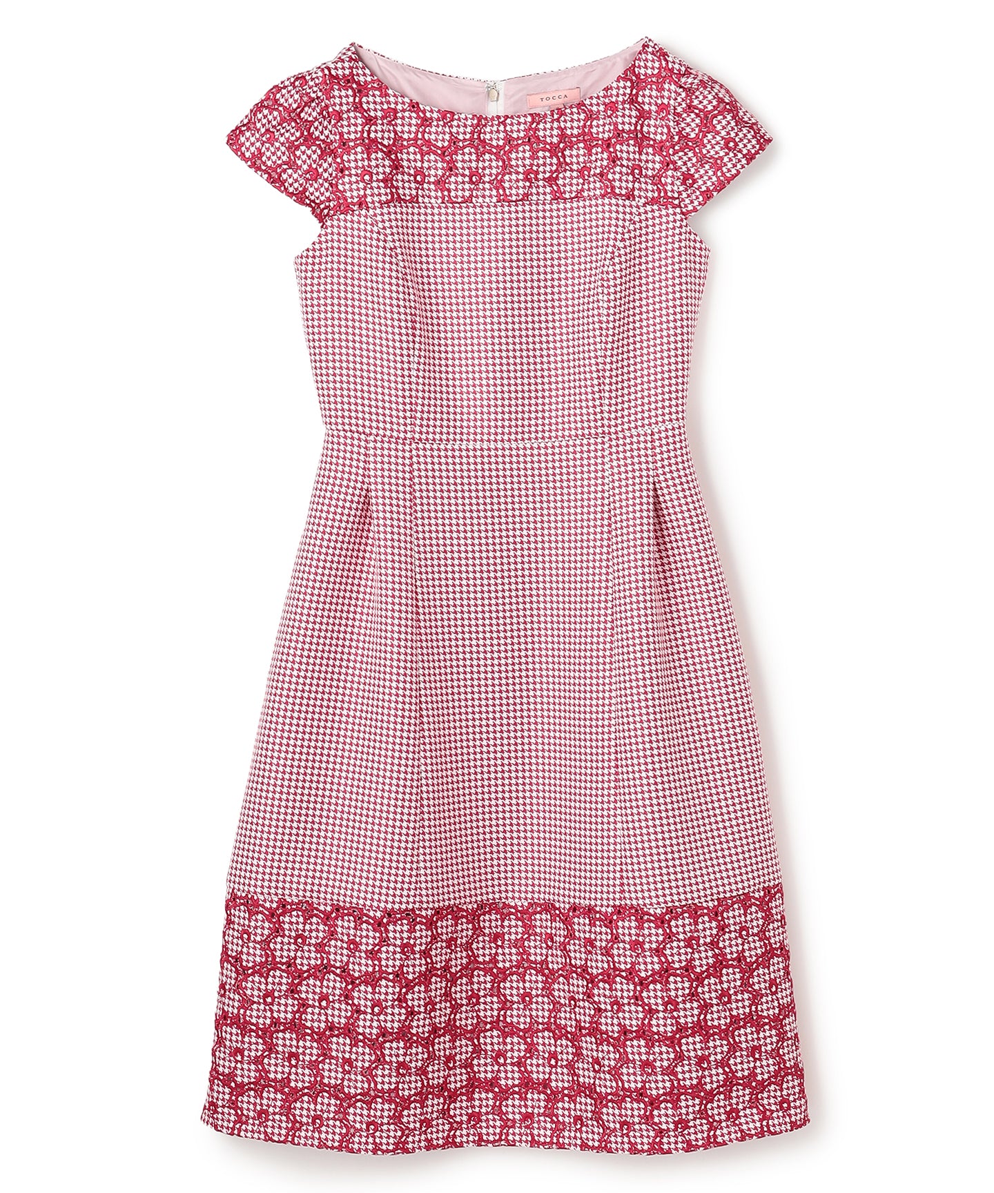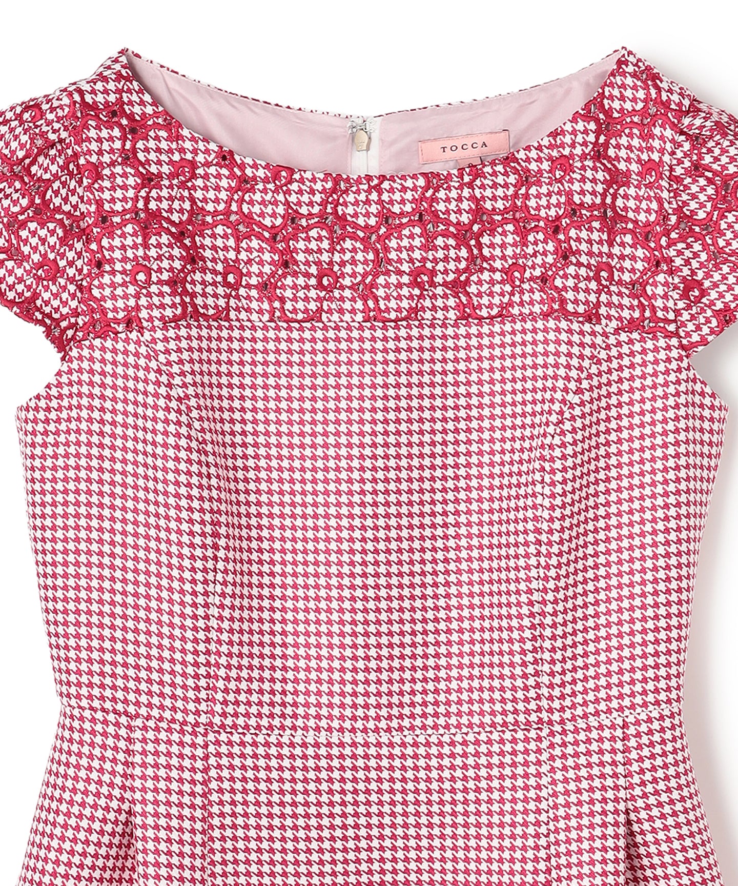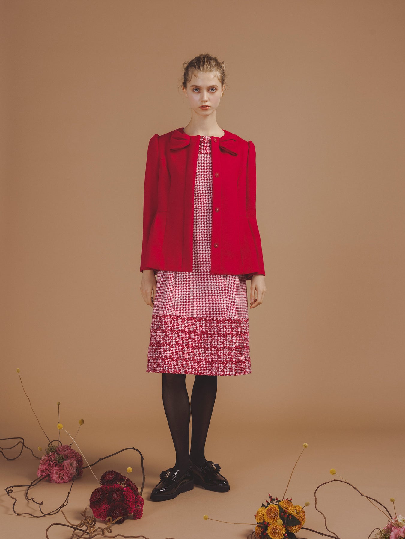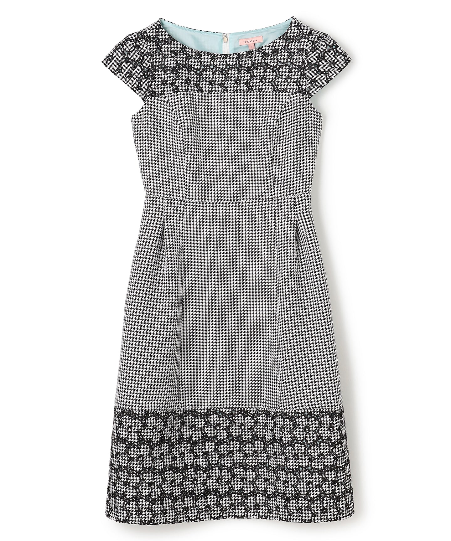 千鳥柄のジャカード生地に刺繍をあしらった、クラシカルで洗練された雰囲気を纏うドレス。 立体感のあるジャカード織りならではの上質な風合いに、丁寧に施された刺繍が華やかなアクセントを添え、ワントーンながらも奥行きのある表情を生み出しています。 刺繍の間にはアイレット(小さな透かし穴)を施し、重たくなりがちな秋冬の素材感に、軽やかで抜け感のある印象をプラス。日常から特別なシーンまで幅広くお召いただけます。