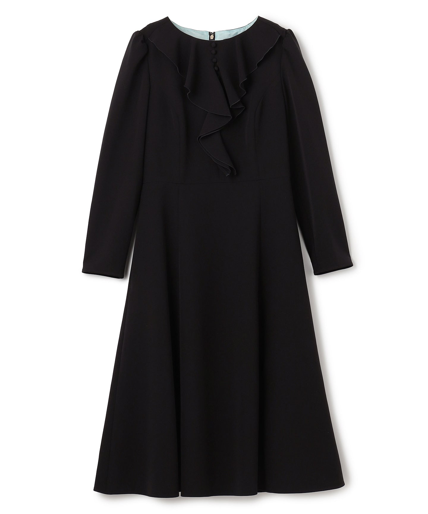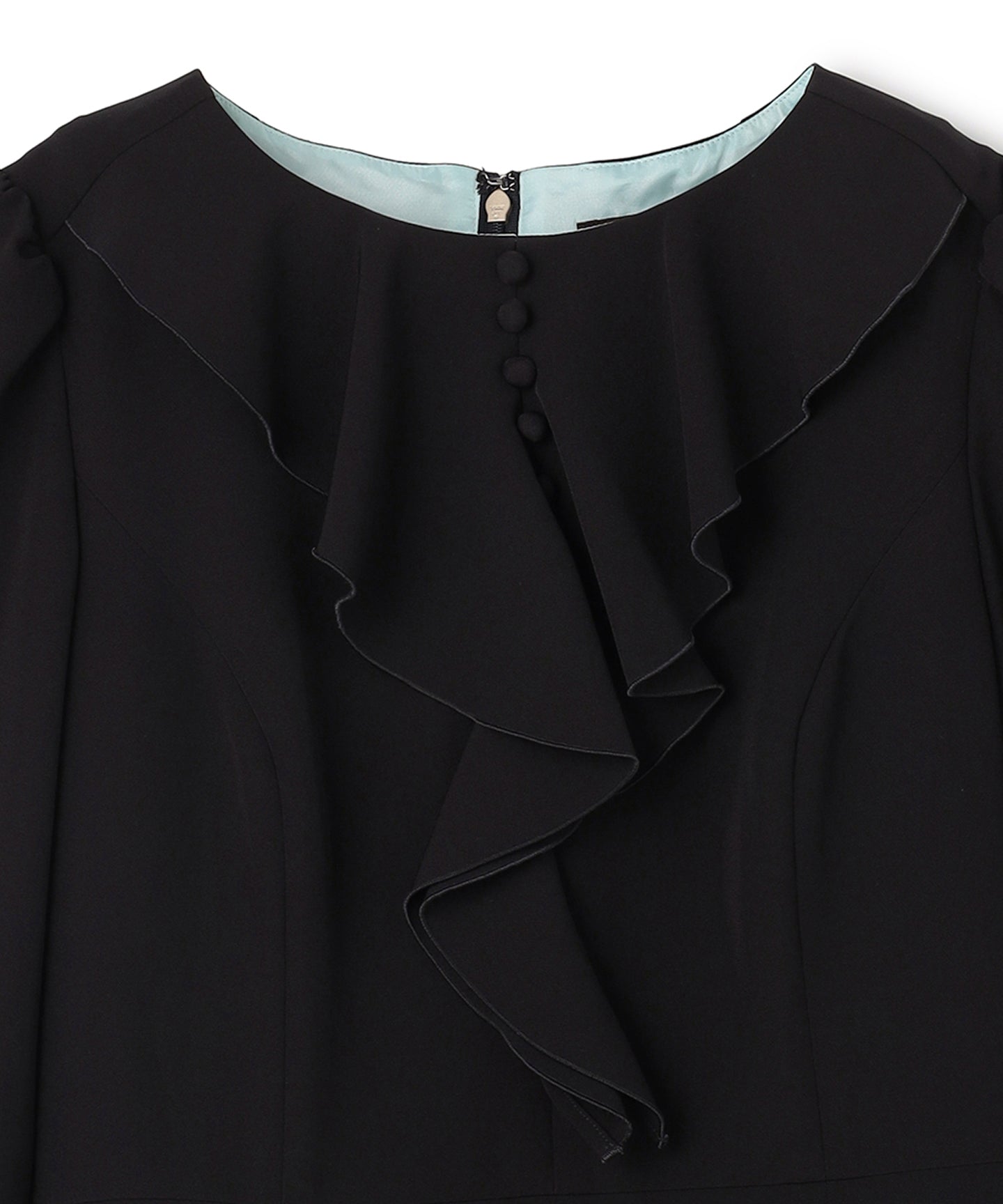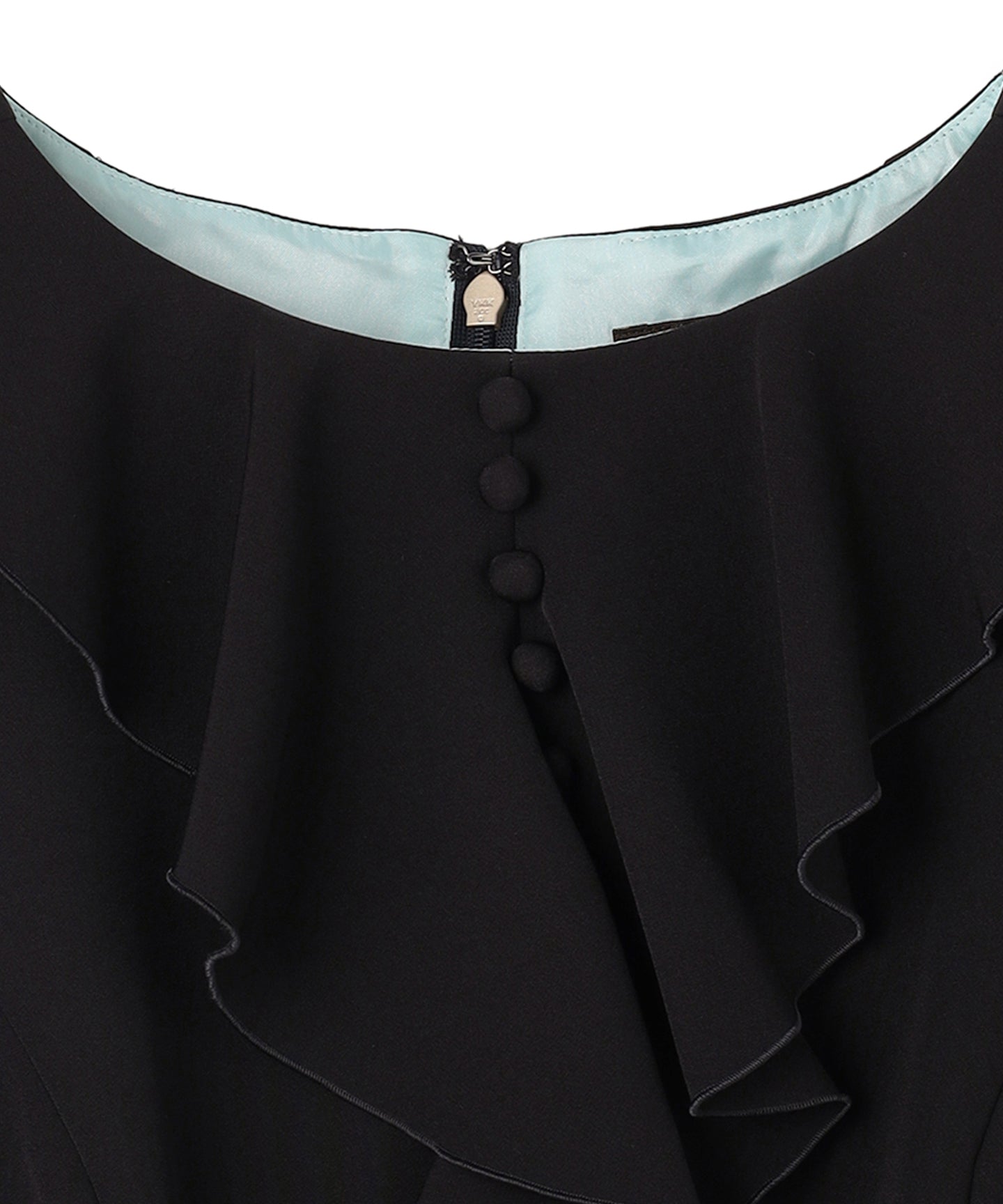 フロントにあしらわれた大胆なフリルが目を引く、華やかでフェミニンな印象のドレス。