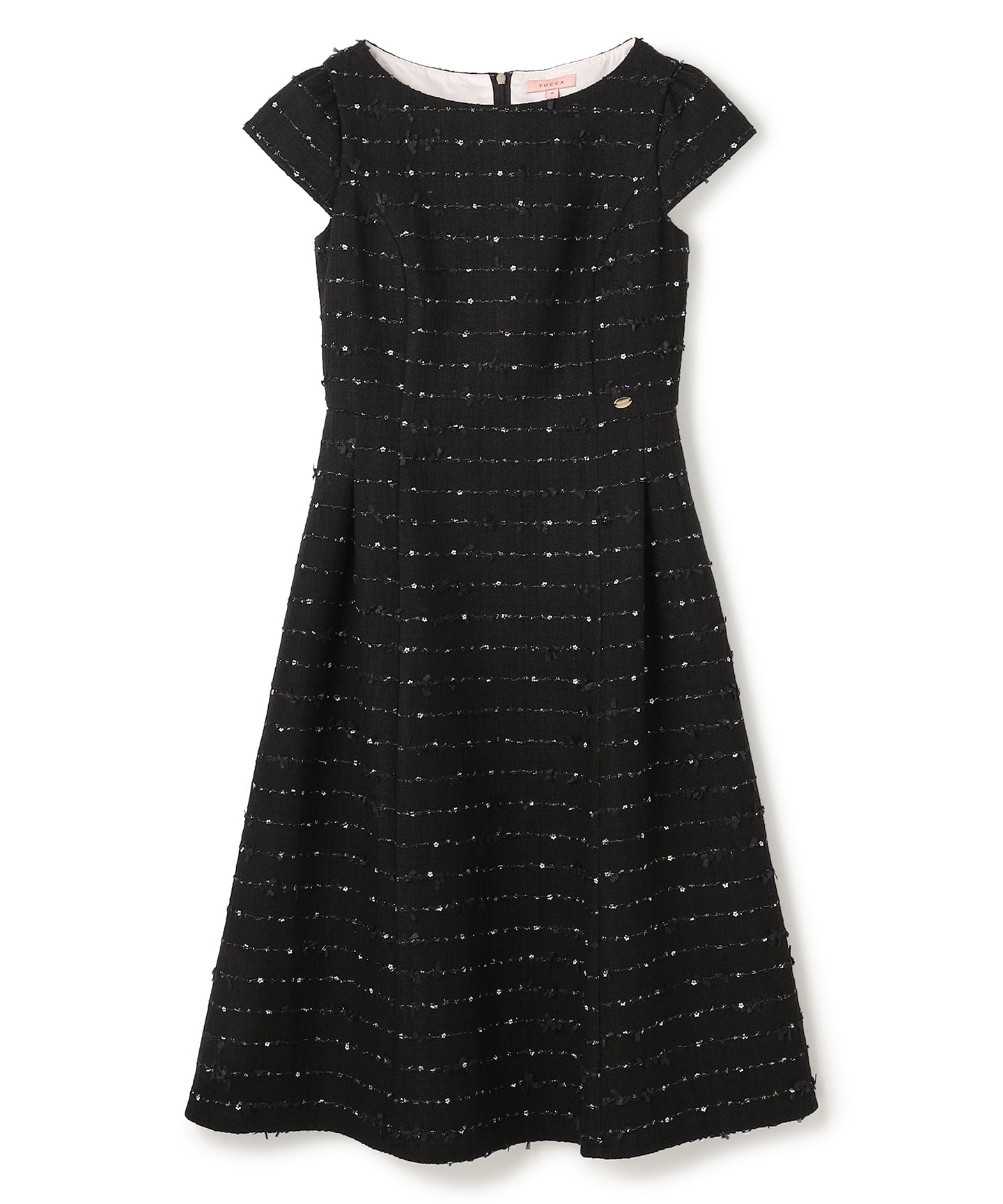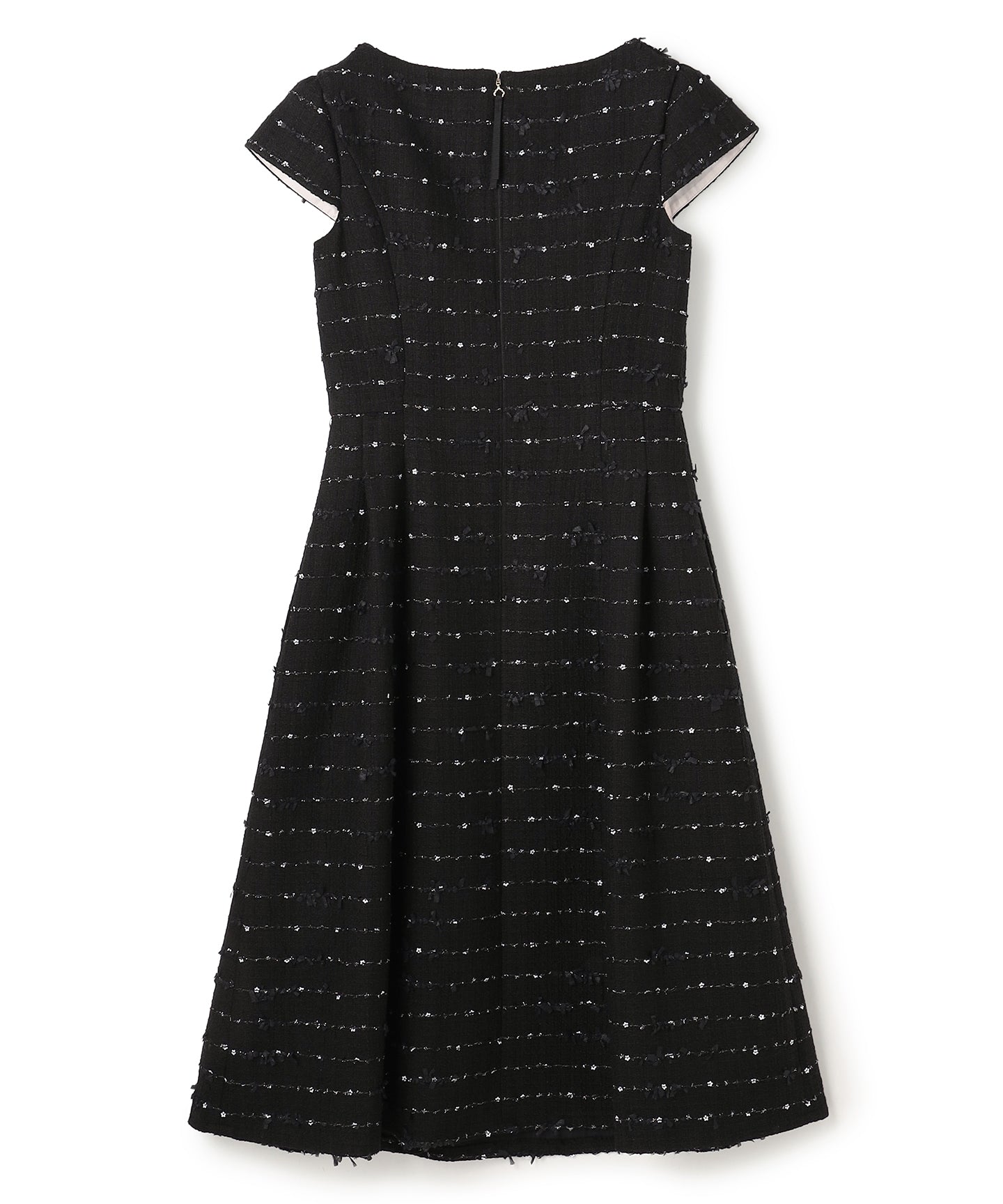 小さな花の形のスパンコールを贅沢に散りばめた、華やかで特別感のあるドレス。 生地全体にきらめくモチーフは、動くたびに光を受けて繊細な表情を生み出し、奥行きと上品な華やぎを添えています。 シルエットは、ウエストをすっきりと引き締めながらも、スカート部分に程よいフレアを持たせたフィット&フレアライン。女性らしい曲線を美しく引き立てつつ、スタイルアップを叶えてくれるデザインです。華やかなシーンにはもちろん、シンプルなアクセサリーと合わせてデイリーにも取り入れやすい、上質で洗練された大人のための一着です。