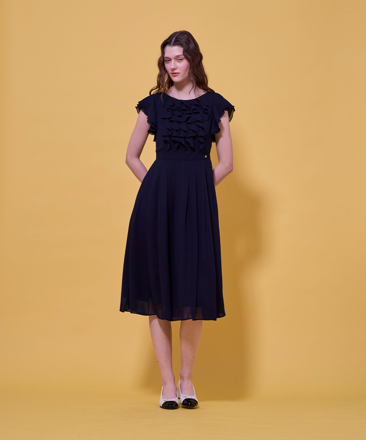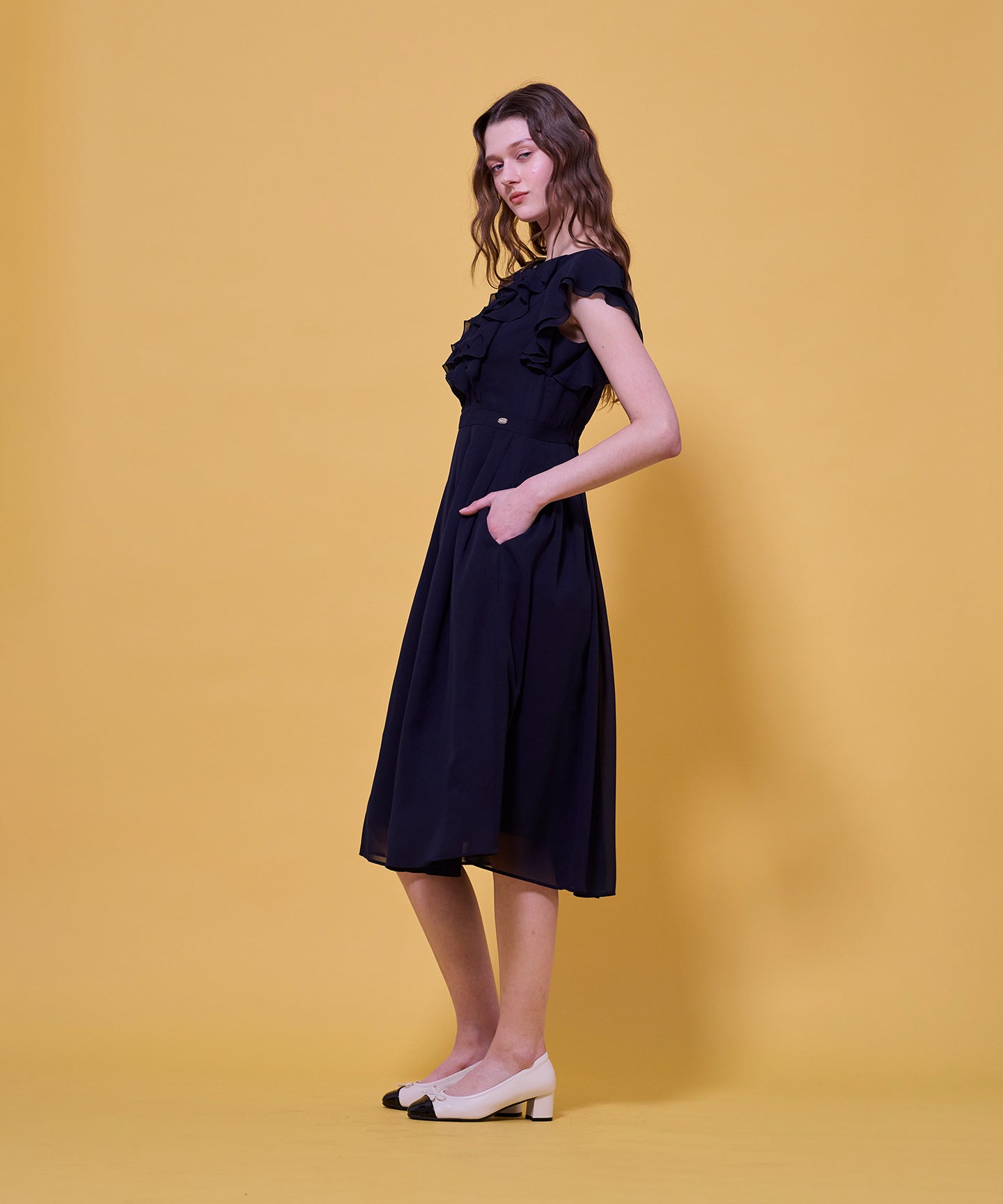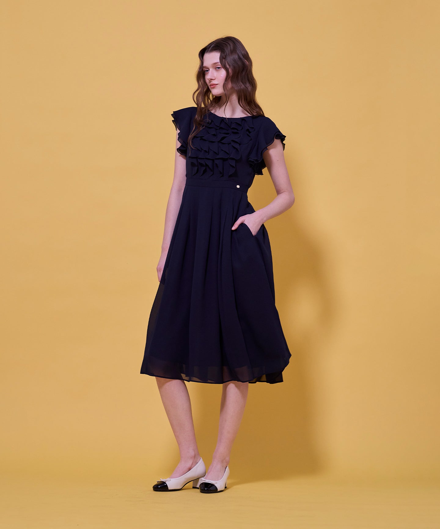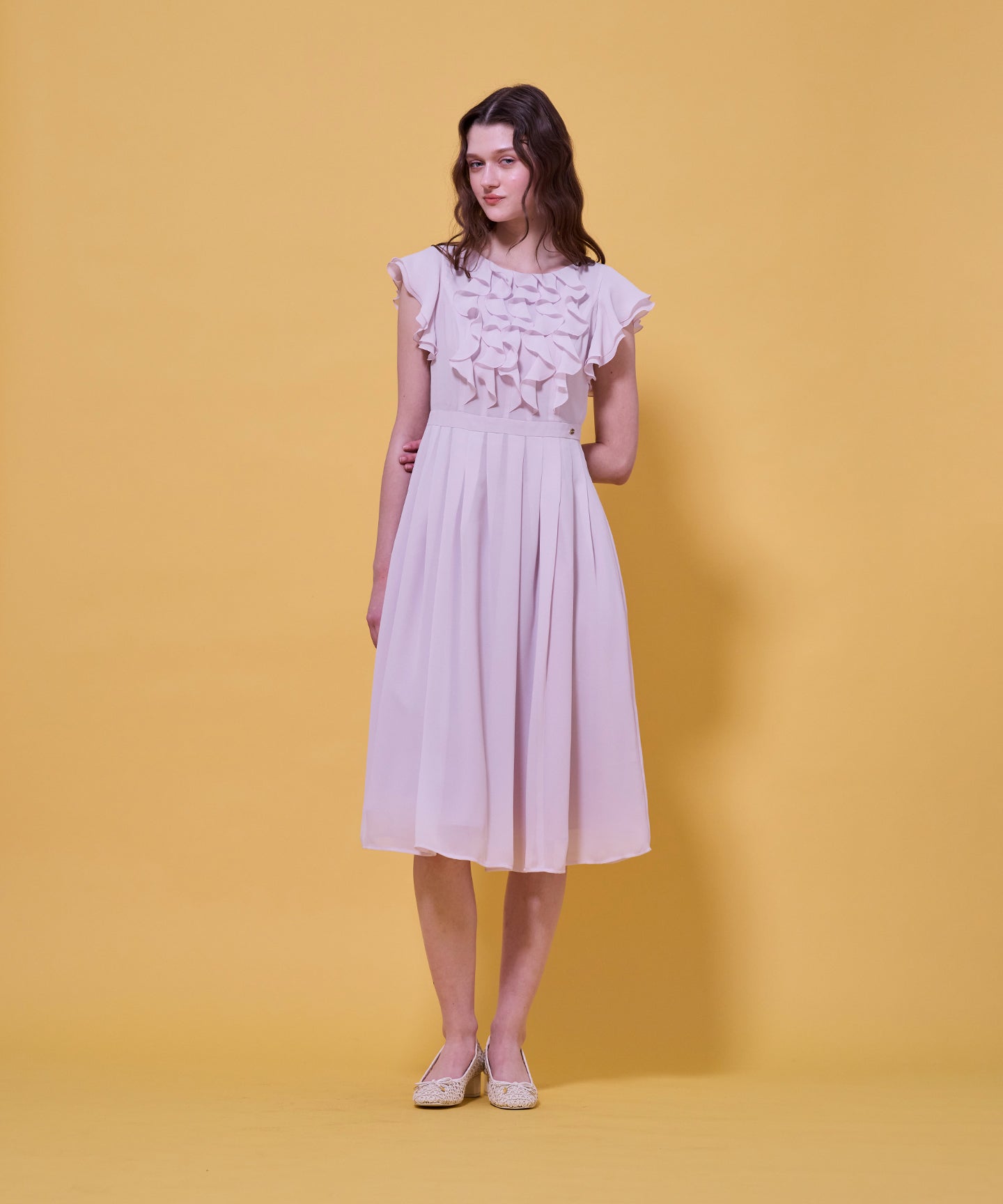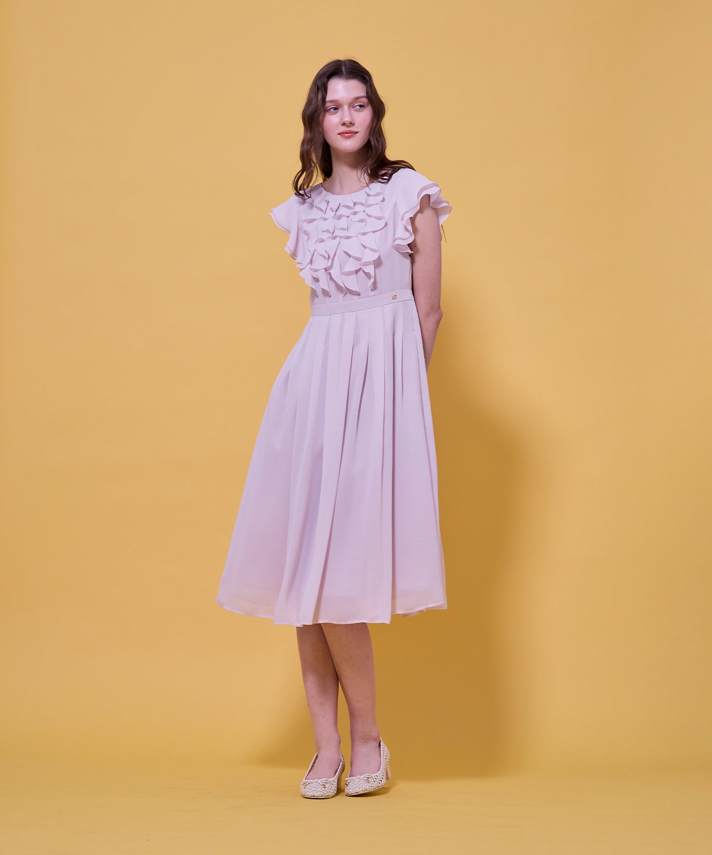 立体的なフリルが印象的な、華やかでフェミニンなドレス。 さらりとした軽やかな風合いと程よい透け感があり、動くたびにふんわりと揺れる上品なシルエットを生み出し、肩から流れるようなフリルスリーブが二の腕をさりげなくカバーしつつ、軽やかで女性らしい雰囲気を演出します。 ウエストはすっきりと切り替えを入れ、スカート部分にはゆったりとしたプリーツを施すことで、美しいドレープと動きを楽しめるデザインに。 特別なお出かけや華やかなシーンにぴったりなドレスです。