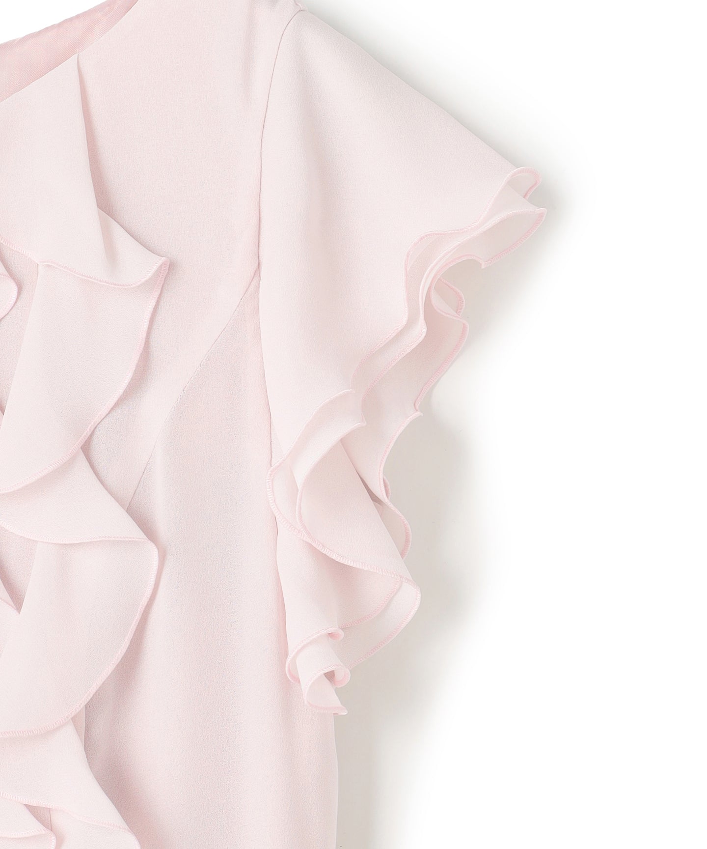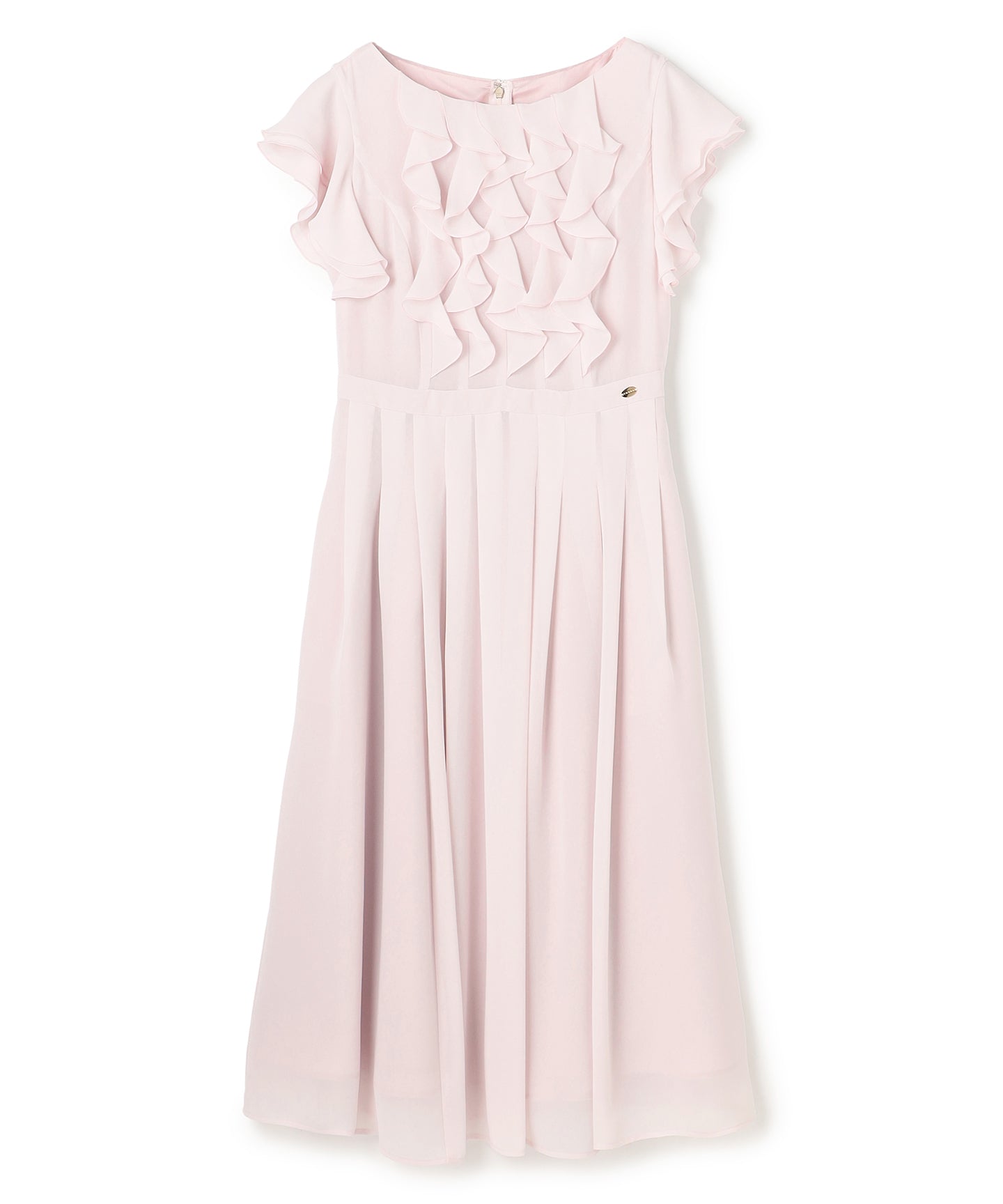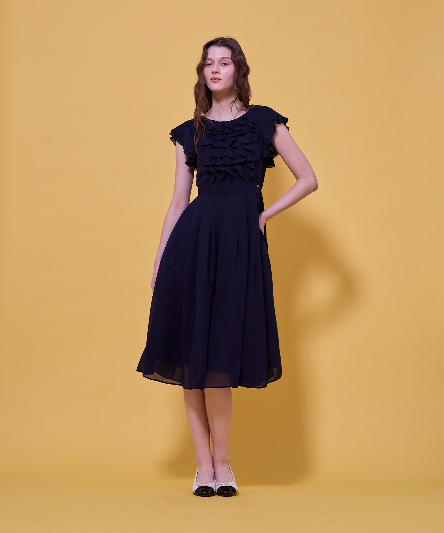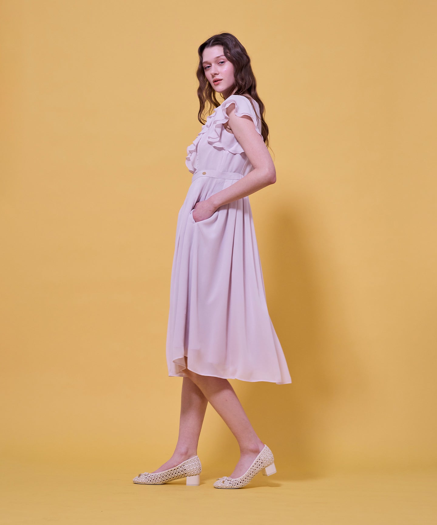 立体的なフリルが印象的な、華やかでフェミニンなドレス。 さらりとした軽やかな風合いと程よい透け感があり、動くたびにふんわりと揺れる上品なシルエットを生み出し、肩から流れるようなフリルスリーブが二の腕をさりげなくカバーしつつ、軽やかで女性らしい雰囲気を演出します。 ウエストはすっきりと切り替えを入れ、スカート部分にはゆったりとしたプリーツを施すことで、美しいドレープと動きを楽しめるデザインに。 特別なお出かけや華やかなシーンにぴったりなドレスです。