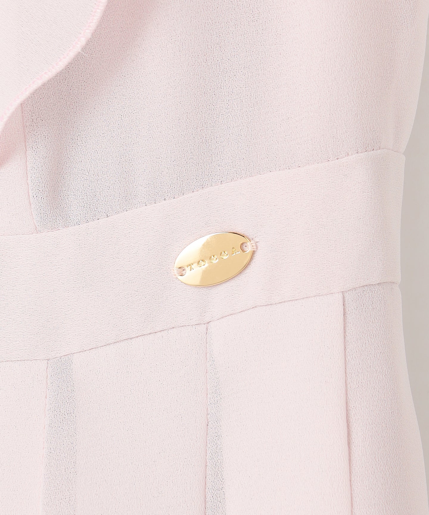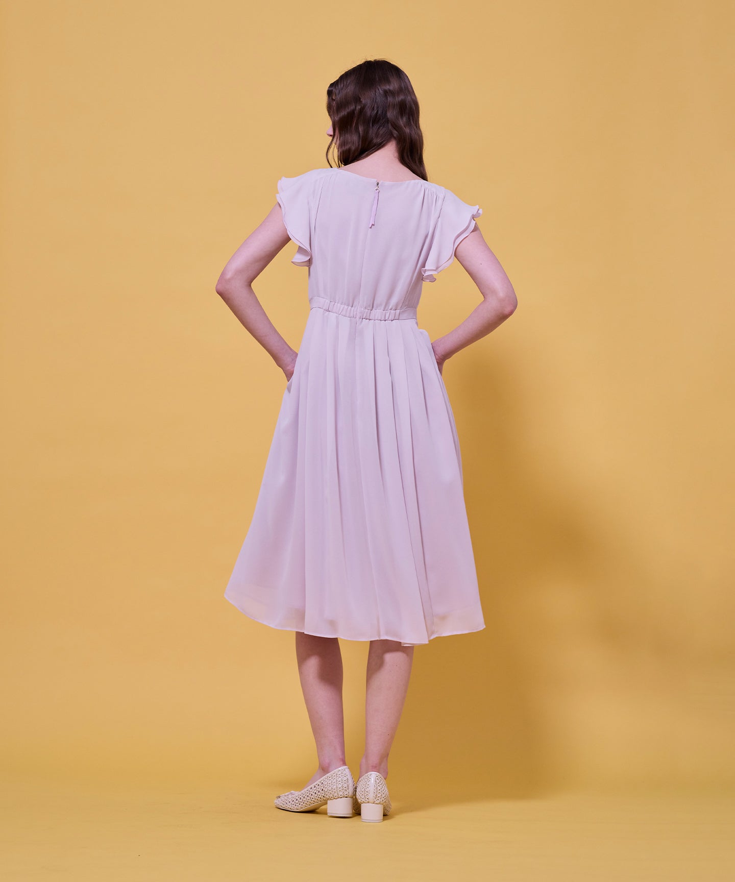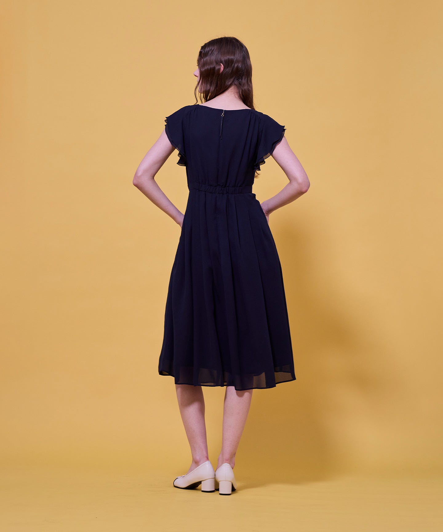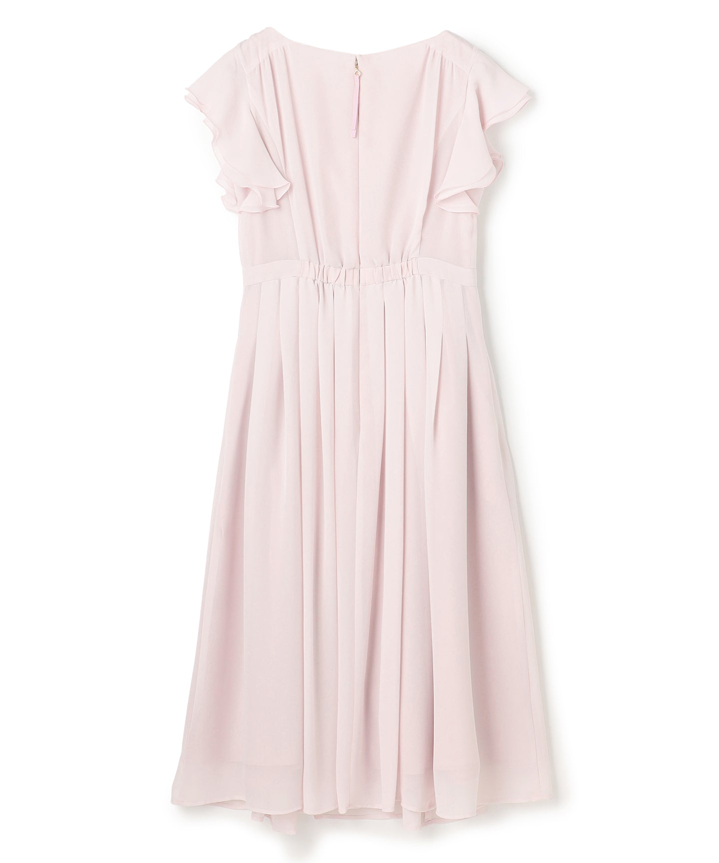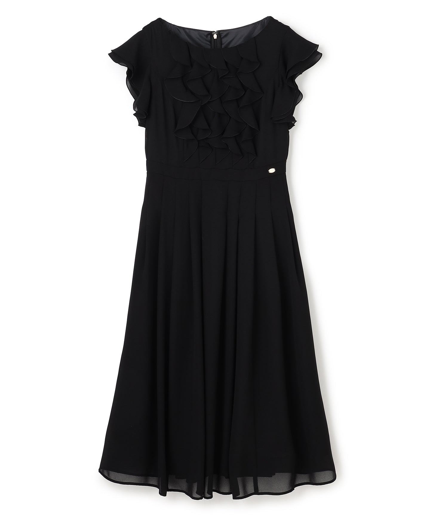 立体的なフリルが印象的な、華やかでフェミニンなドレス。 さらりとした軽やかな風合いと程よい透け感があり、動くたびにふんわりと揺れる上品なシルエットを生み出し、肩から流れるようなフリルスリーブが二の腕をさりげなくカバーしつつ、軽やかで女性らしい雰囲気を演出します。 ウエストはすっきりと切り替えを入れ、スカート部分にはゆったりとしたプリーツを施すことで、美しいドレープと動きを楽しめるデザインに。 特別なお出かけや華やかなシーンにぴったりなドレスです。