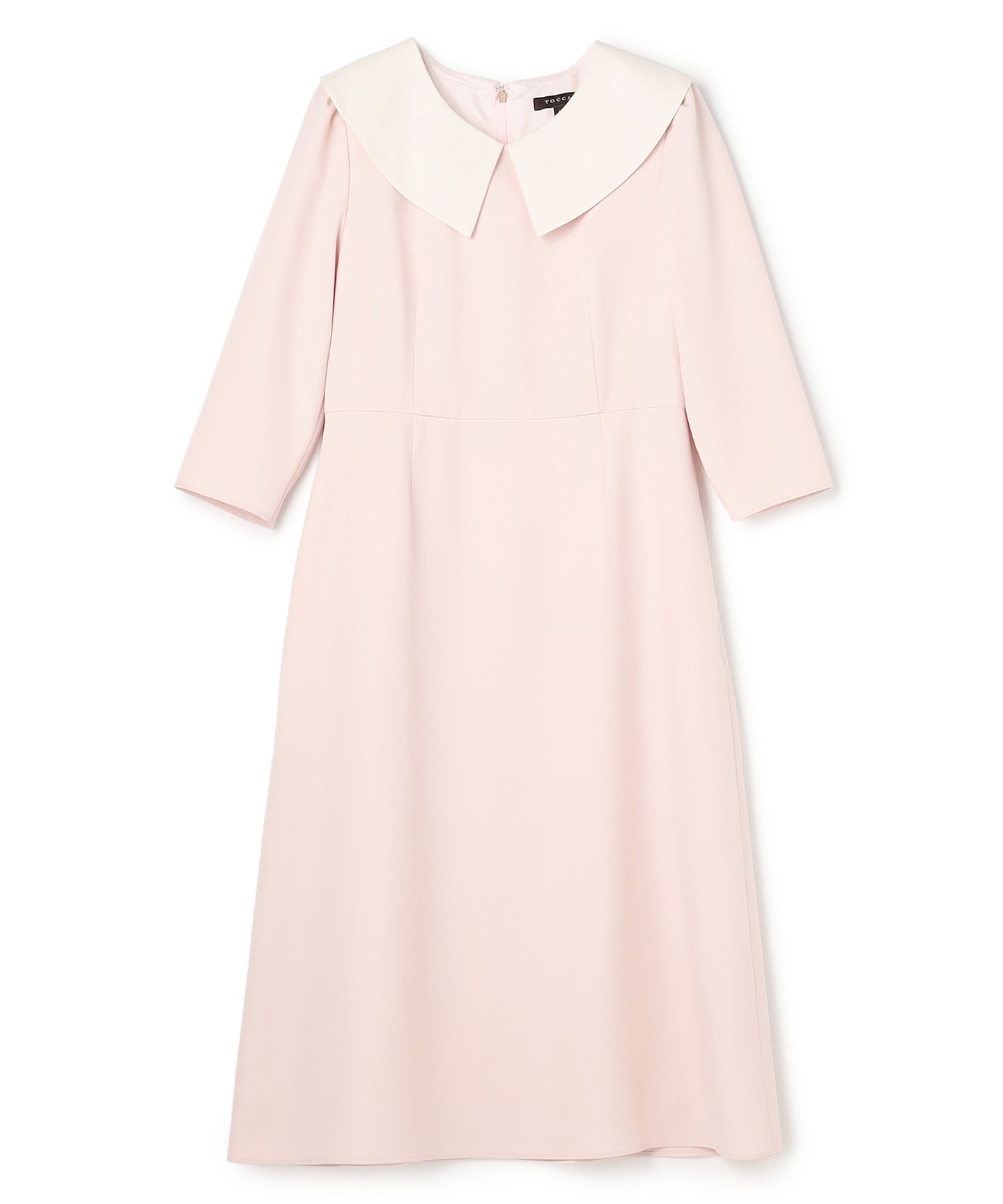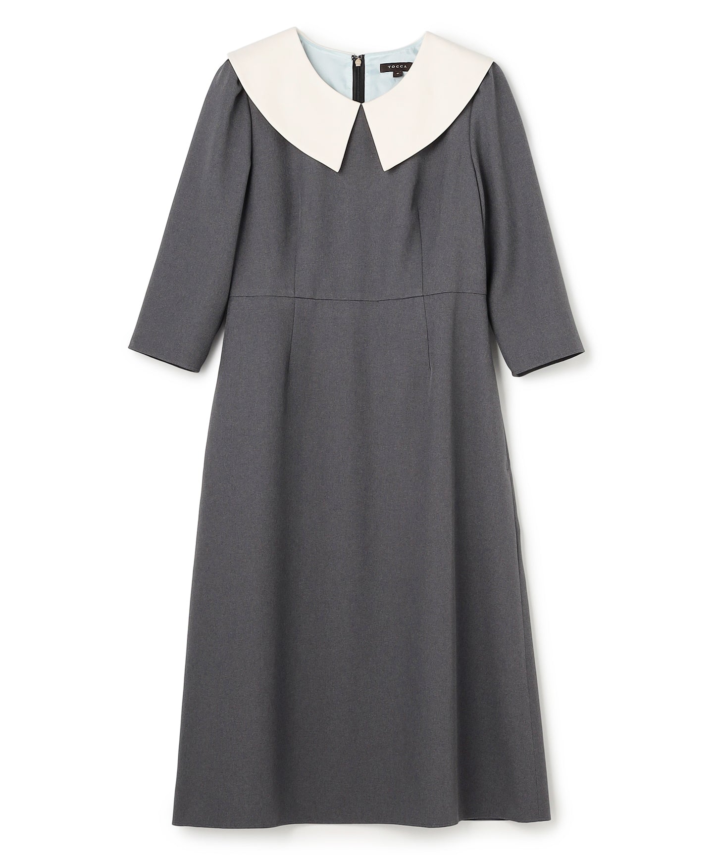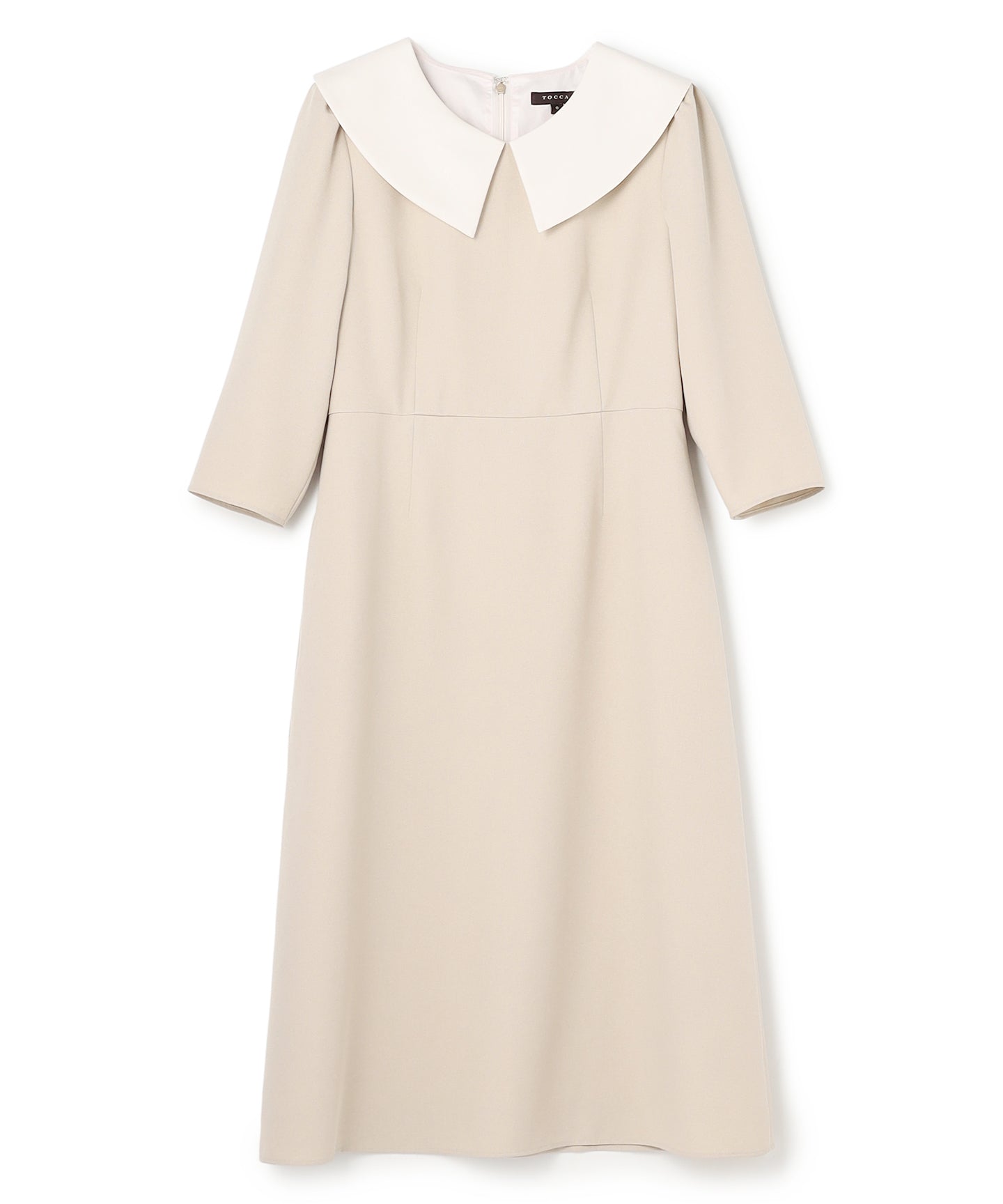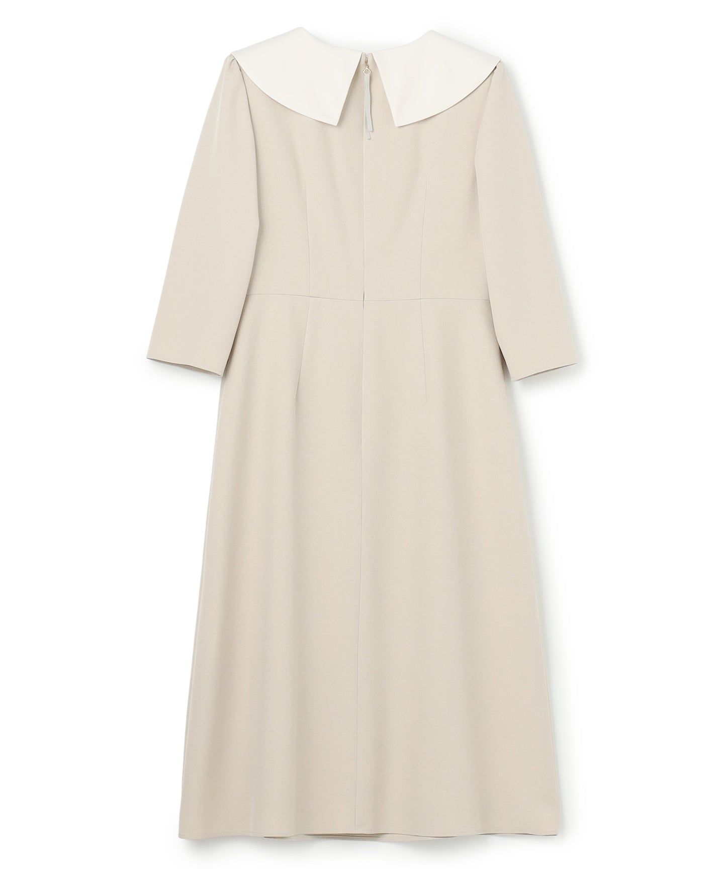 大きな配色の襟がポイントのドレス。きちんと感あるシンプルなスタイルに、フェミニンな雰囲気をプラスしてくれます。 麻のようなナチュラル感がありながら、お手入れもしやすい機能的な合繊素材を使用。