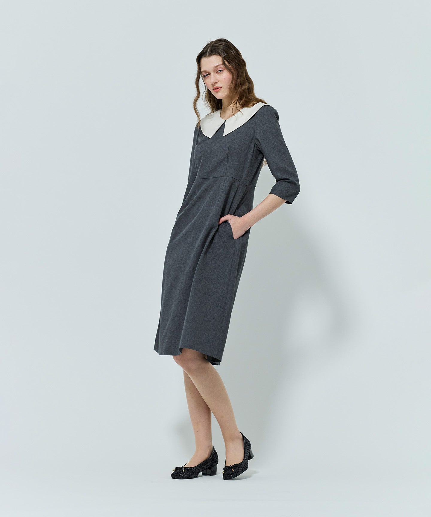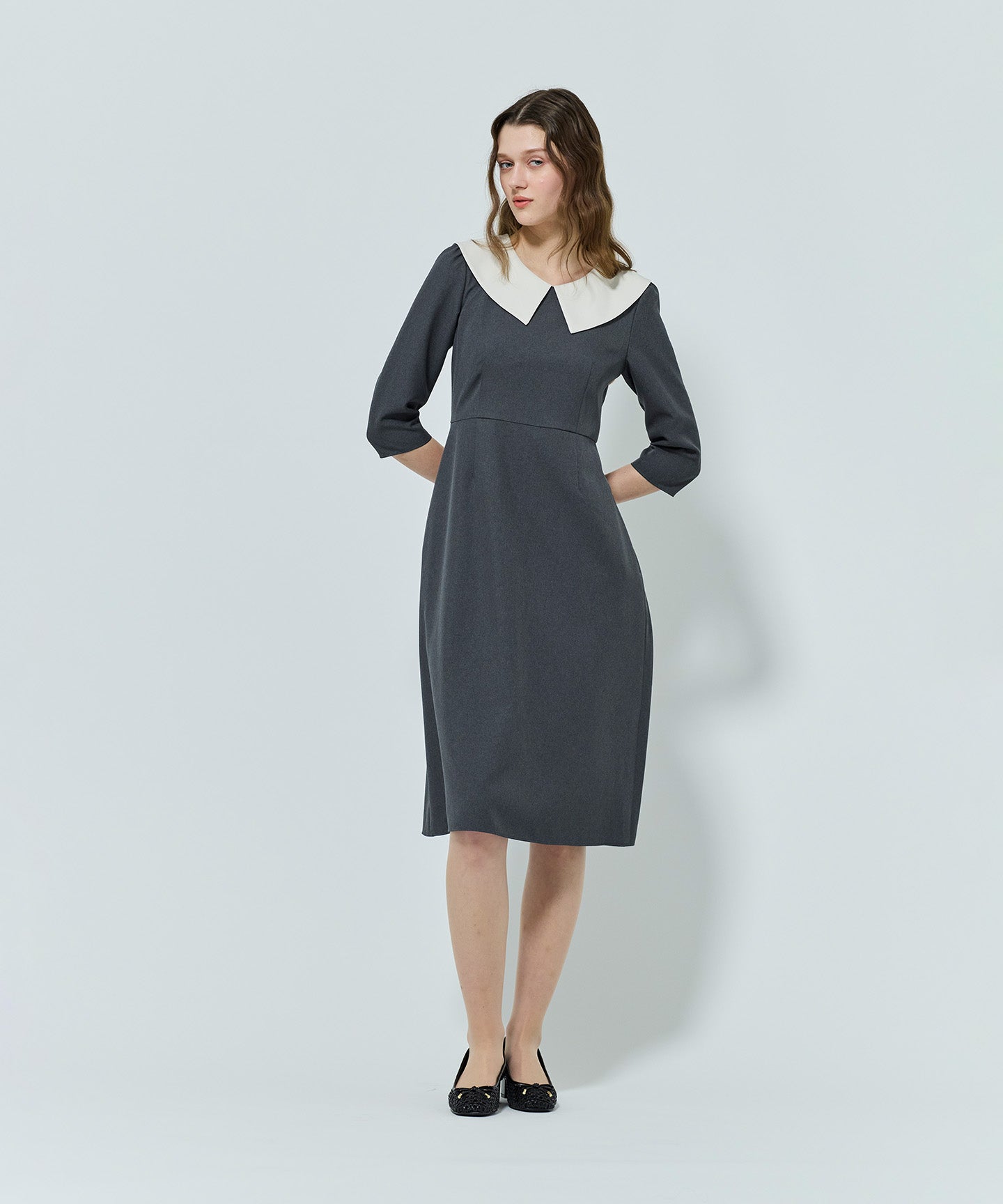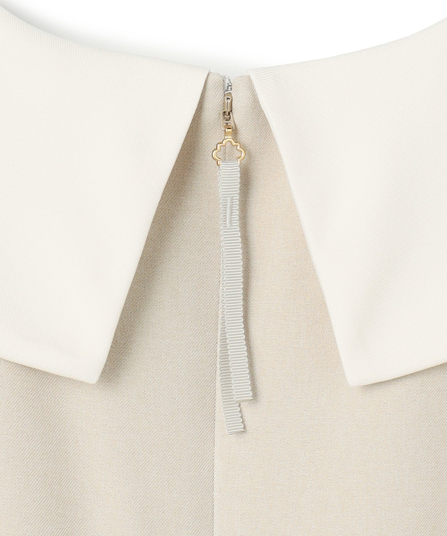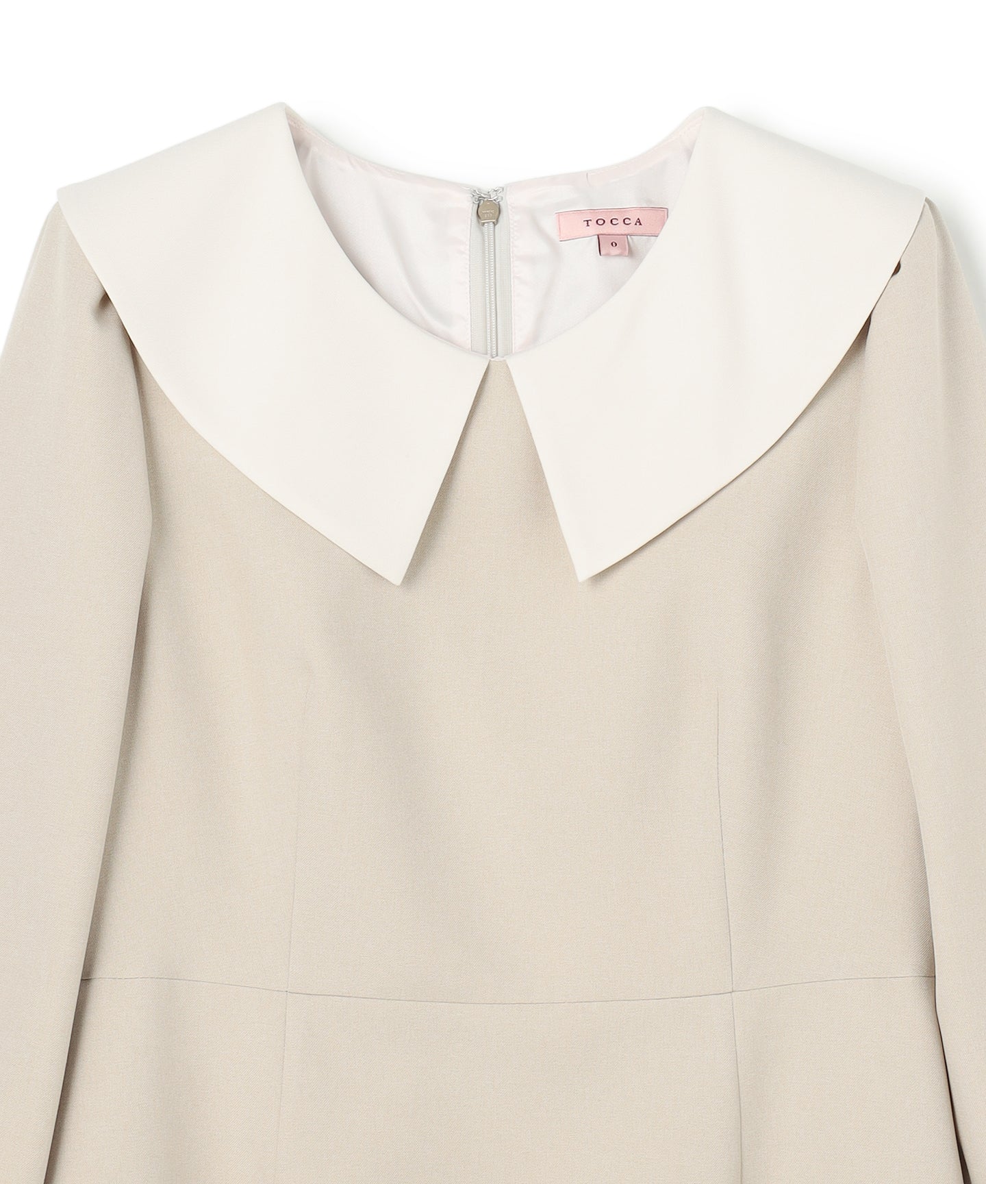 大きな配色の襟がポイントのドレス。きちんと感あるシンプルなスタイルに、フェミニンな雰囲気をプラスしてくれます。 麻のようなナチュラル感がありながら、お手入れもしやすい機能的な合繊素材を使用。