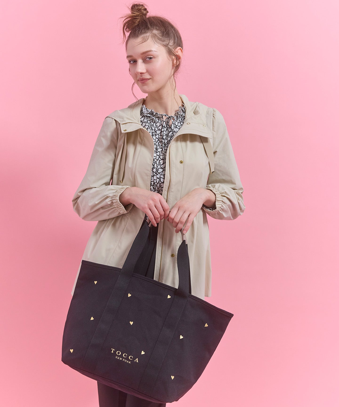 ボディーのフロント全体にハートモチーフをリズミカルにあしらったたっぷりサイズのキャンバストート。