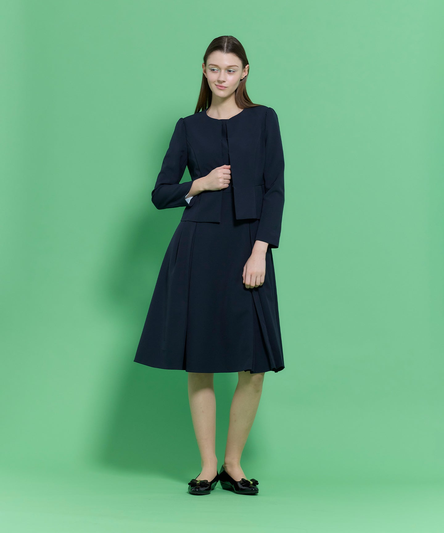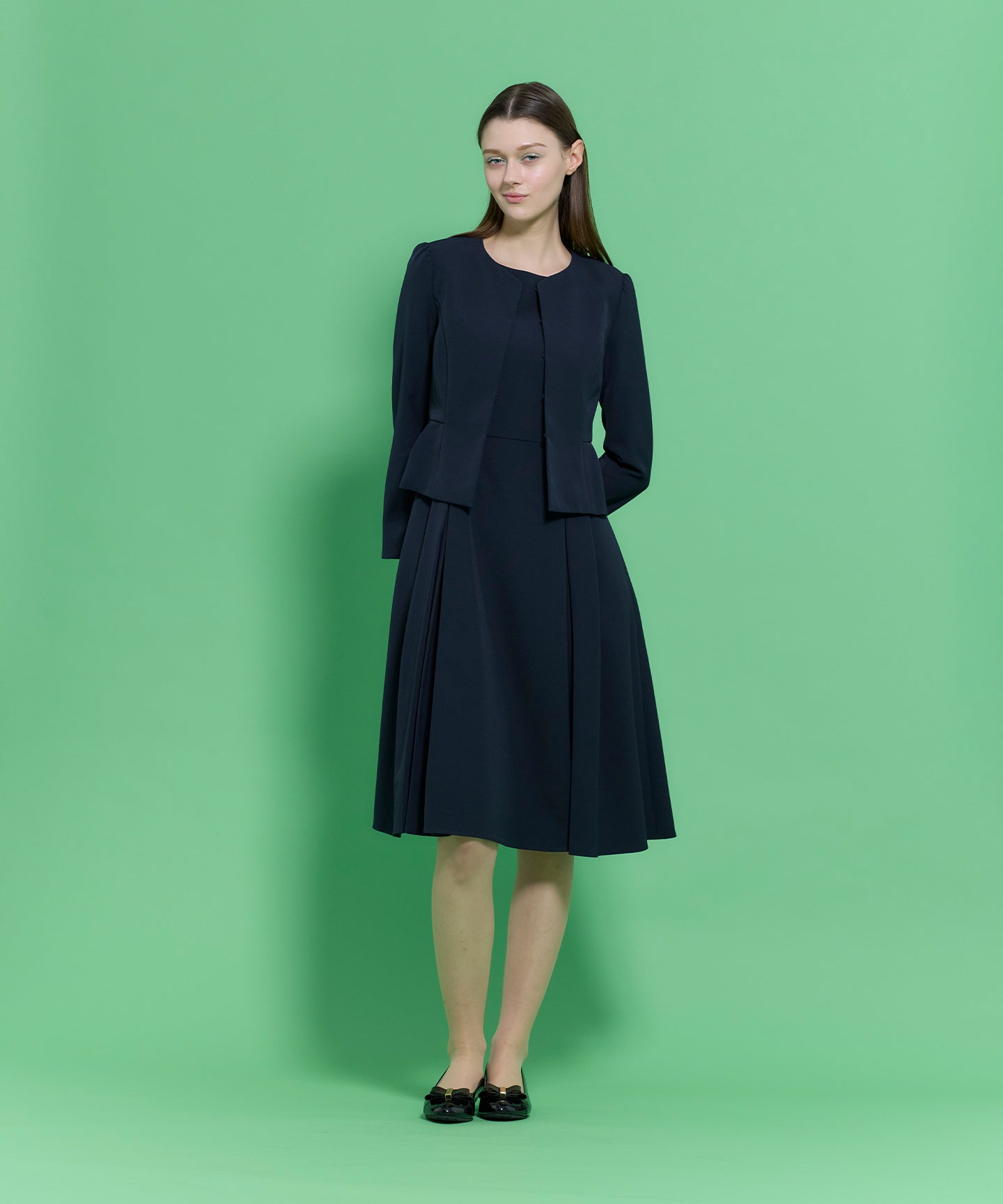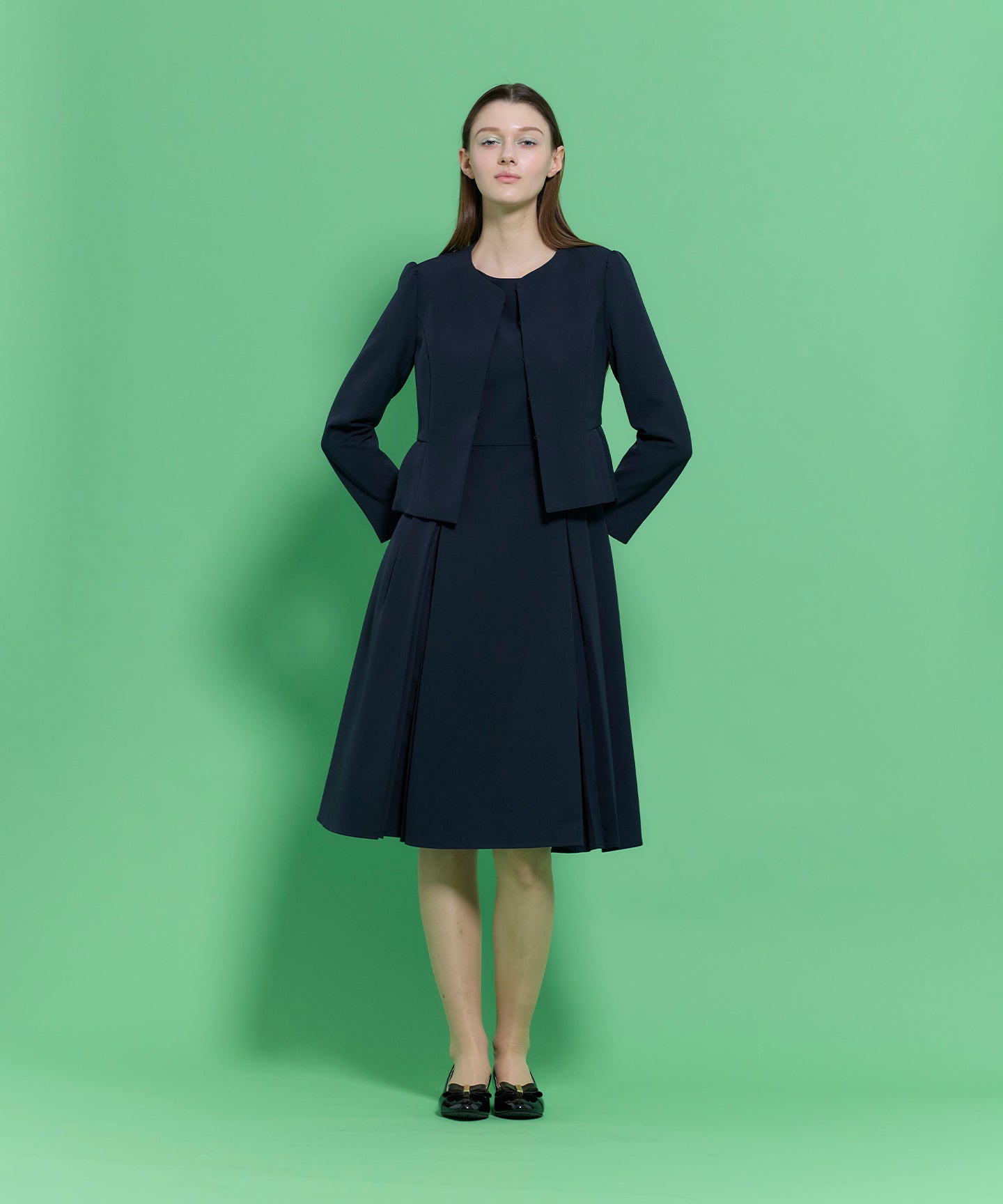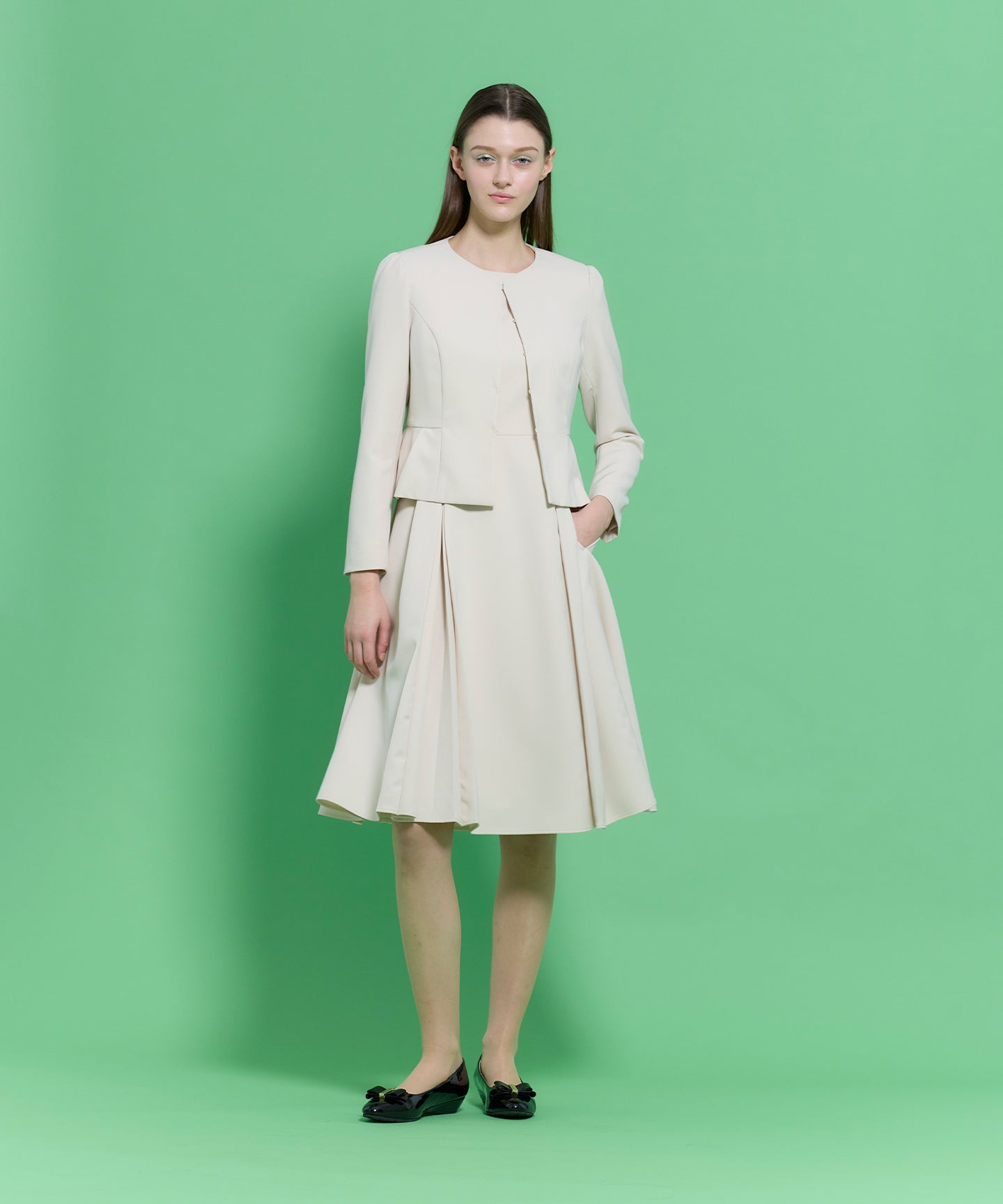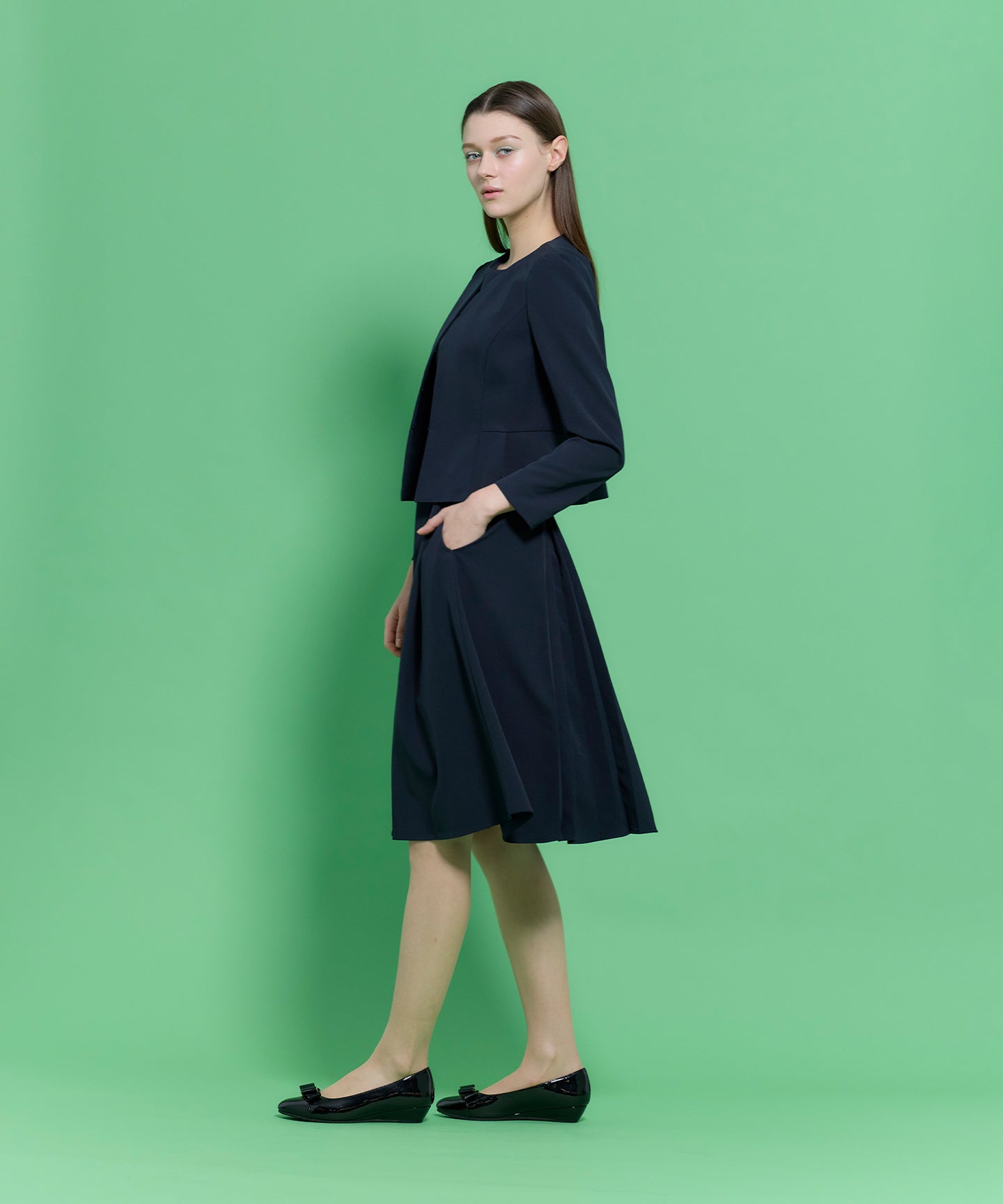ドレスと同素材のジャケットは、一見きちんとした佇まいながら、実はとても軽く柔らかい着心地で、堅苦しさを感じさせないストレスフリーな仕上がり。 身体に沿いすぎない程よいシェイプラインで、女性らしいシルエットを演出しながら動きやすさもあります。