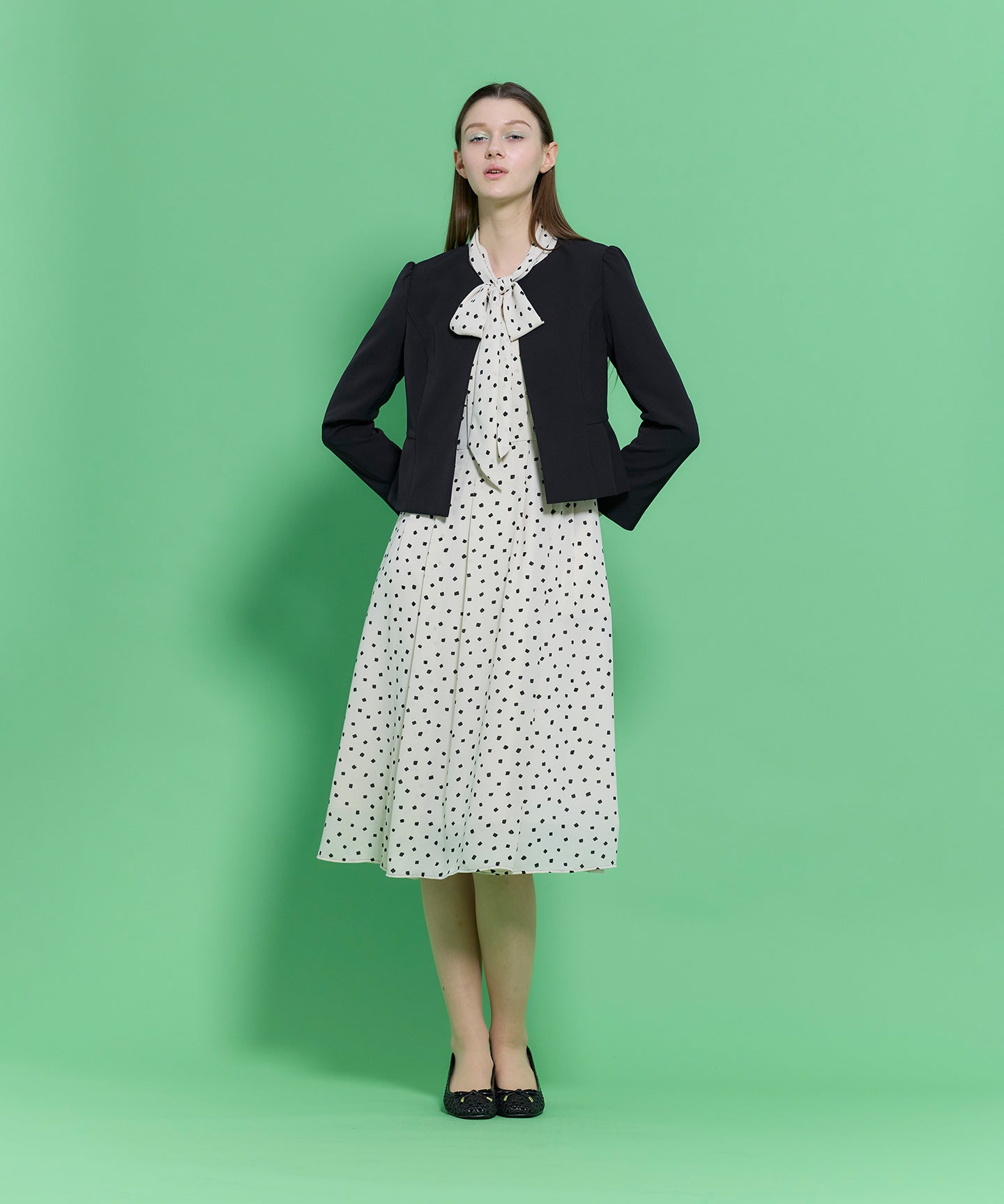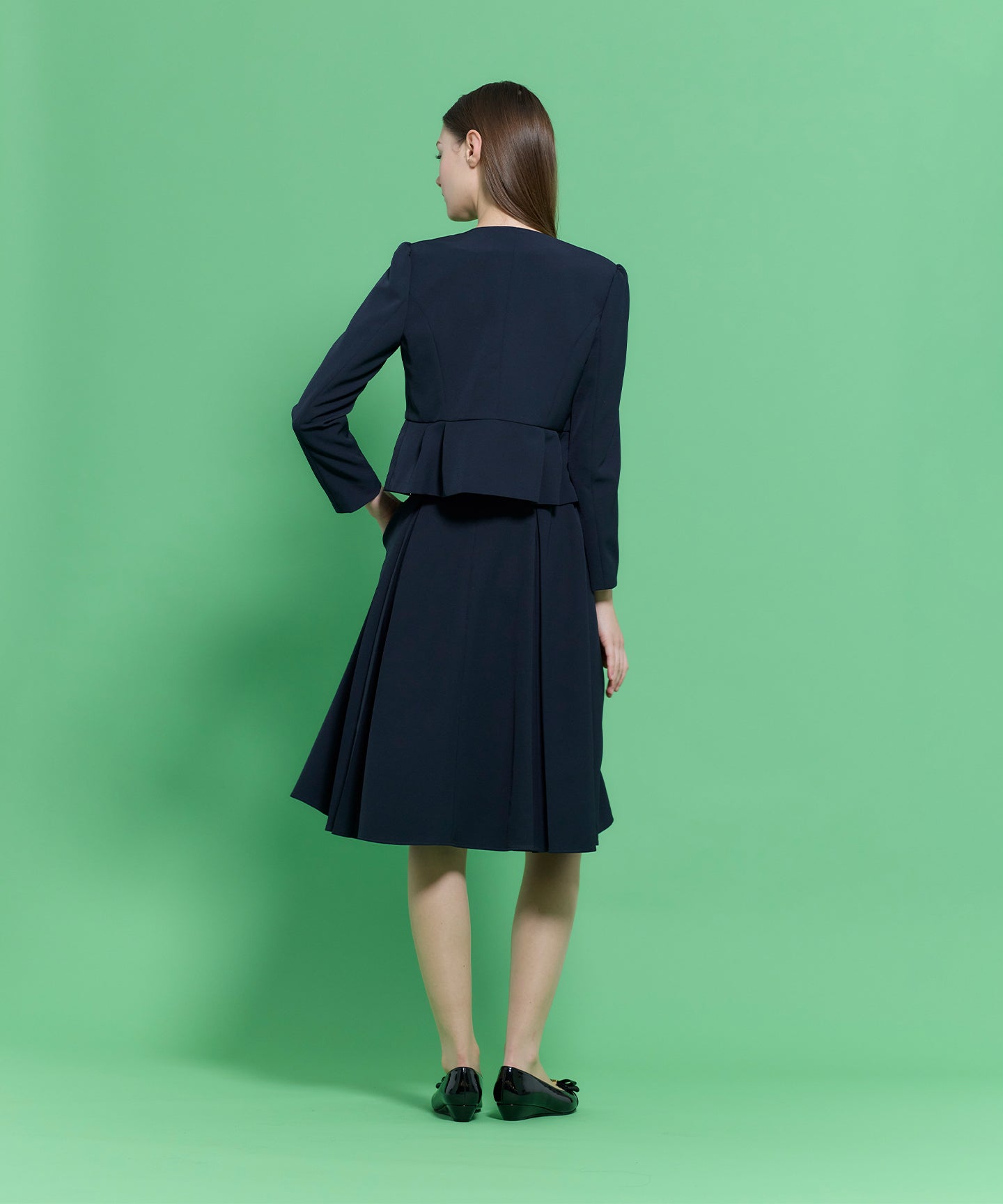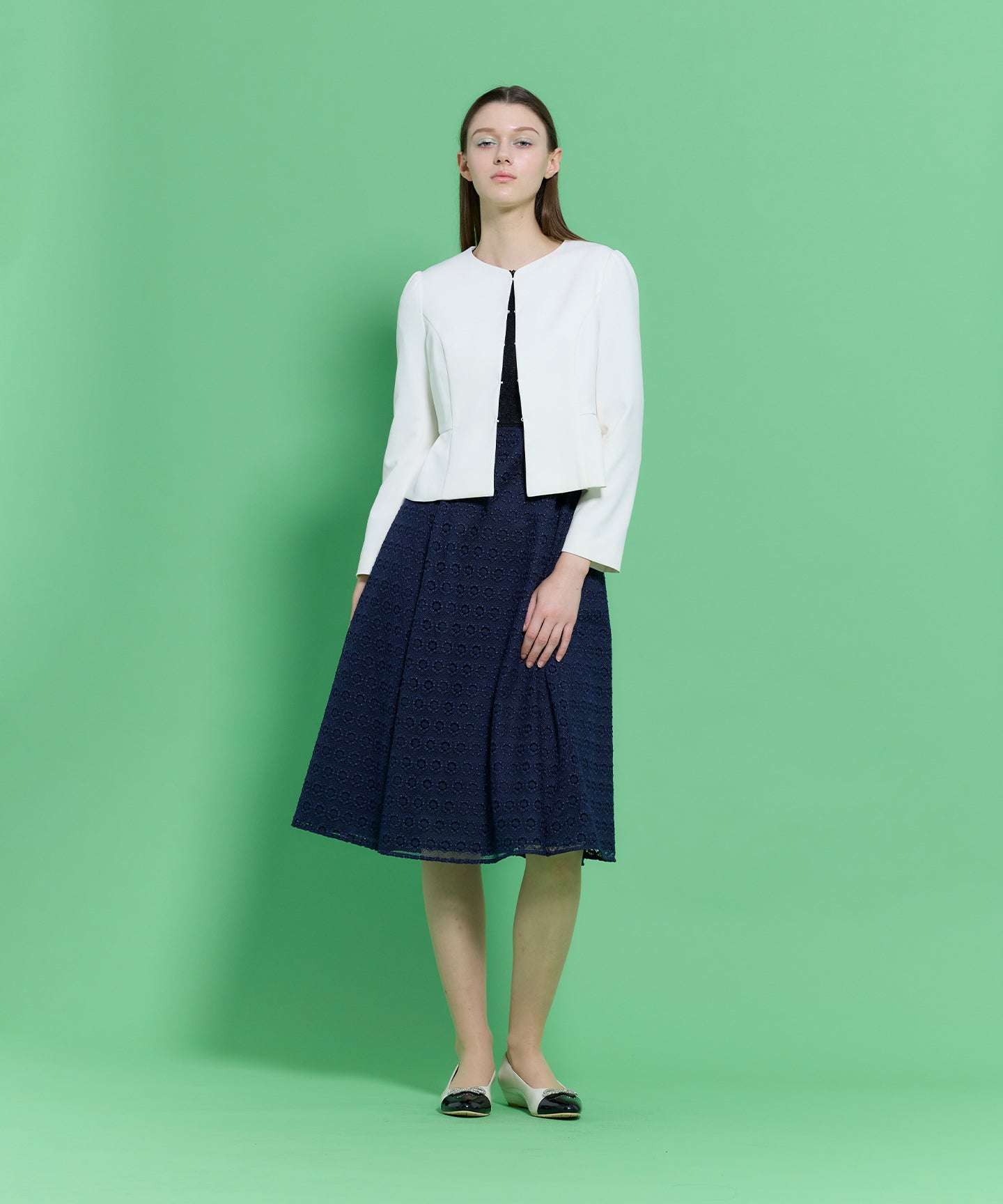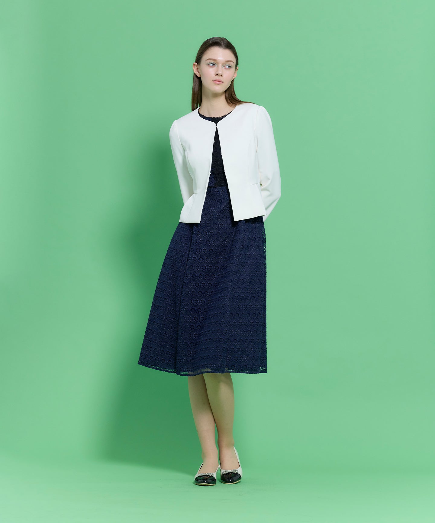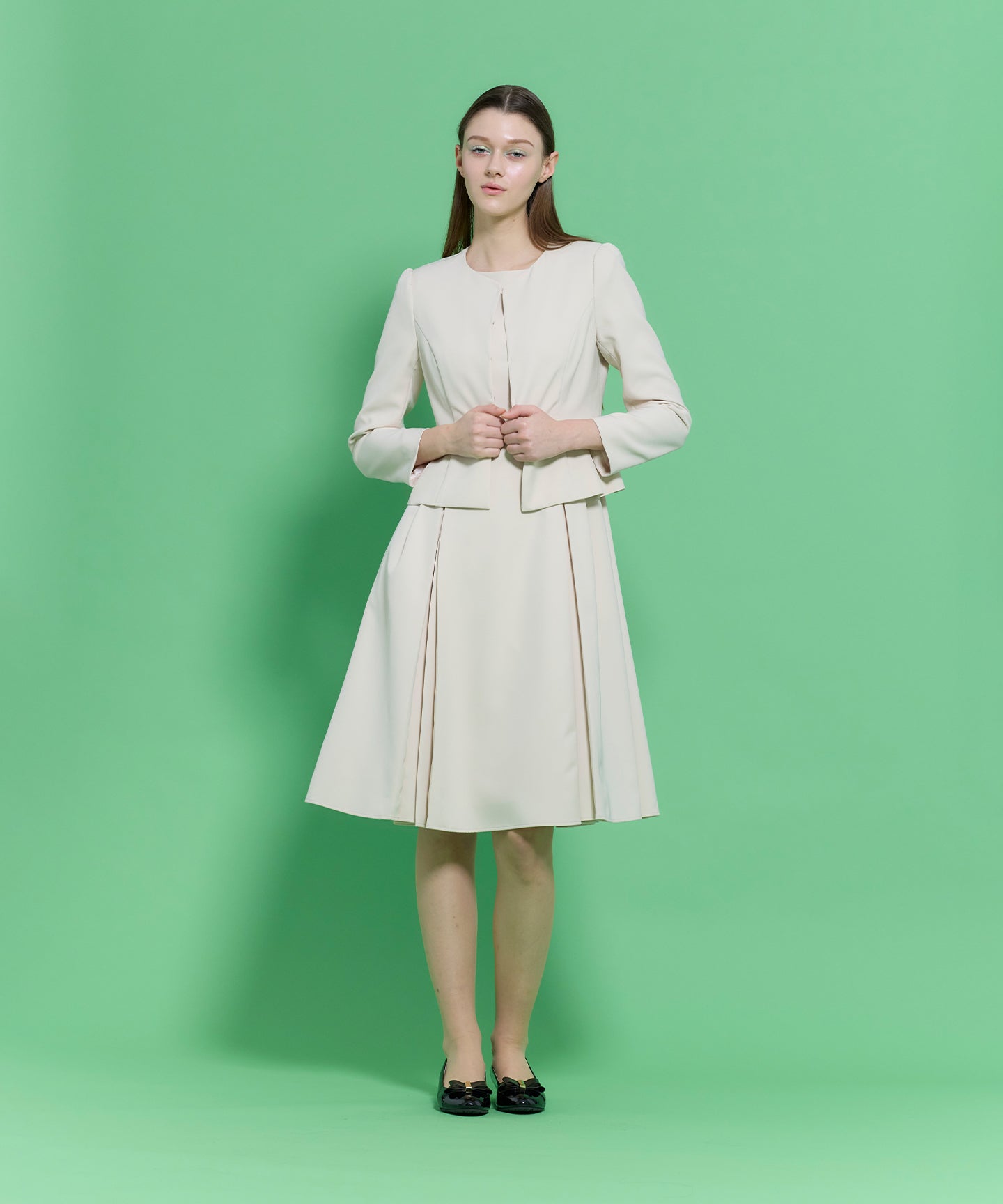 ドレスと同素材のジャケットは、一見きちんとした佇まいながら、実はとても軽く柔らかい着心地で、堅苦しさを感じさせないストレスフリーな仕上がり。 身体に沿いすぎない程よいシェイプラインで、女性らしいシルエットを演出しながら動きやすさもあります。
