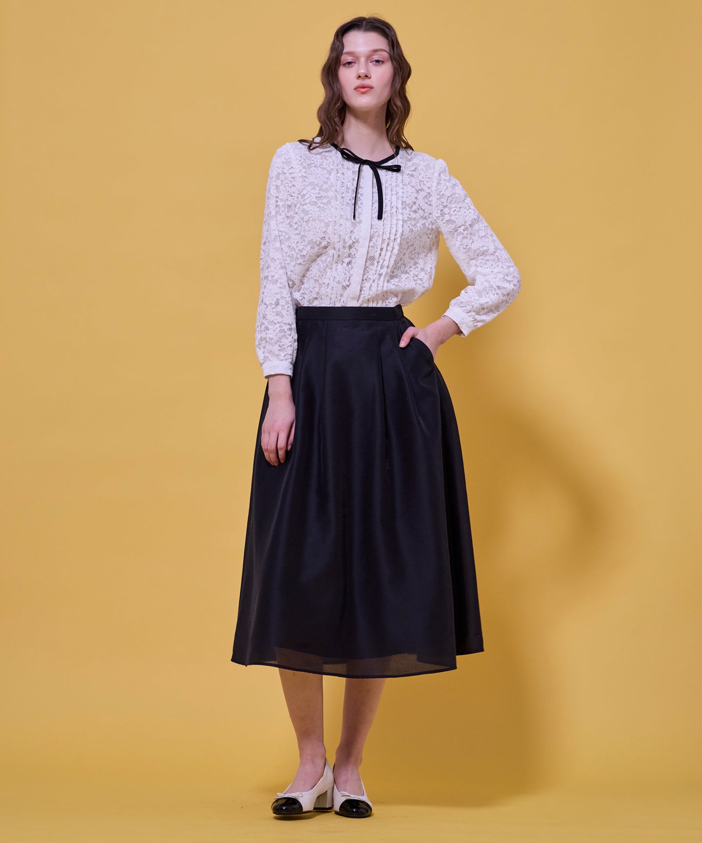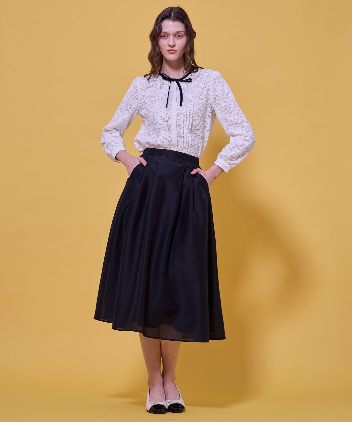 ナチュラルな風合いとしなやかな落ち感が組み合わさった繊細で上質なレースを使用しています。