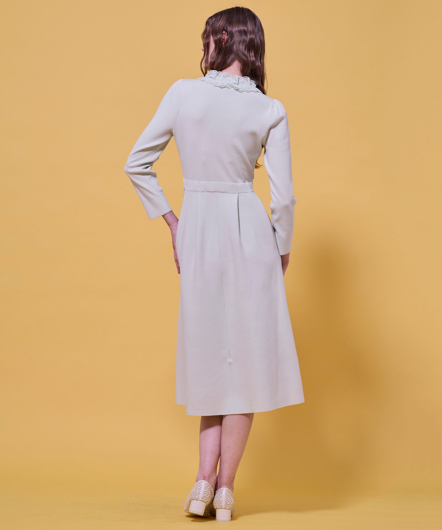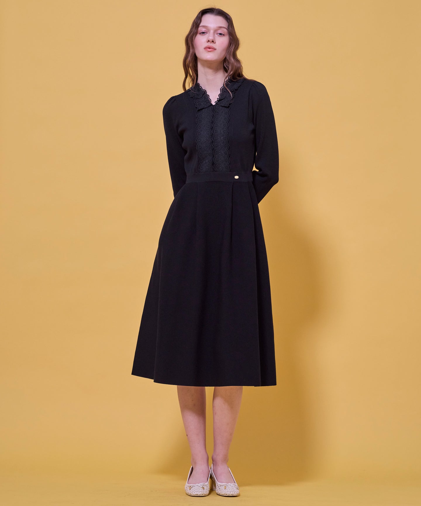 フロントにあしらわれた繊細なレースがエレガントなアクセントとなる一着。シンプルながらもディテールにこだわった、クラシカルで洗練された印象のドレスです。