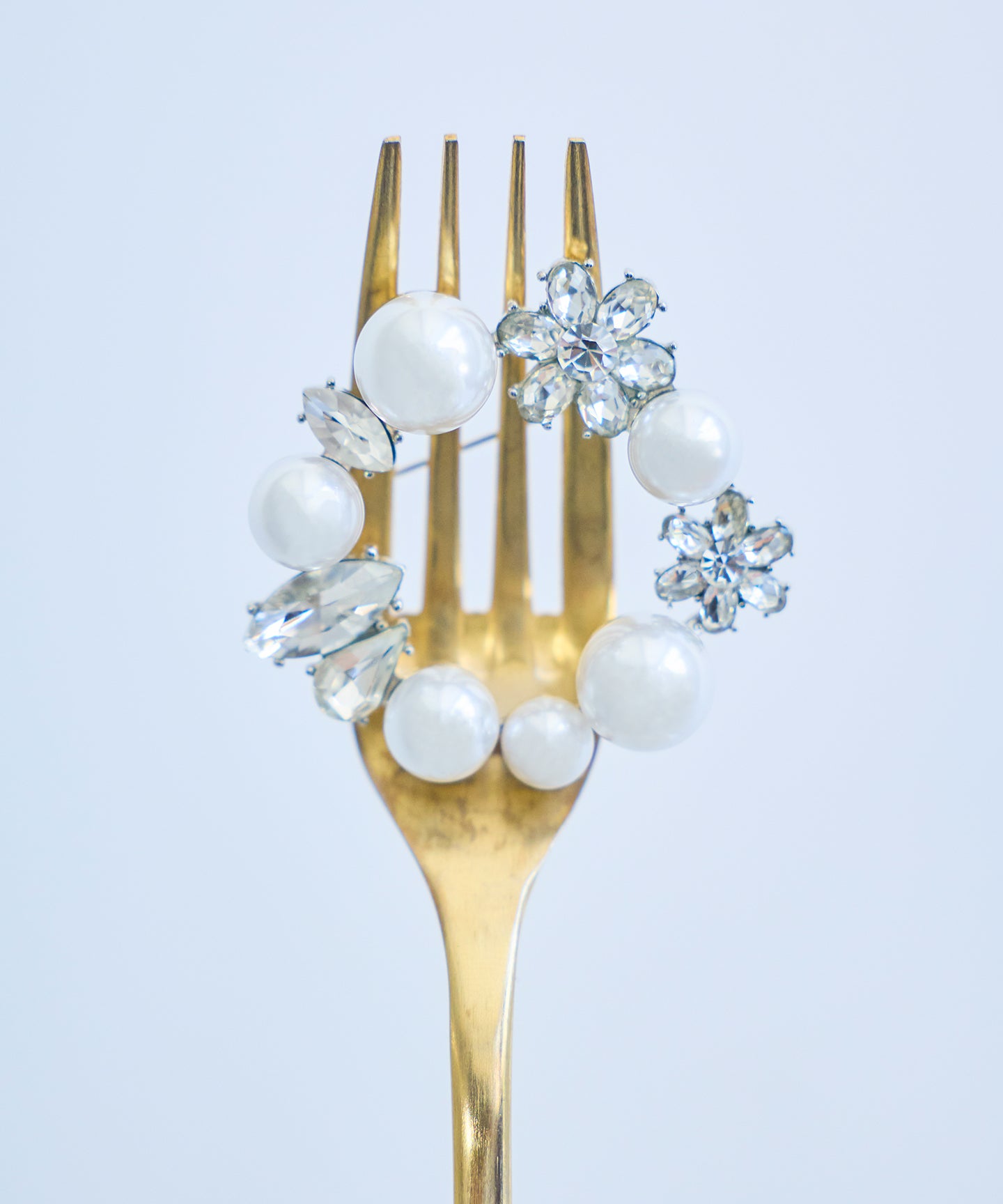 大小ランダムに散りばめたパールの中に、フラワーやリーフをかたちどった石をセッティング。