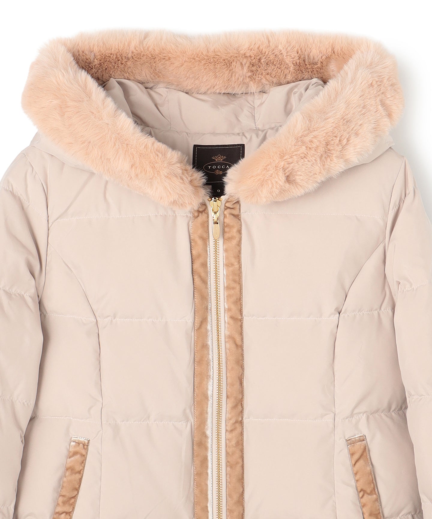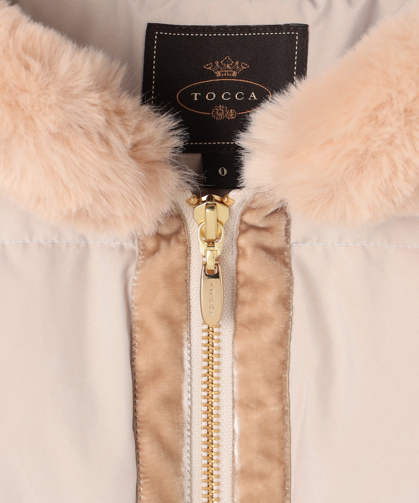 スタイルを美しく見せる計算されたパターンと程よいボリューム感で、冬の装いに欠かせない一着。襟元に上質感漂うフェイクファーをあしらい、より一層フェミニンで洗練された雰囲気に。ふわっと柔らかなファーが顔まわりを優しく包み込み、華やかさと温もりをプラスしてくれます。取り外し可能なデザインで、シーンや気分に合わせて表情を変えられるのも嬉しいポイント。今年はファスナー部分をWファスナー仕様にアップデート。下側のファスナーも開閉できるため、動きやすさが増すだけでなく、ボトムスに合わせてシルエットの調整ができ、スタイリングの幅も広がります。 フロントやウエストには、TOCCAらしさ溢れるベルベットテープやゴールド調の金属パーツをあしらい、上品なアクセントに。
