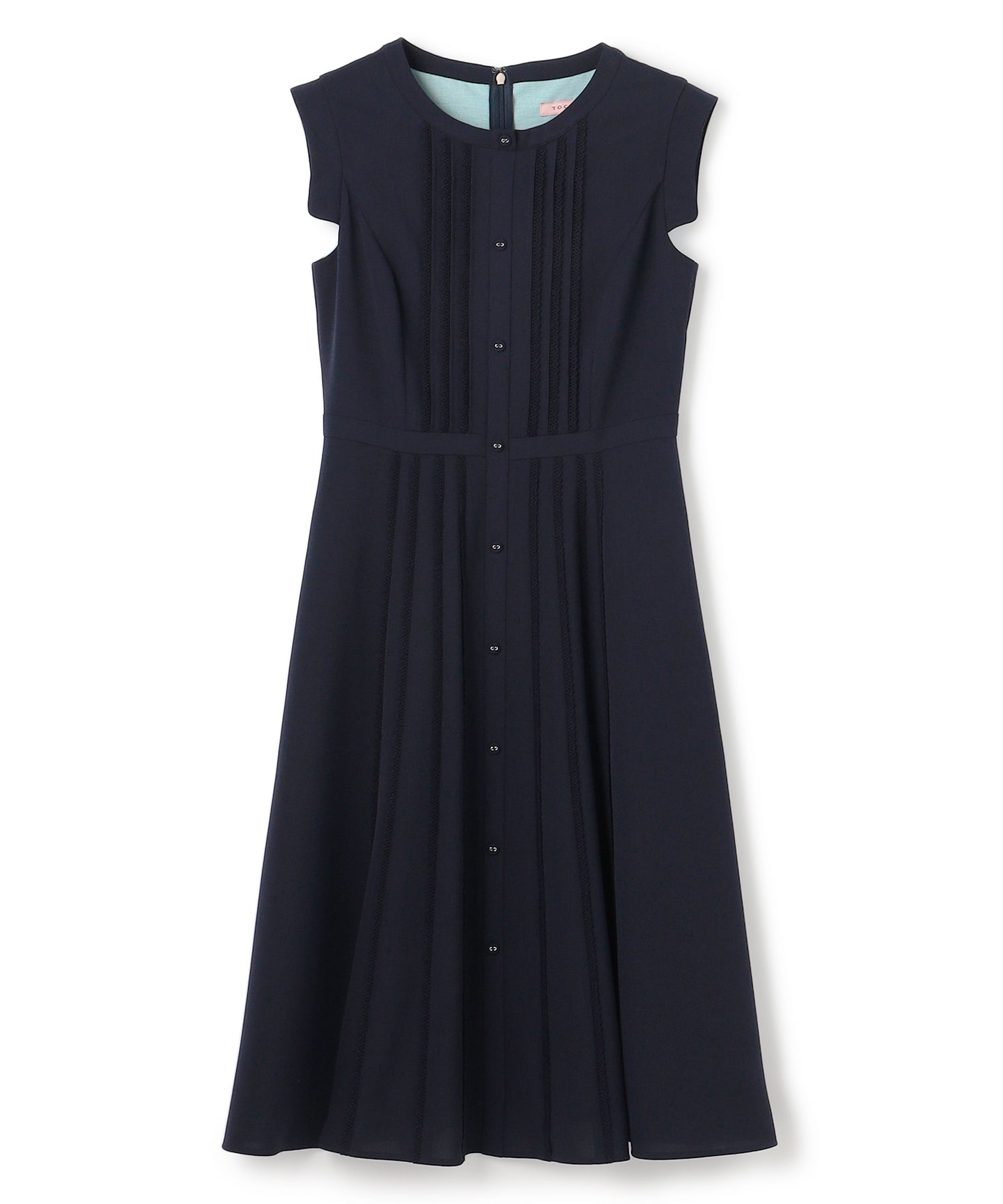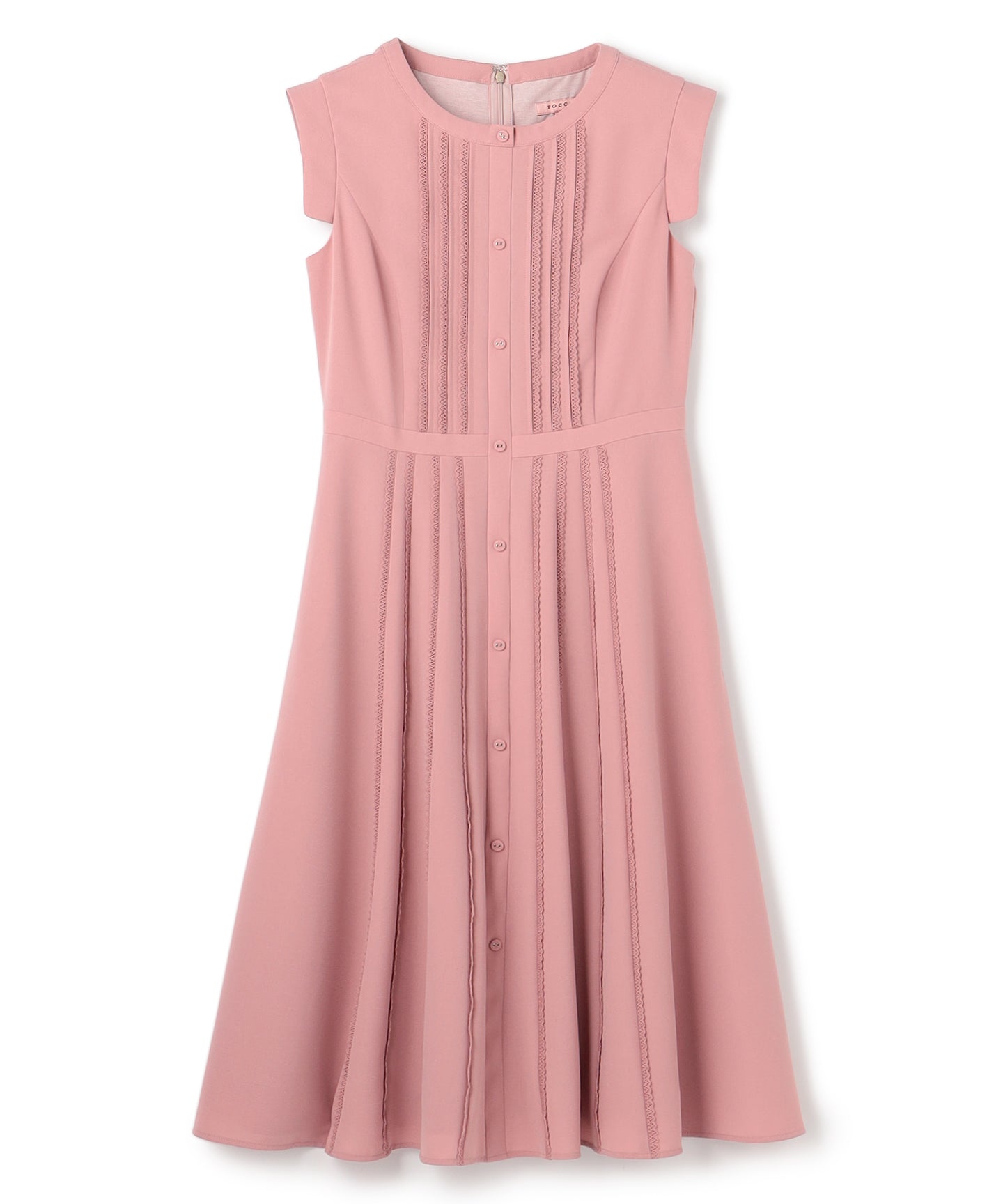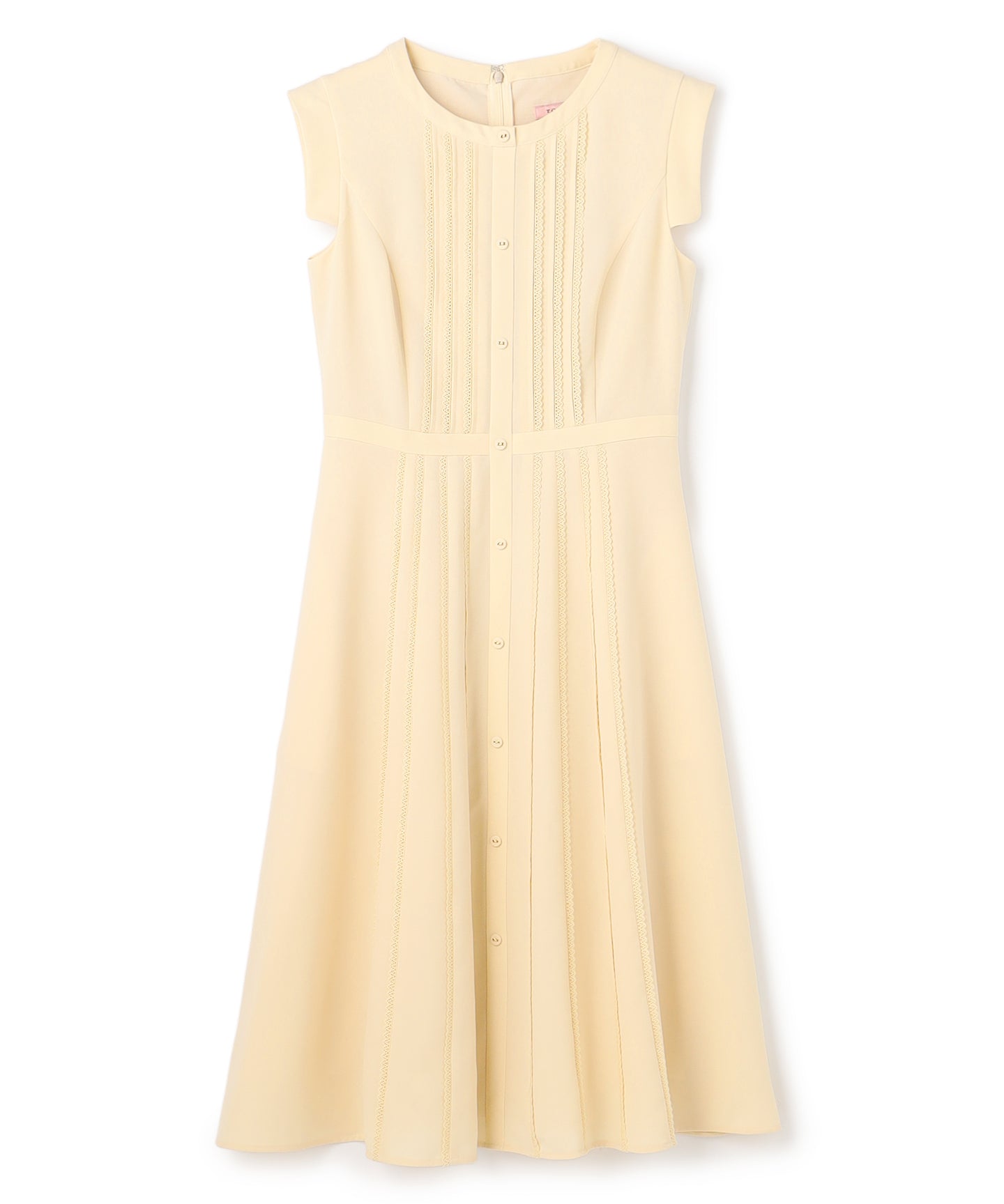 ストライプ状に配置したレース、前ボタンデザインが上品な印象のドレス。 シワになりにくく透け感のない軽やかな素材を使用しています。