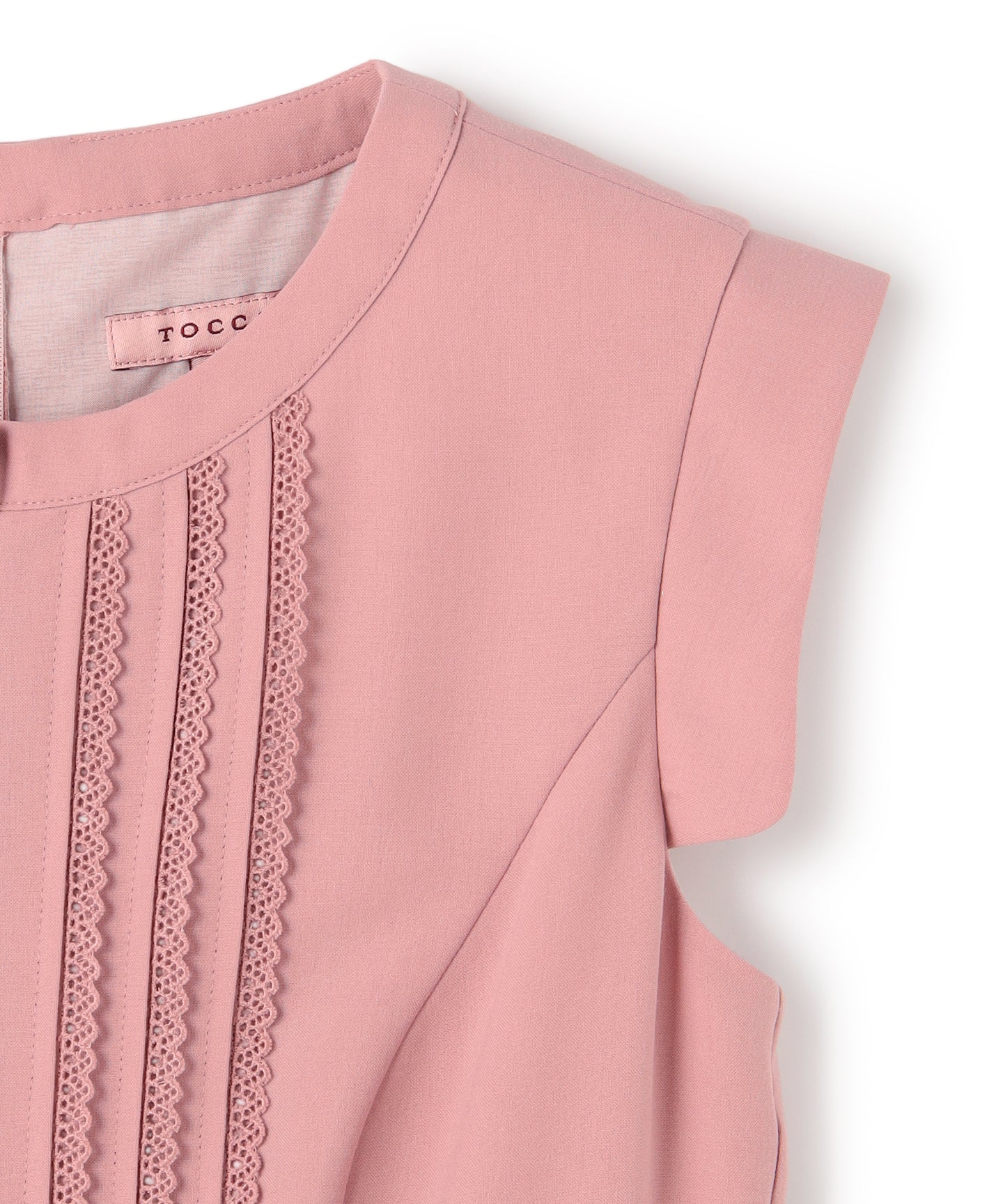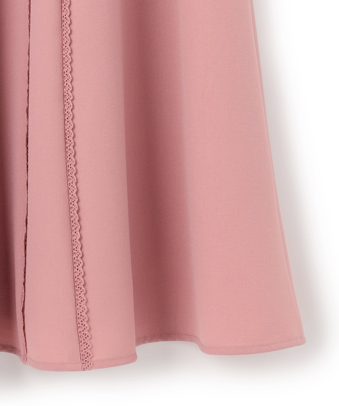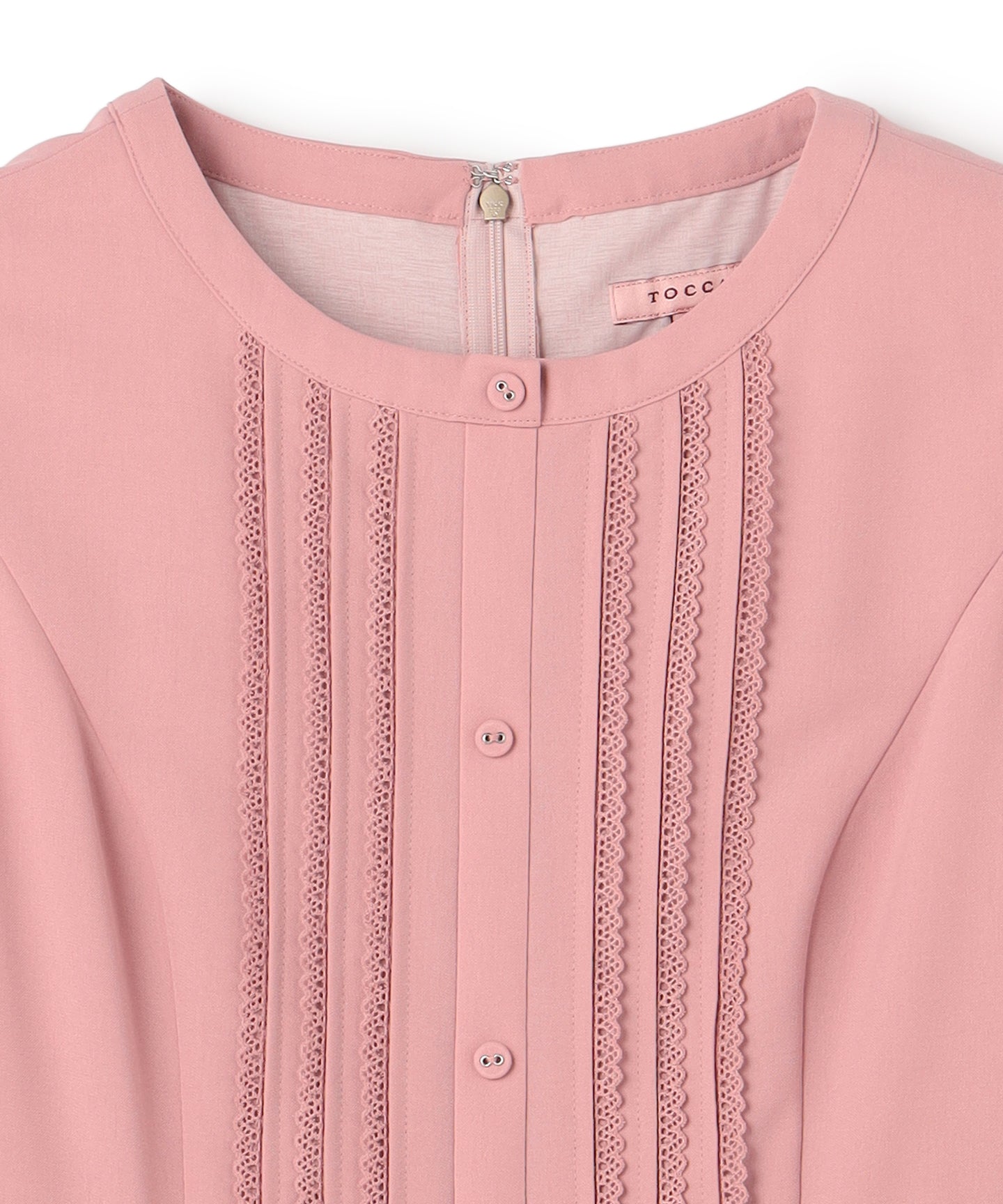 ストライプ状に配置したレース、前ボタンデザインが上品な印象のドレス。 シワになりにくく透け感のない軽やかな素材を使用しています。