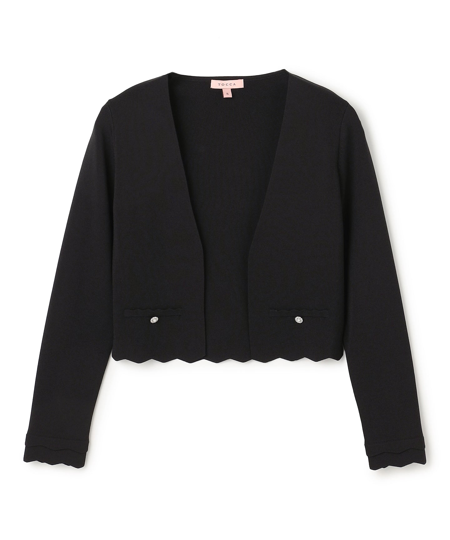 袖口と裾のスカラップデザインが上品さを引き立てるノーカラーボレロ。 コンパクトな丈感ですっきりとした印象に仕上げ、ワンピースやドレスに合わせてフォーマルな場にもふさわしい一枚。前立てのデザインは胸元を美しく見せ、アクセサリーとも相性抜群です。また、裾のカーブラインが自然とウエスト位置を高く見せるため、スタイルアップ効果も期待できます。