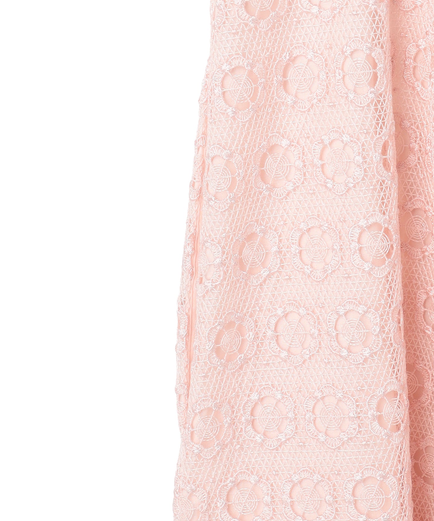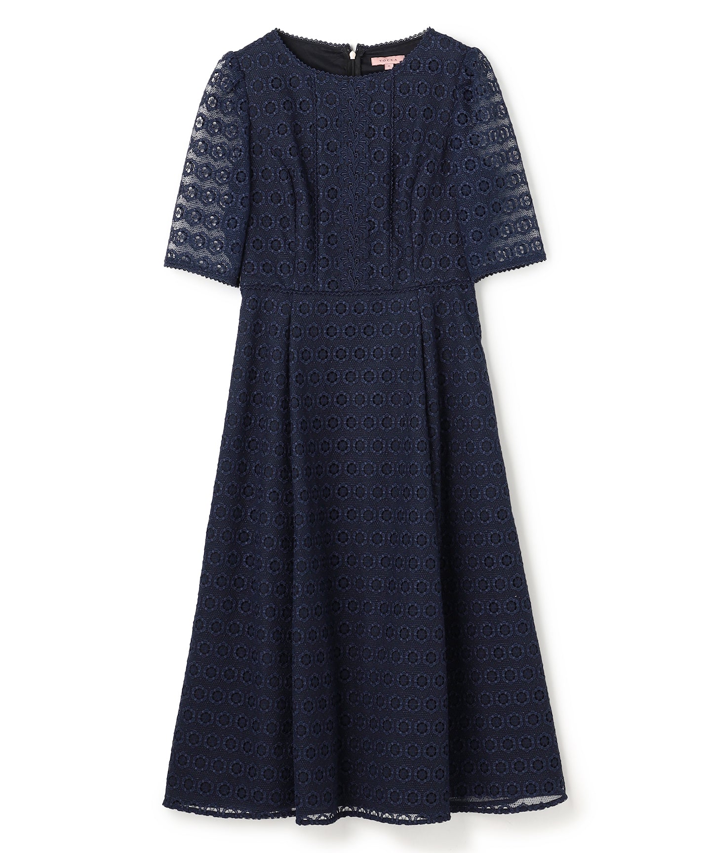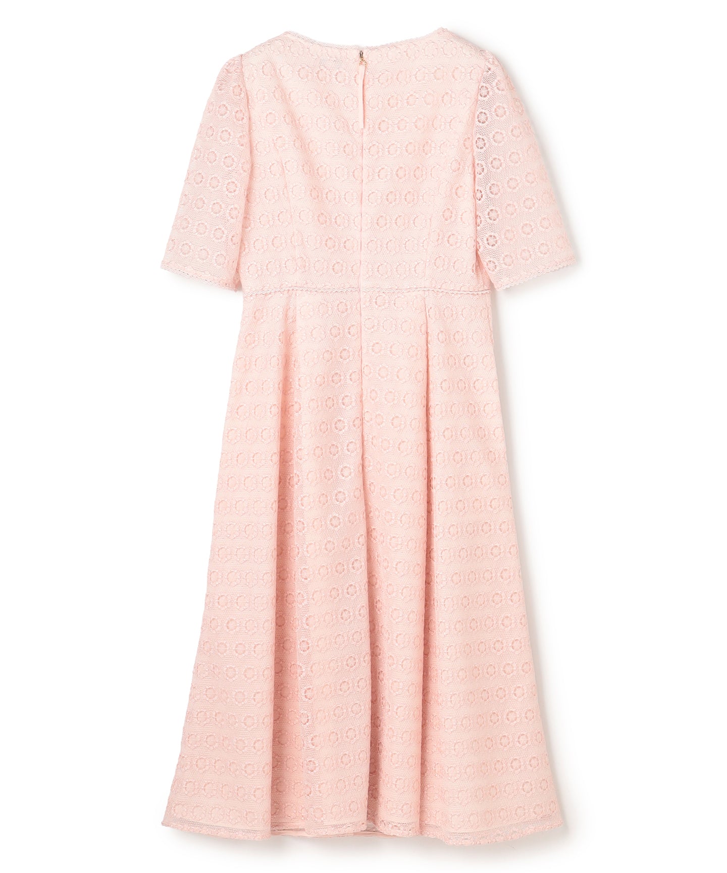 繊細な総レース素材を使用した、上品で華やかなドレス。 程よい透け感のあるスリーブが軽やかな抜け感を演出し、女性らしいエレガントな雰囲気を引き立てます。