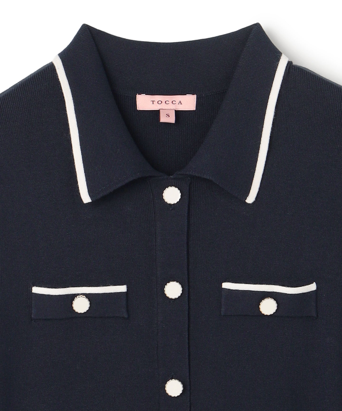 襟やポケット口、ウエスト、袖口に施されたラインが全体を引き締め、上品でクラシカルな雰囲気を演出します。