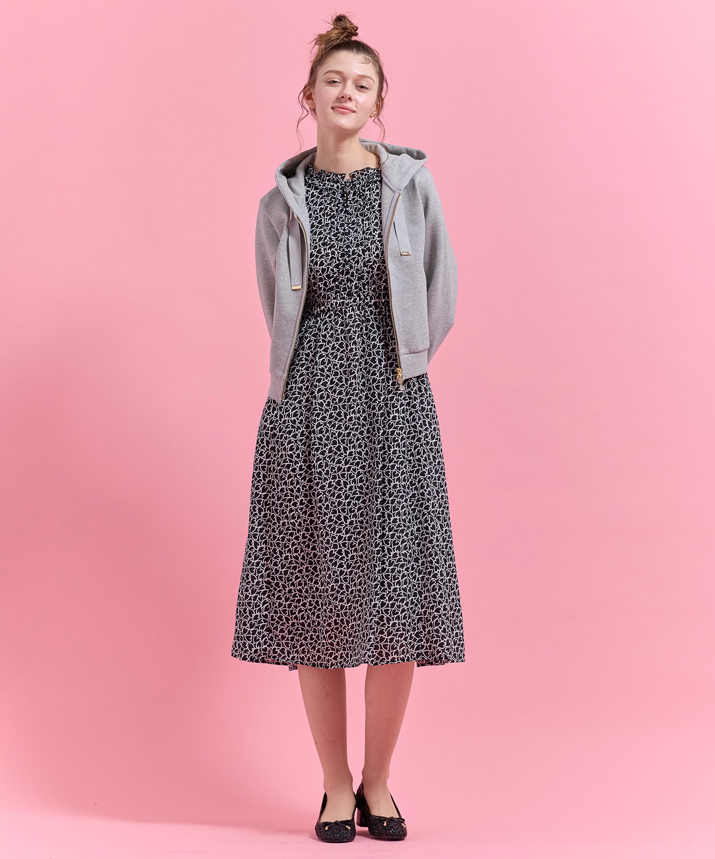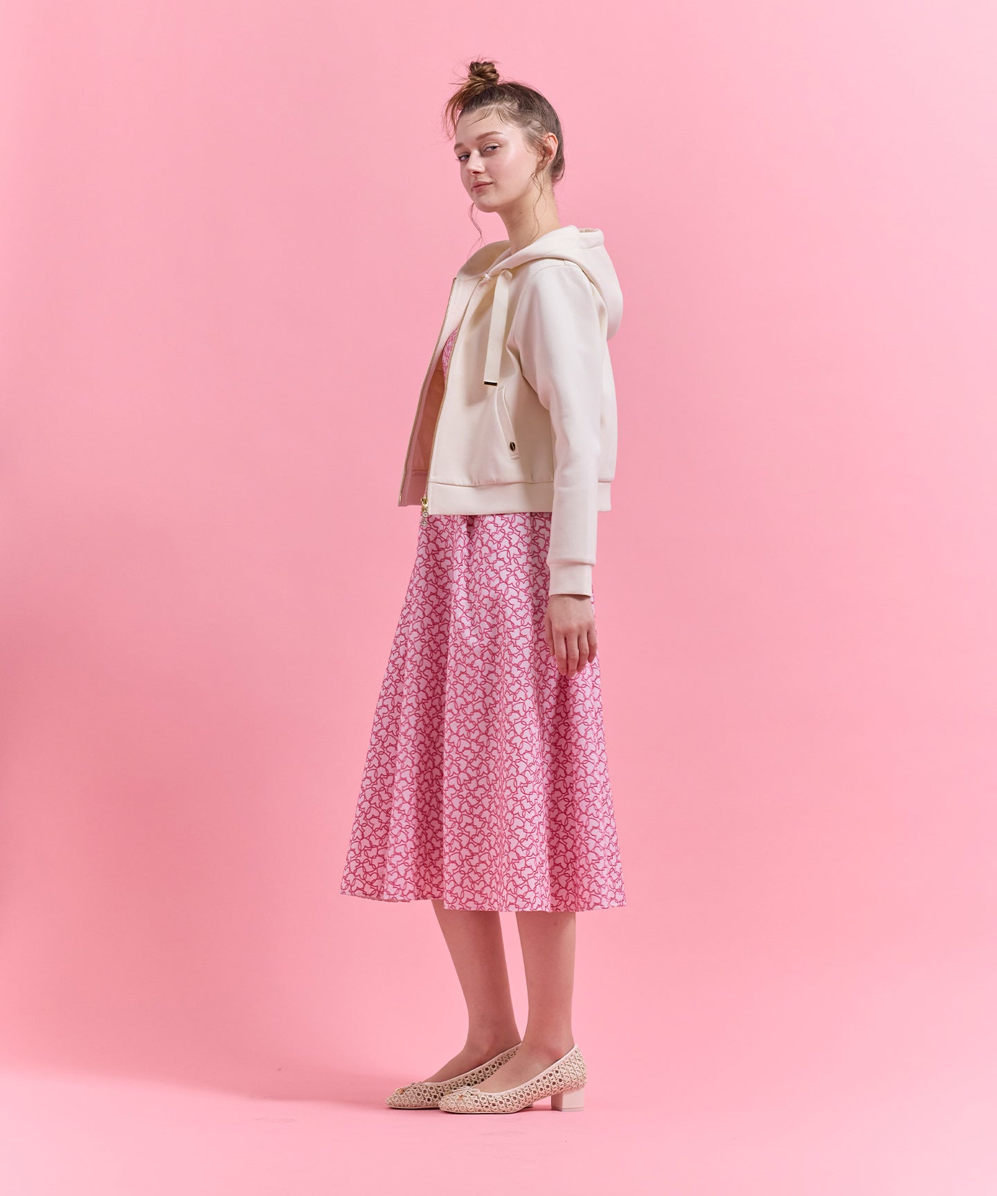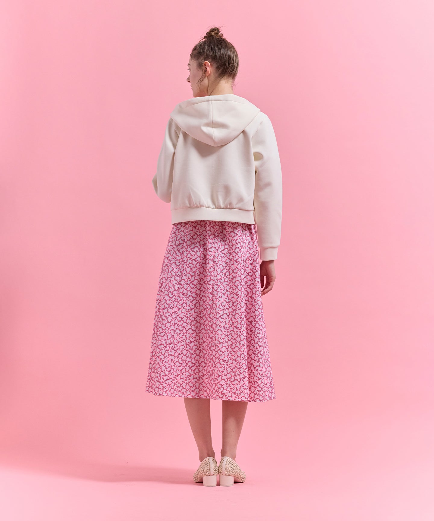 トレンドのダンボール素材でおつくりしたフーディは、滑らかでハリがあり、カジュアルなアイテムながらも綺麗見えします。 チャックの引手にデイジーのパーツを使用しさりげない可愛らしさを備えています。短めの丈でスカートやドレス合わせにぴったりな丈感とゴールドやグログランテープなどのフェミニンな付属使いで、TOCCAらしい可憐さをプラスしています。