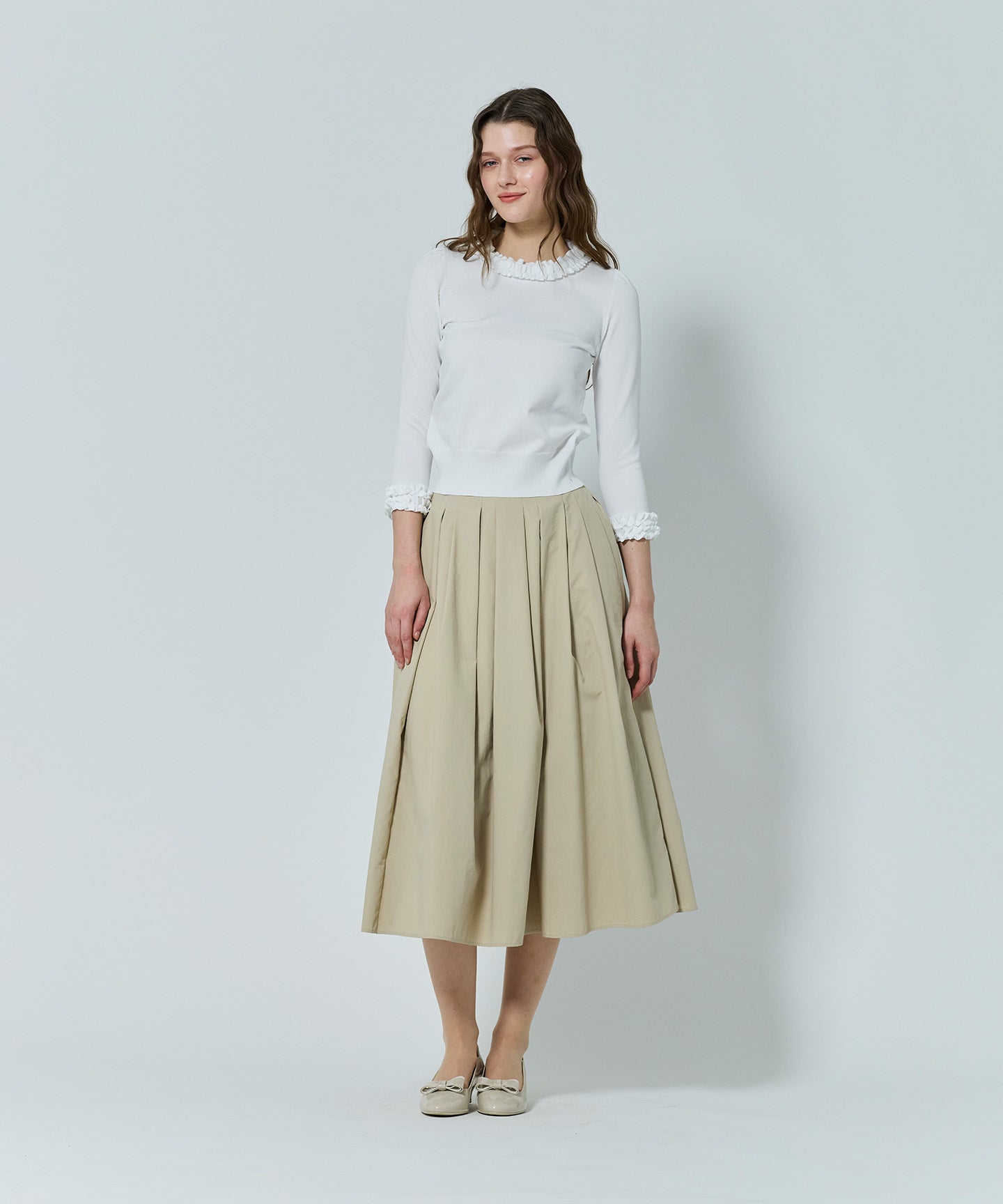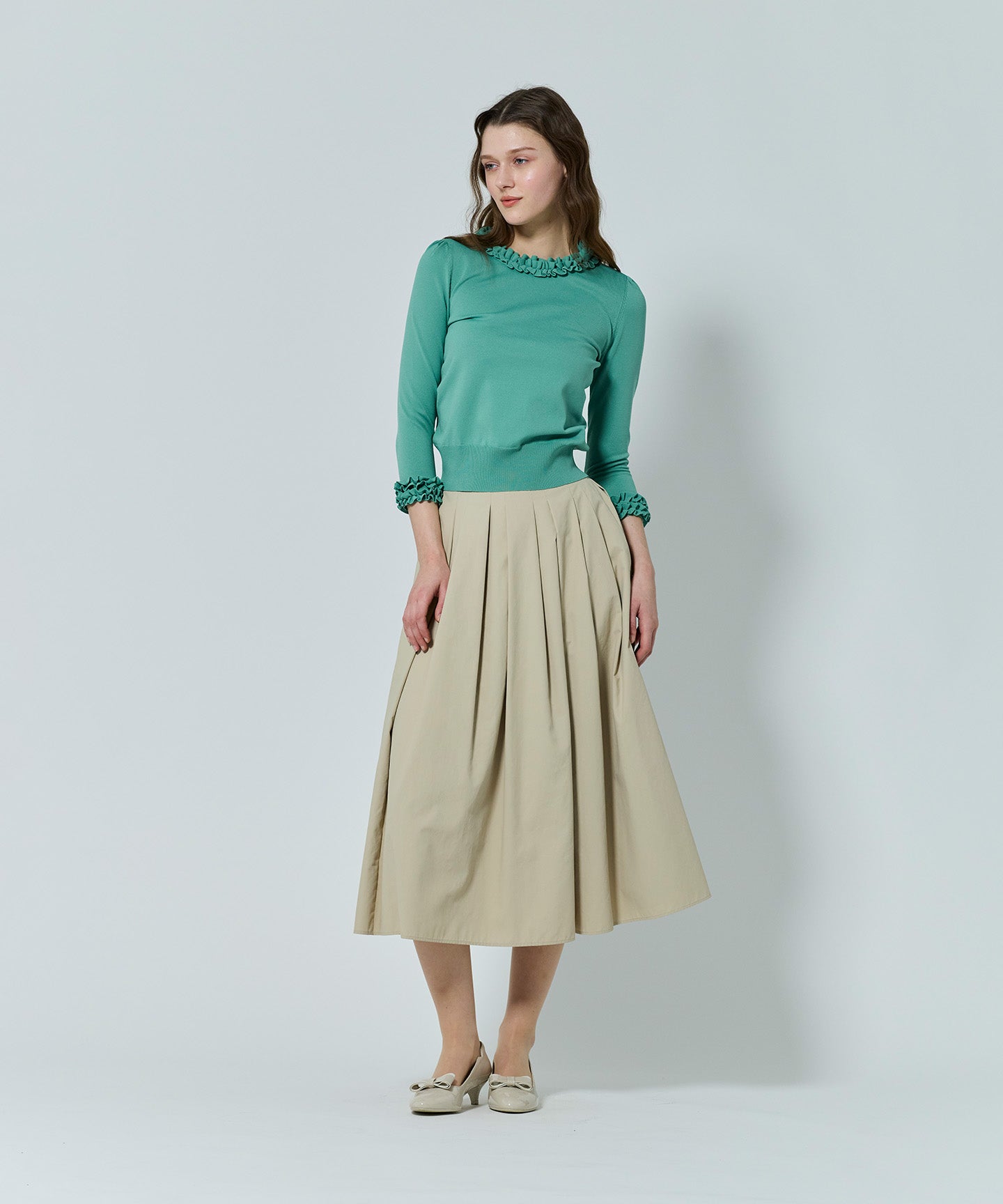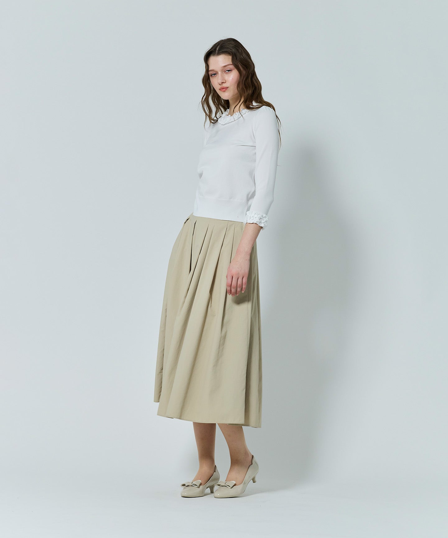 襟もとにあしらわれたニットフリルが印象的なフェミニンなプルオーバー。身頃と同素材で編み立てたフリルは甘さを抑えた上品なデザインで、大人の可愛らしさを引き立てます。 きりっとしゃりみのがあり、スカートにもパンツにもマッチする素材感で、ジャケットのインナーとしても映えるデザイン。