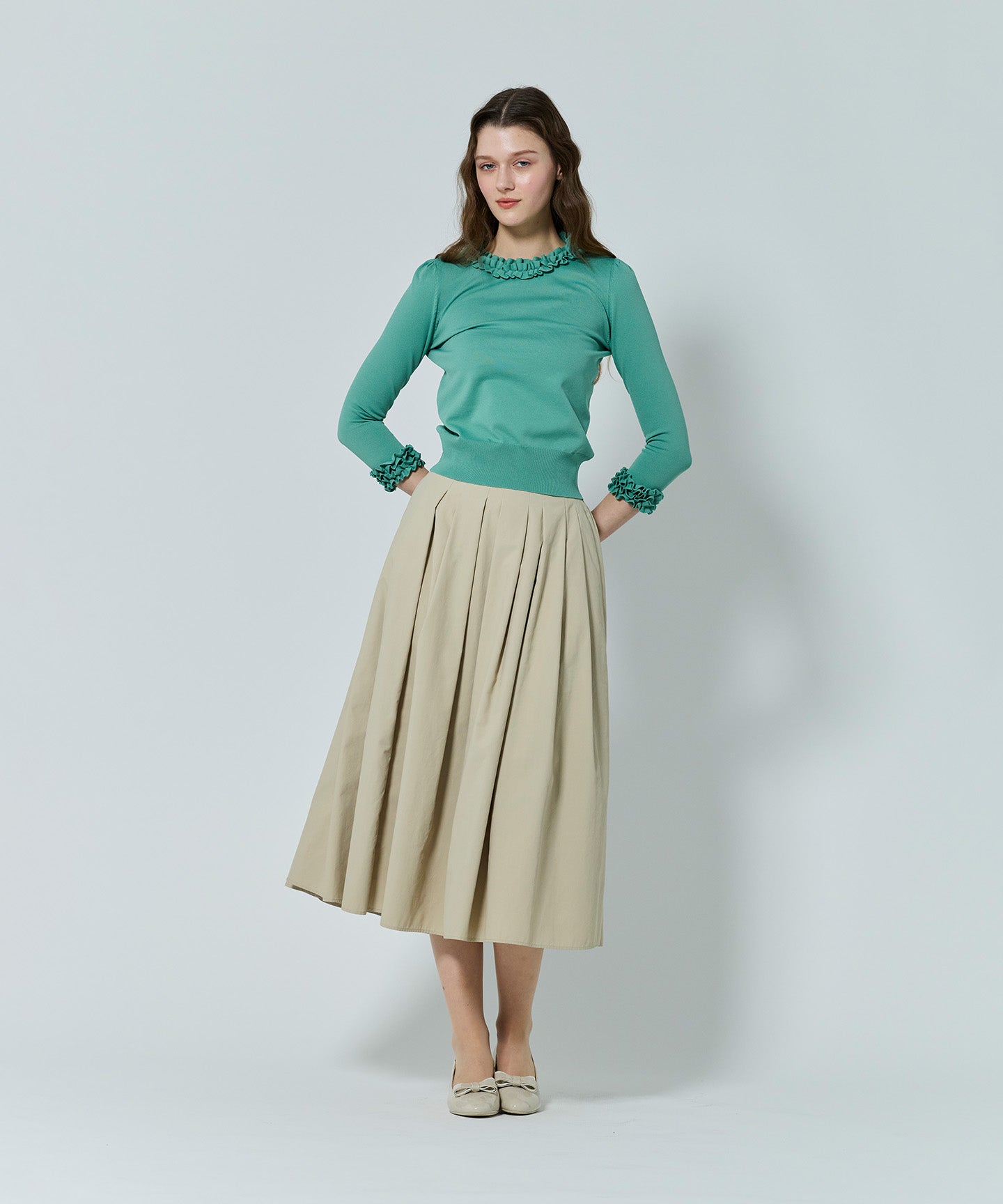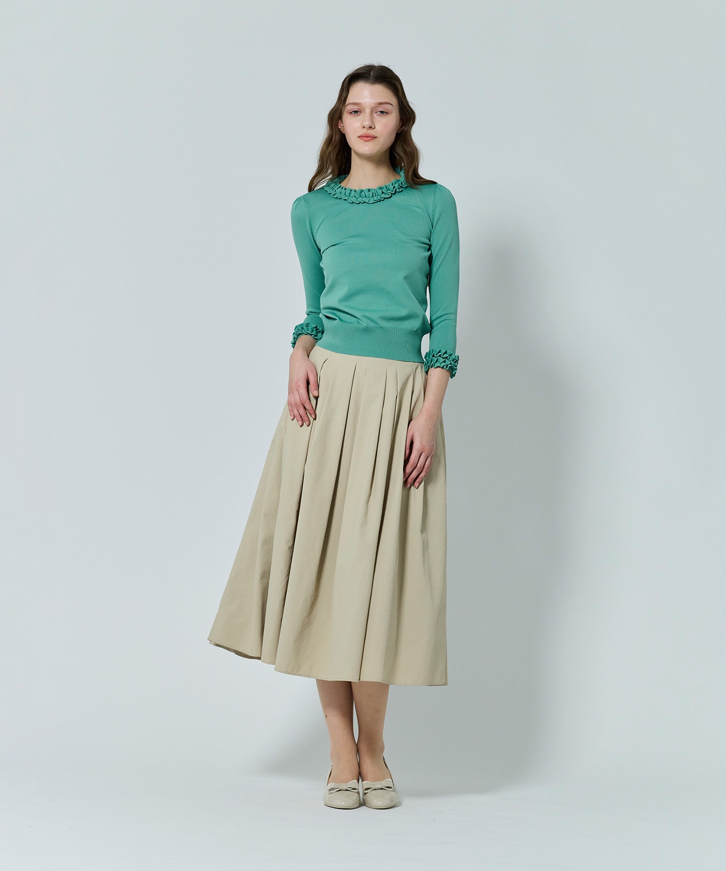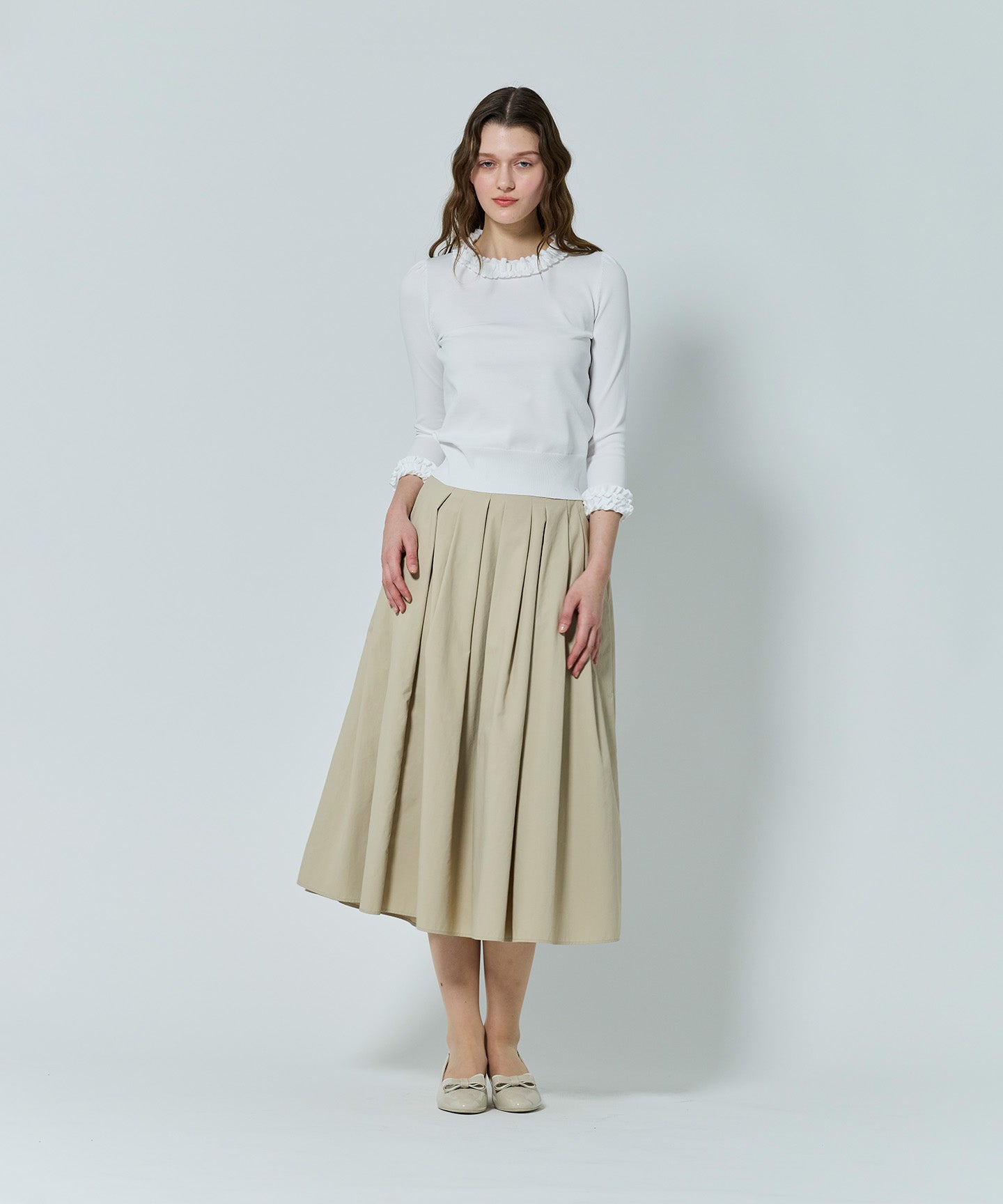 襟もとにあしらわれたニットフリルが印象的なフェミニンなプルオーバー。身頃と同素材で編み立てたフリルは甘さを抑えた上品なデザインで、大人の可愛らしさを引き立てます。 きりっとしゃりみのがあり、スカートにもパンツにもマッチする素材感で、ジャケットのインナーとしても映えるデザイン。