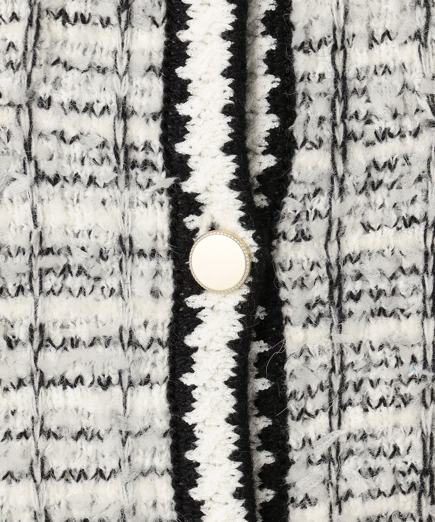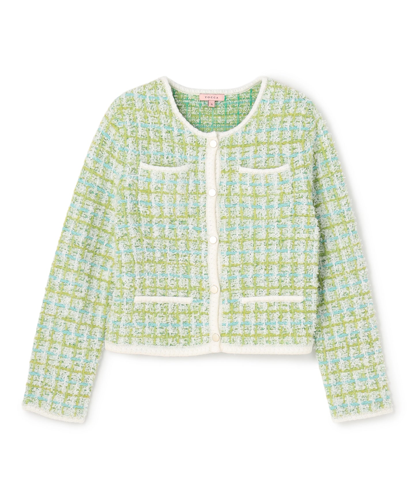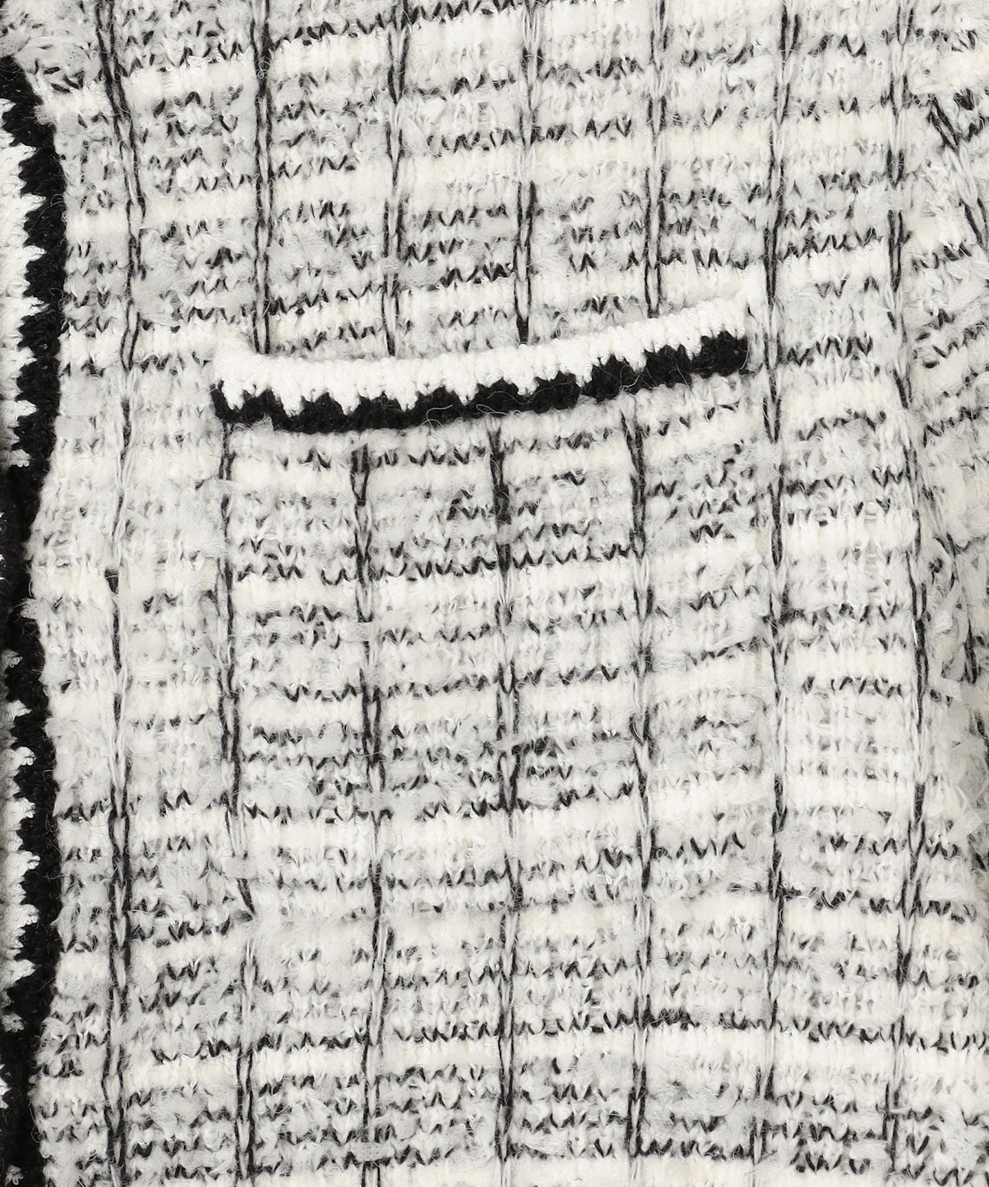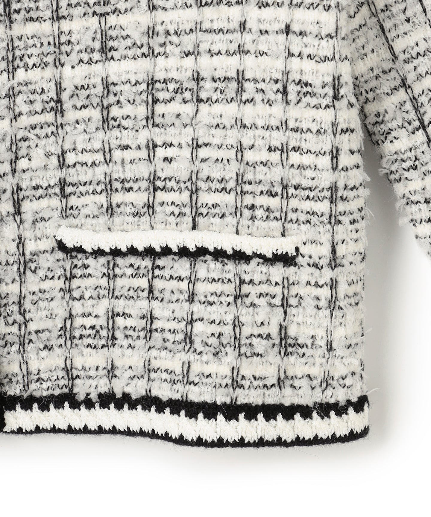 オフィスシーンではきちんと感を演出しつつも、肩肘張らないエレガントな印象に。普段のデイリースタイルにもさっと羽織るだけで、装いに華やぎと品格を添えてくれます。さまざまな種類の糸を織り交ぜて丁寧に編み上げた表情豊かな編地は、立体感と奥行きのある仕上がりで、襟元や前立て、ポケット部分には締め色のストレート糸をあしらうことで、全体の印象を引き締めより洗練された雰囲気を演出しています。