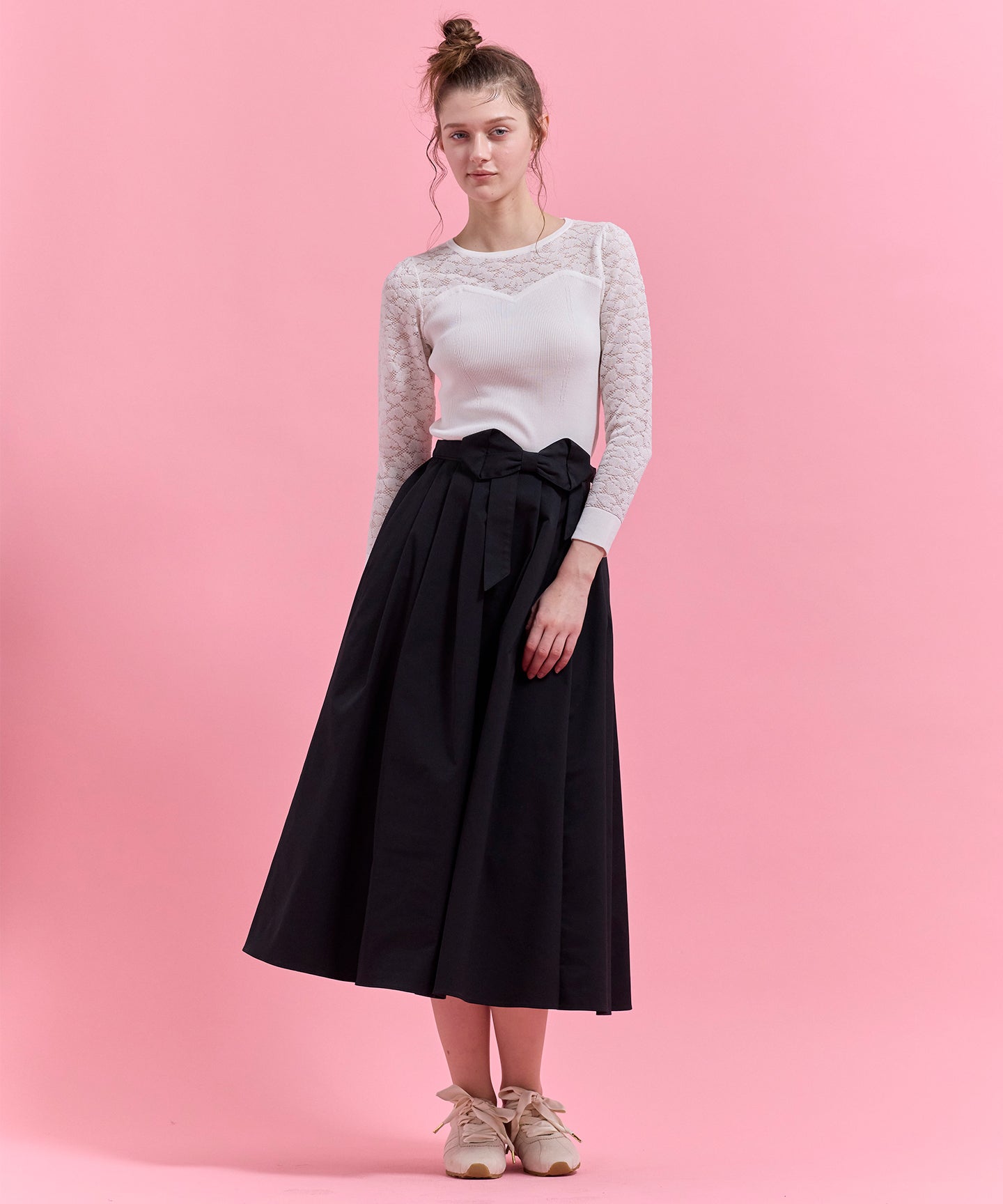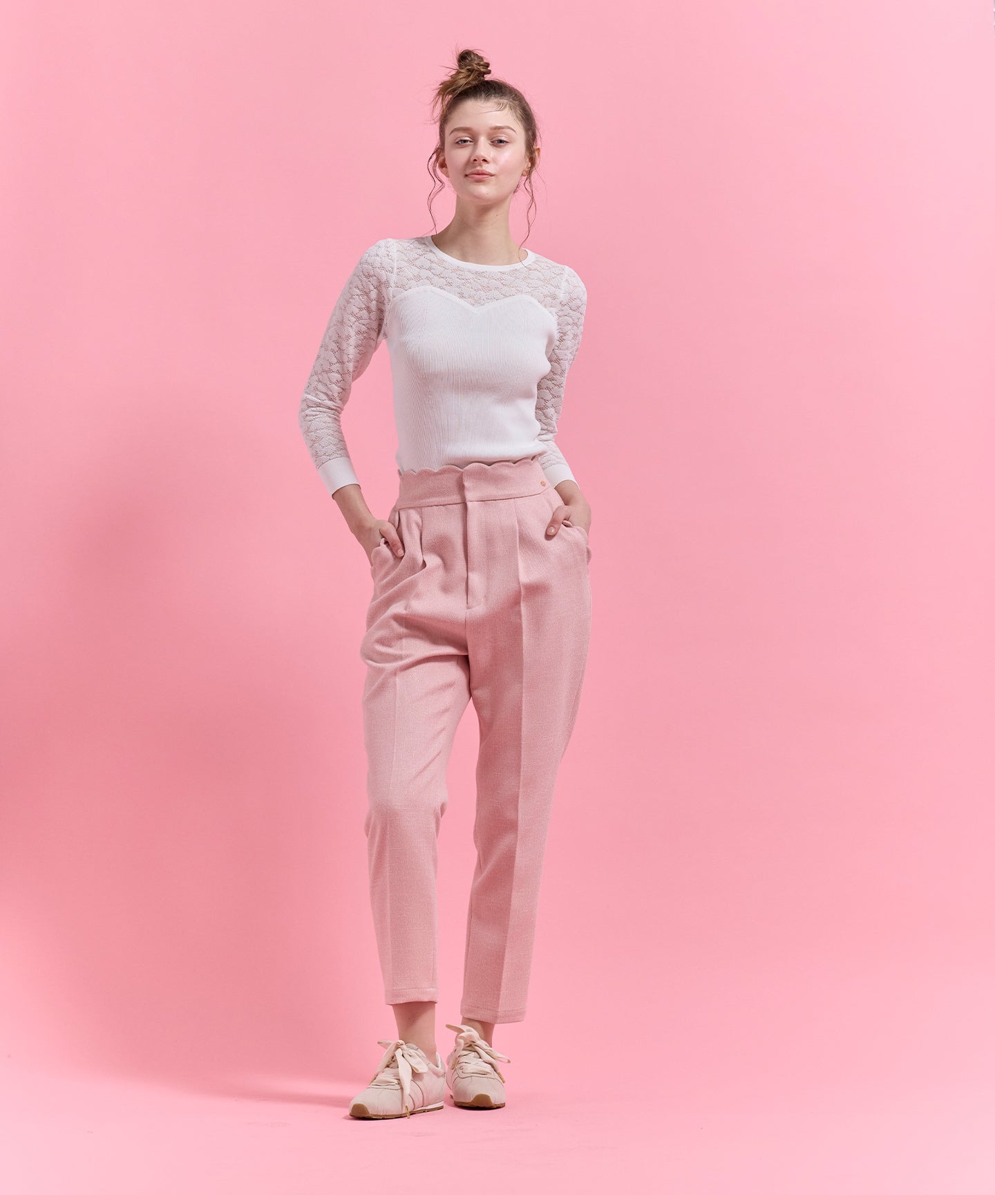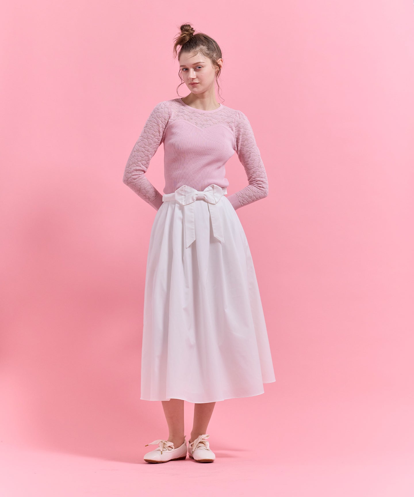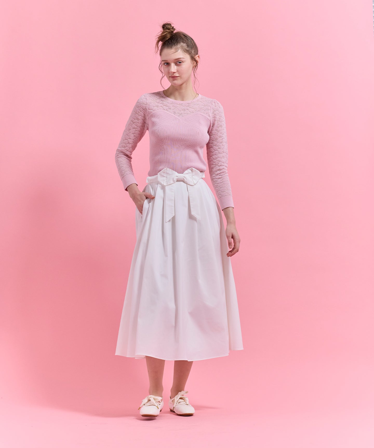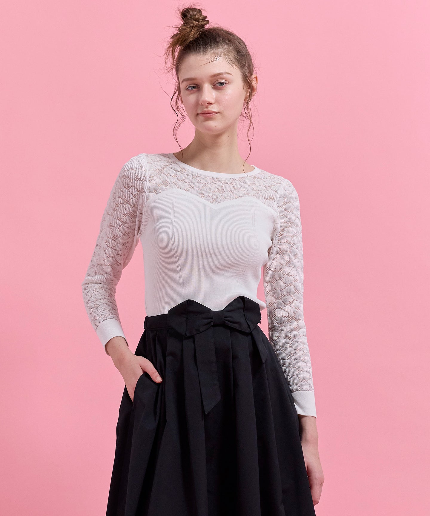ハート柄のレースをあしらったシアーなデザインが目を引くニットトップス。 デコルテや袖に透け感を効かせ、甘さと上品さを兼ね備えた一枚に仕上げました。 身頃はリブ編みで程よくフィットし、すっきりとしたシルエットを演出。ビスチェ風の切り替えラインが女性らしさを際立たせつつ、スタイリングに立体感をプラスします。 一枚で着映えするのはもちろん、ジャケットやカーディガンのインナーとしても活躍。デイリーから特別なシーンまで幅広く取り入れられる、上品な印象の一枚。