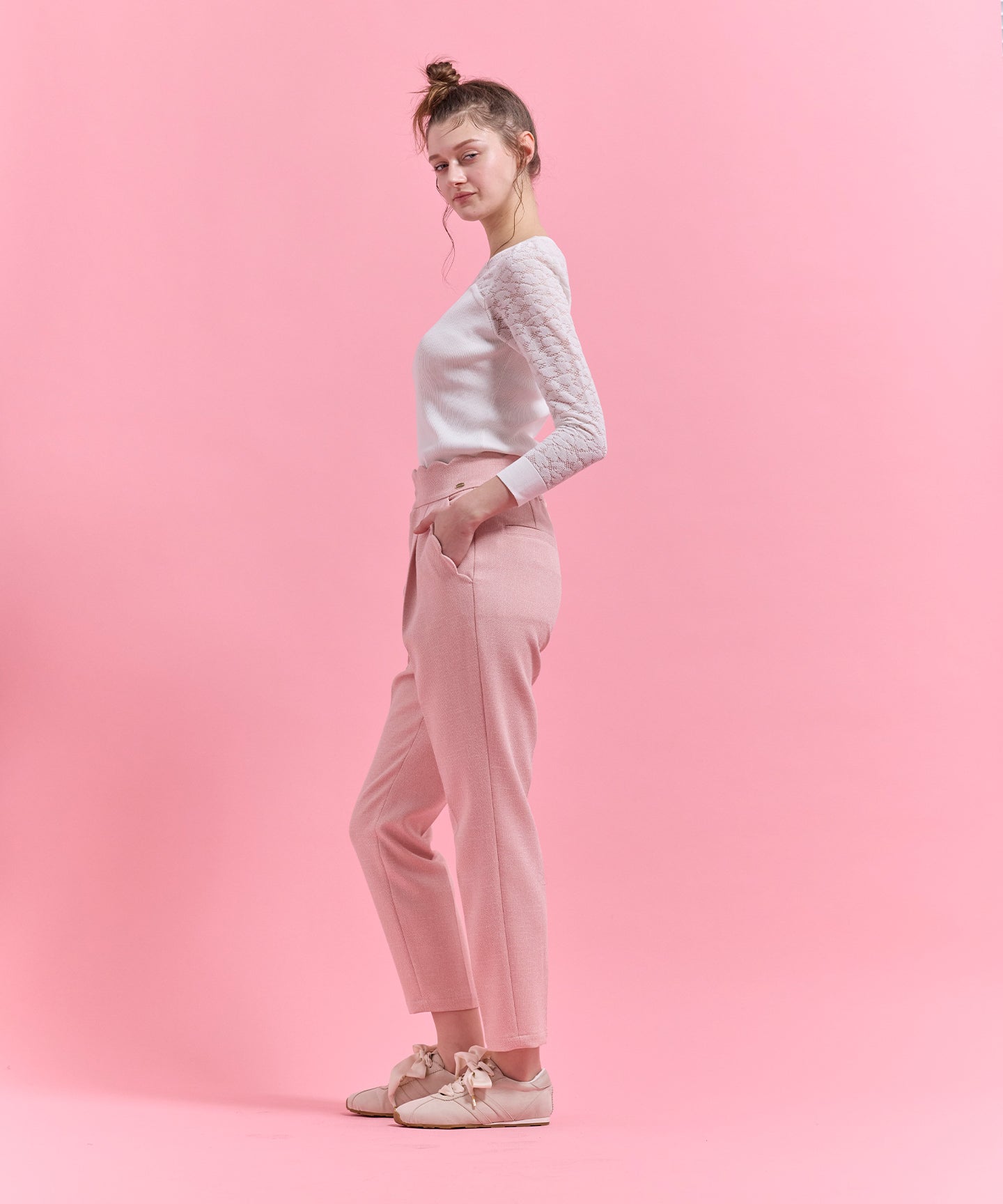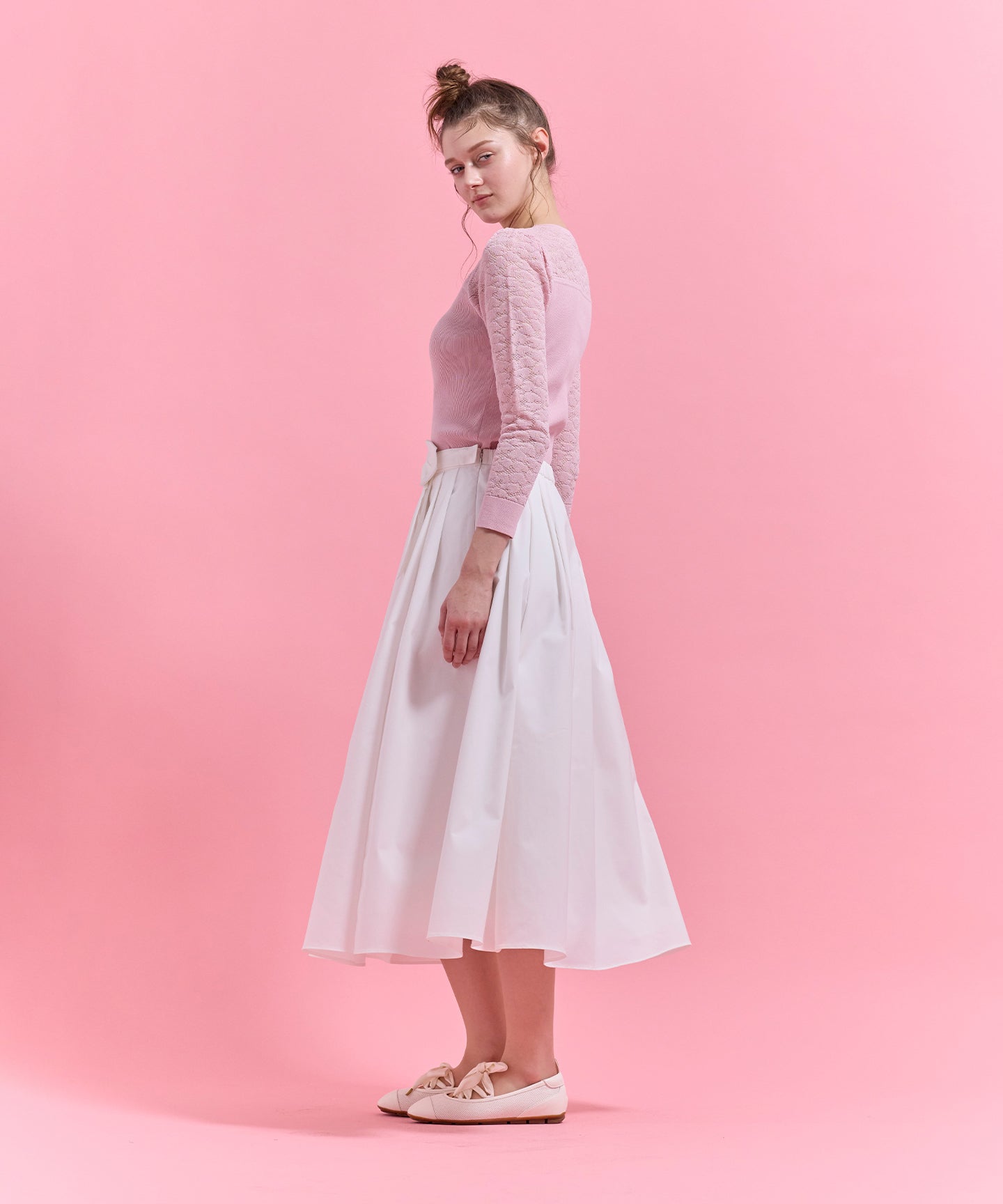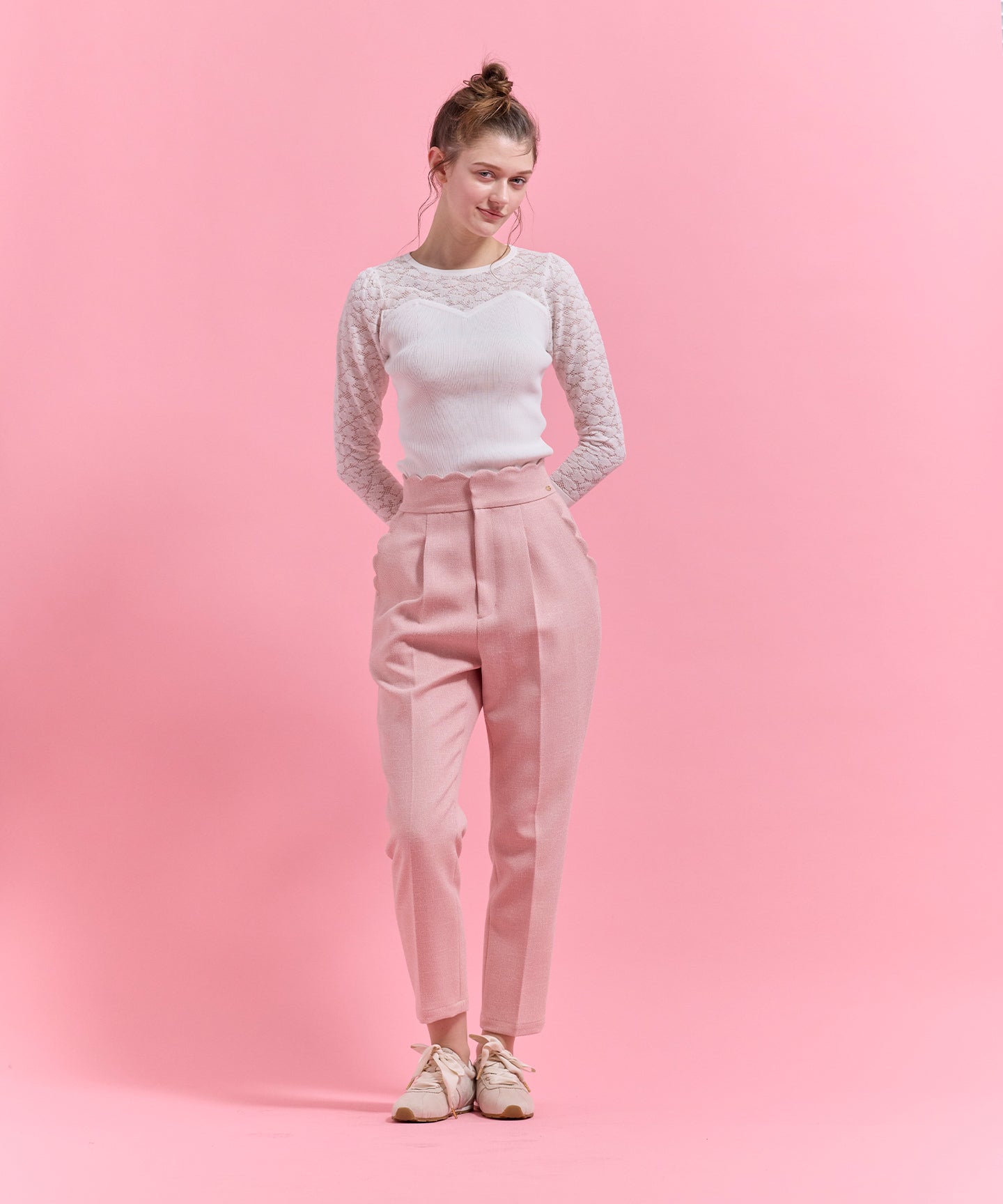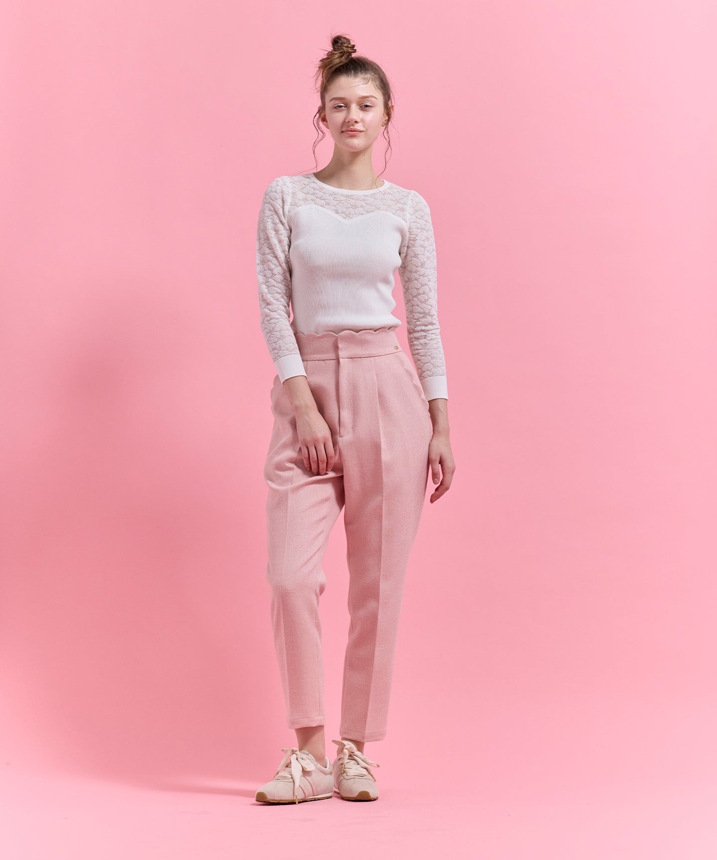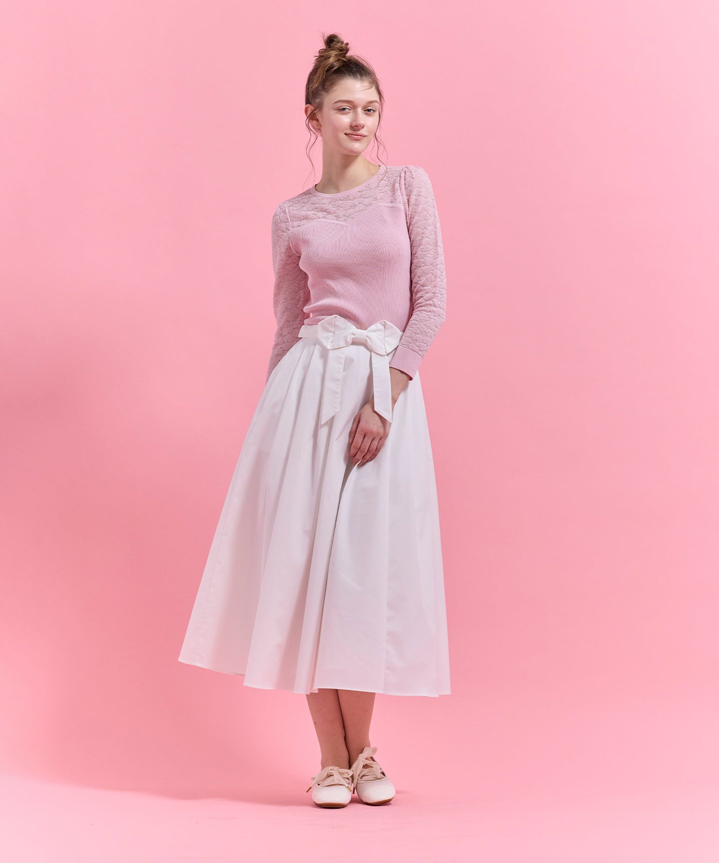 ハート柄のレースをあしらったシアーなデザインが目を引くニットトップス。 デコルテや袖に透け感を効かせ、甘さと上品さを兼ね備えた一枚に仕上げました。 身頃はリブ編みで程よくフィットし、すっきりとしたシルエットを演出。ビスチェ風の切り替えラインが女性らしさを際立たせつつ、スタイリングに立体感をプラスします。 一枚で着映えするのはもちろん、ジャケットやカーディガンのインナーとしても活躍。デイリーから特別なシーンまで幅広く取り入れられる、上品な印象の一枚。