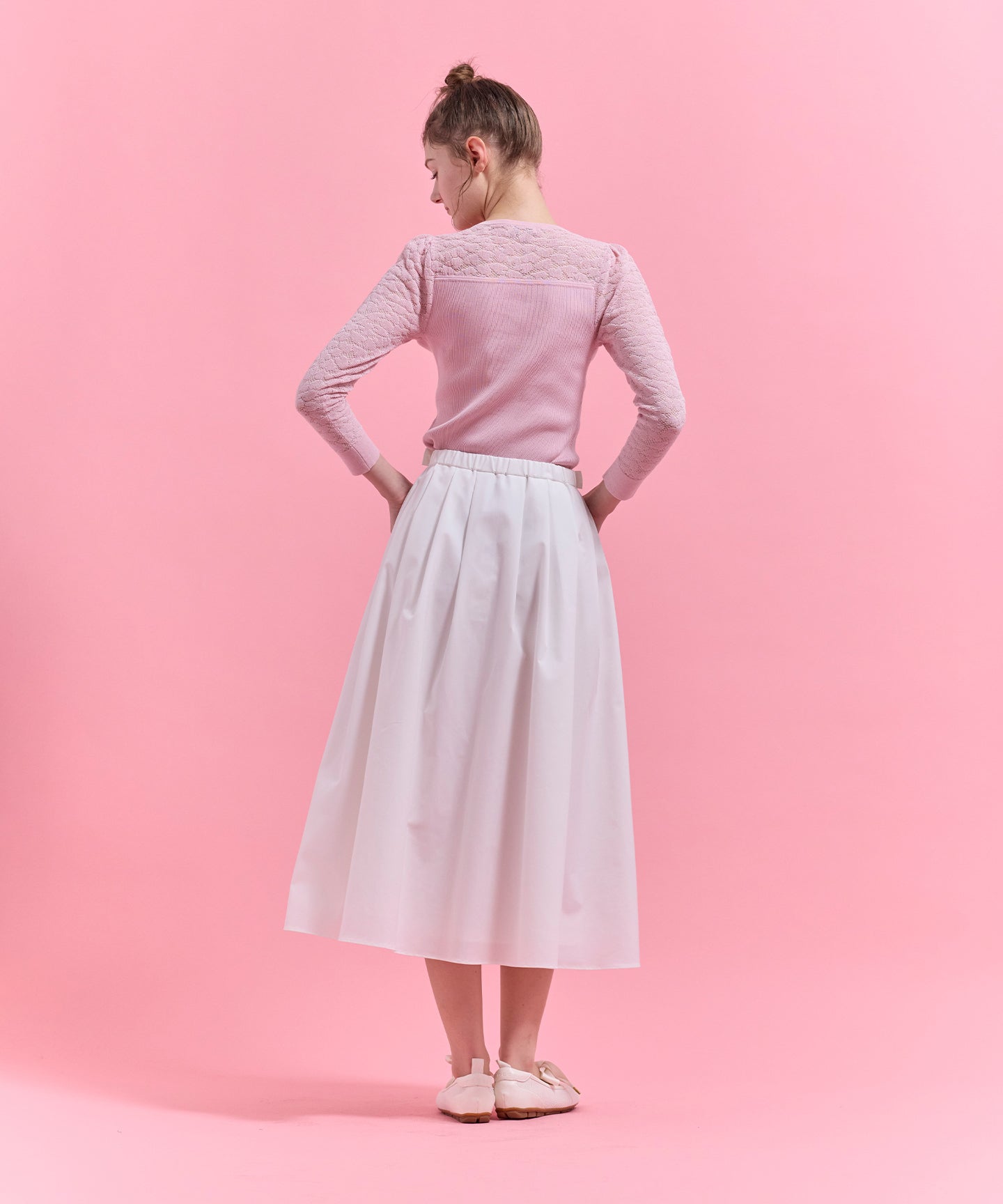 シャリ感と軽さですっきりとした綺麗め素材と、繊細な光沢と透明感を併せ持つ上品な印象のニットです。