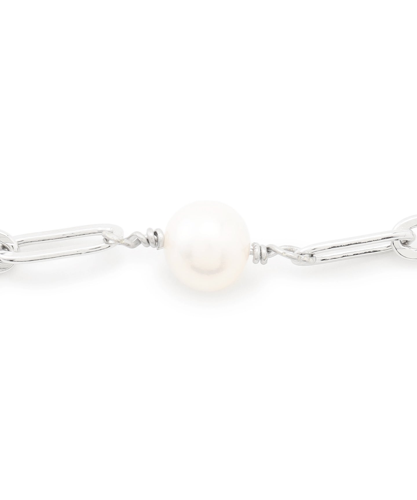 チェーンは一コマずつがモダンなフォルムで抜け感があるデザインのものをチョイス。天然の淡水パールをひとつずつ丁寧にワイヤーで巻き、全体に散りばめていて、洗練されたノーブルなたたずまいと華やかさを兼ね備えます。