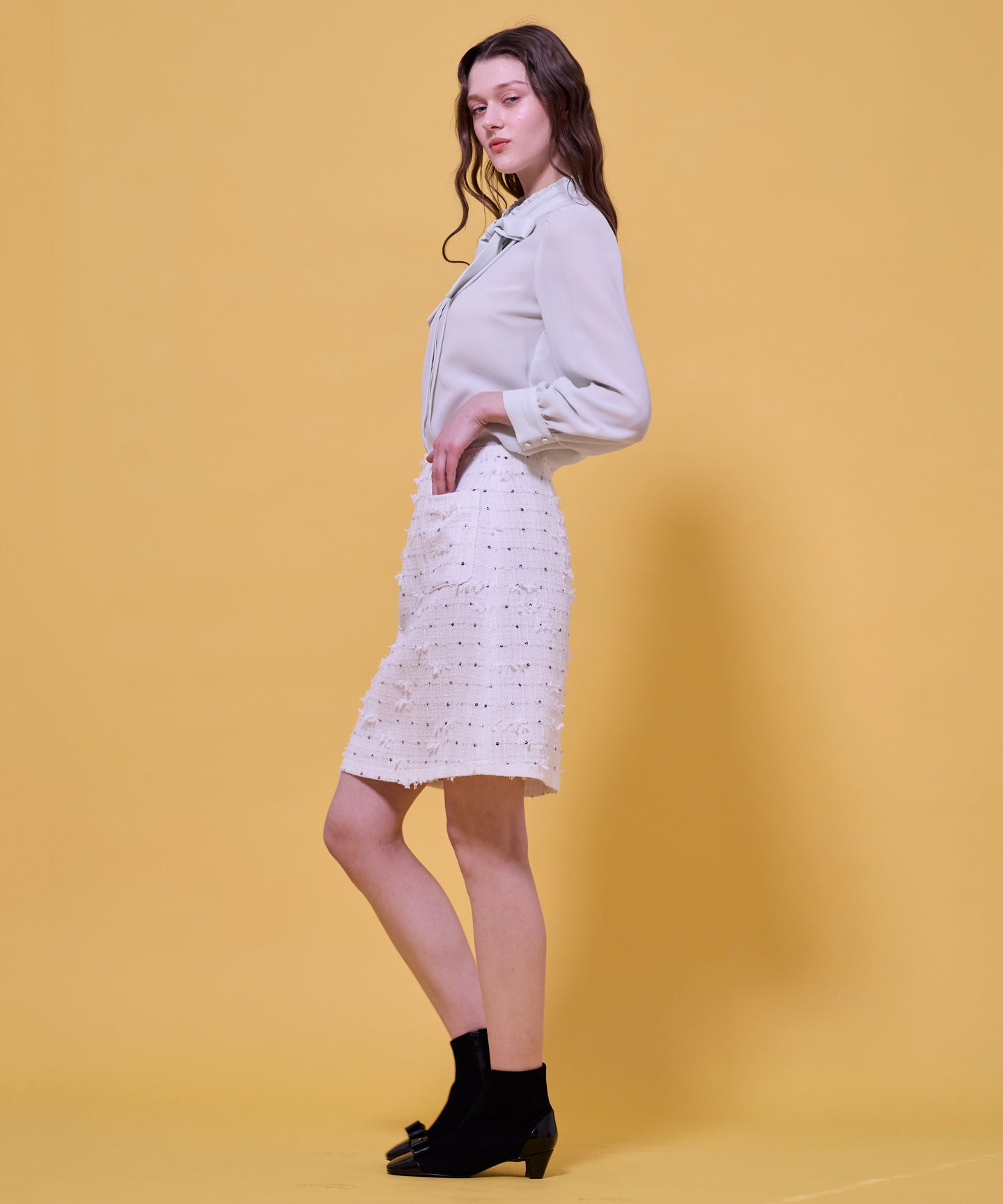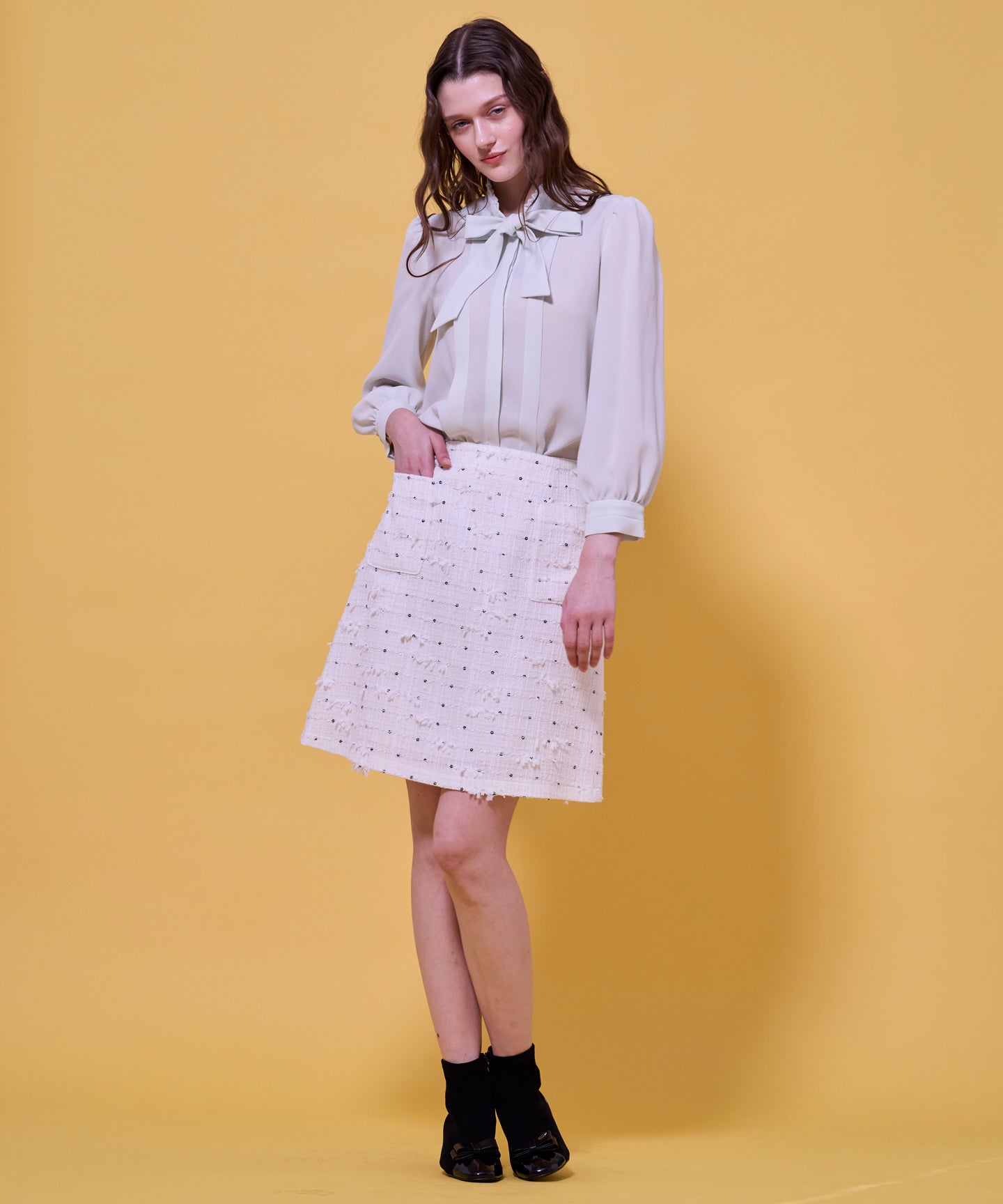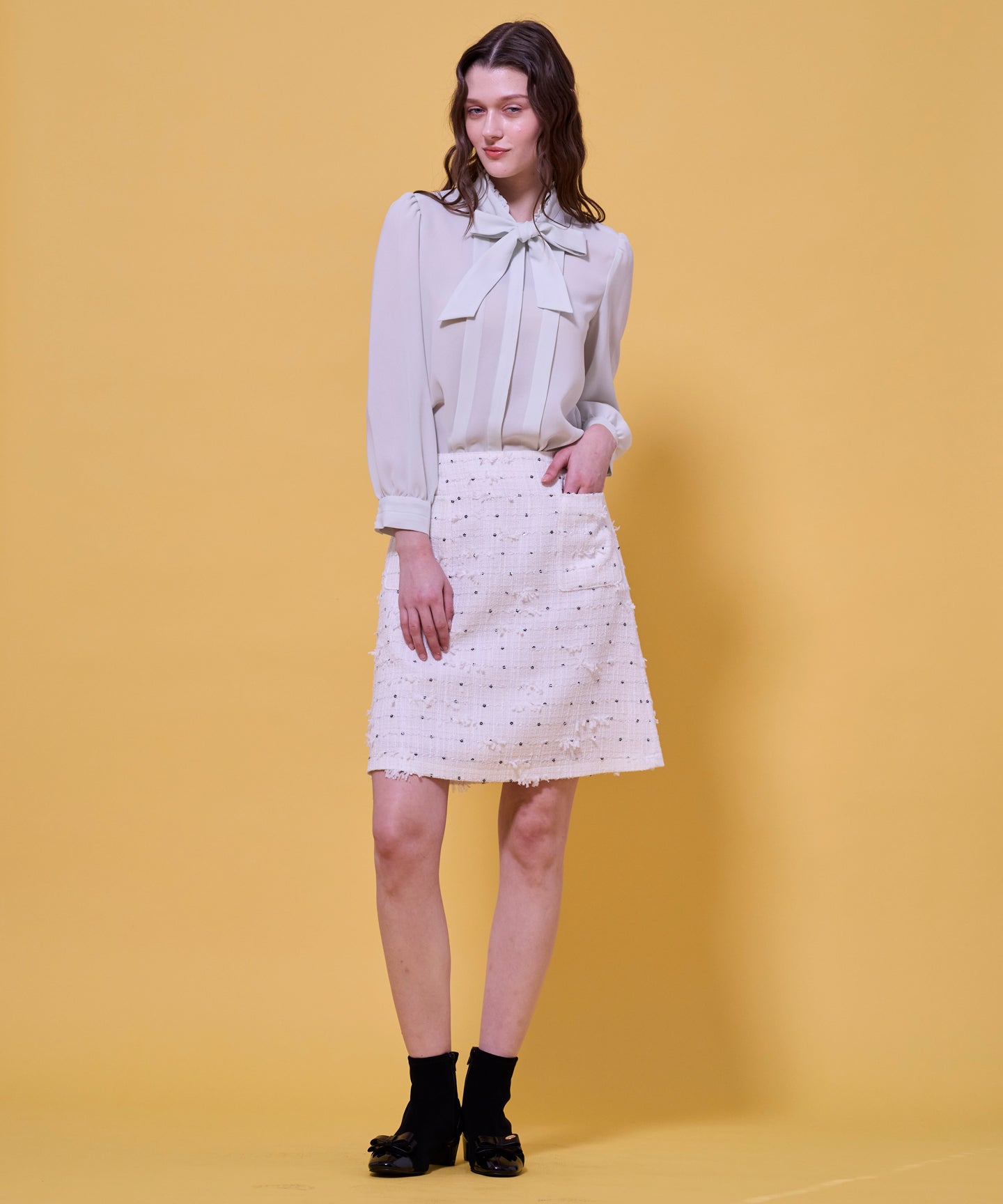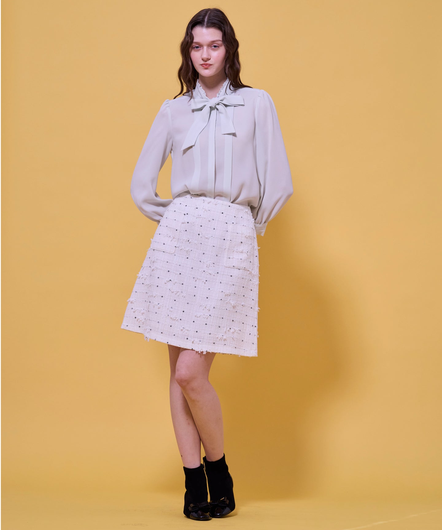 なめらかでパウダリーな素材を使用した上品なブラウス。 フロントにあしらったタックデザインが縦のラインを強調し、すっきりとしたシルエットを演出。さらに、大きめのボウタイがクラシカルなアクセントとなり、シンプルながらも印象的なスタイルを叶えます。ジャケットやカーディガンのインナーとしても上品に映え、きちんと感が求められる通勤や学校行事にもおすすめ。1枚で着ても華やかで、オンからオフまで幅広く活躍する万能な一着です。同素材でお作りしたドレスもございます。