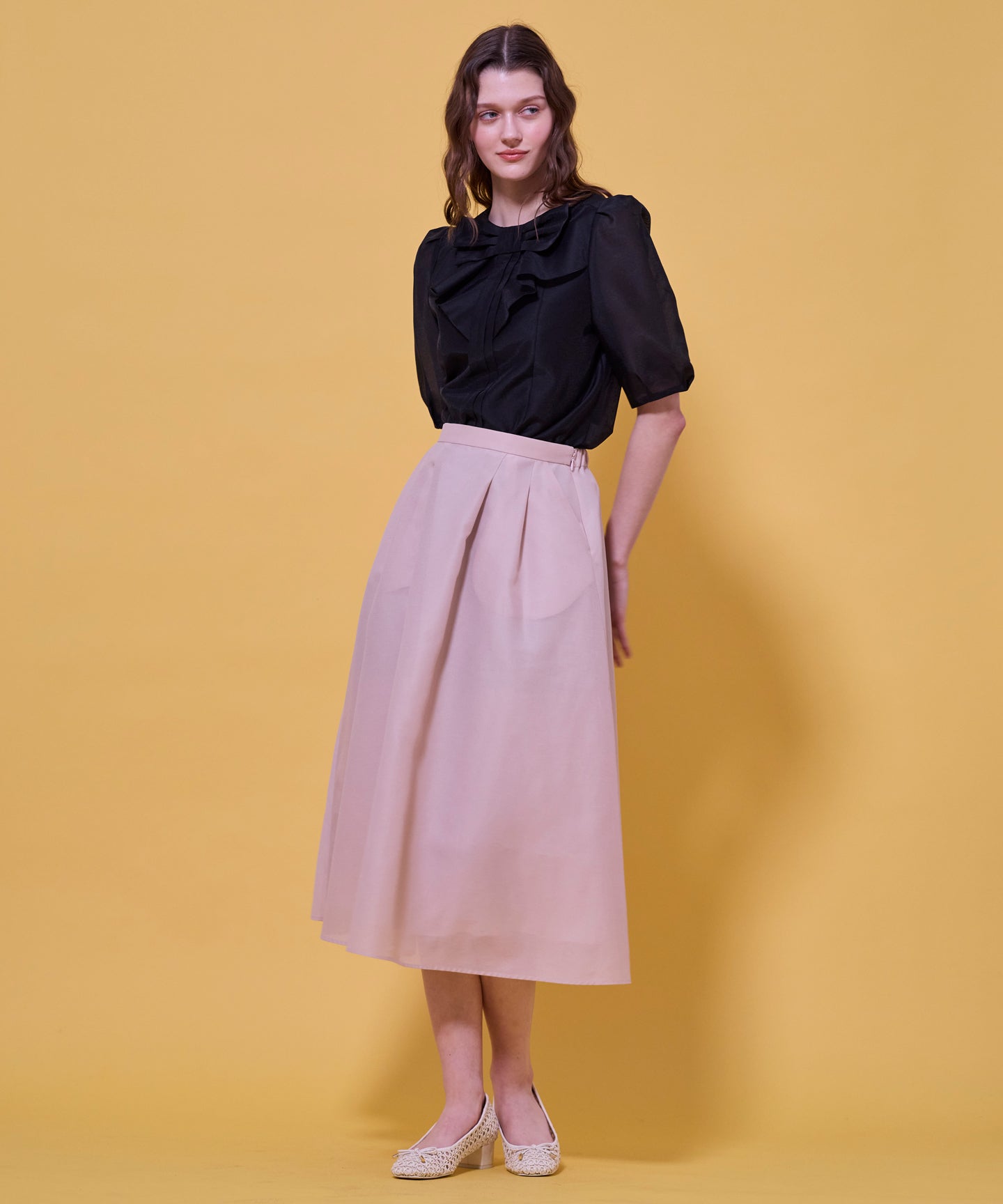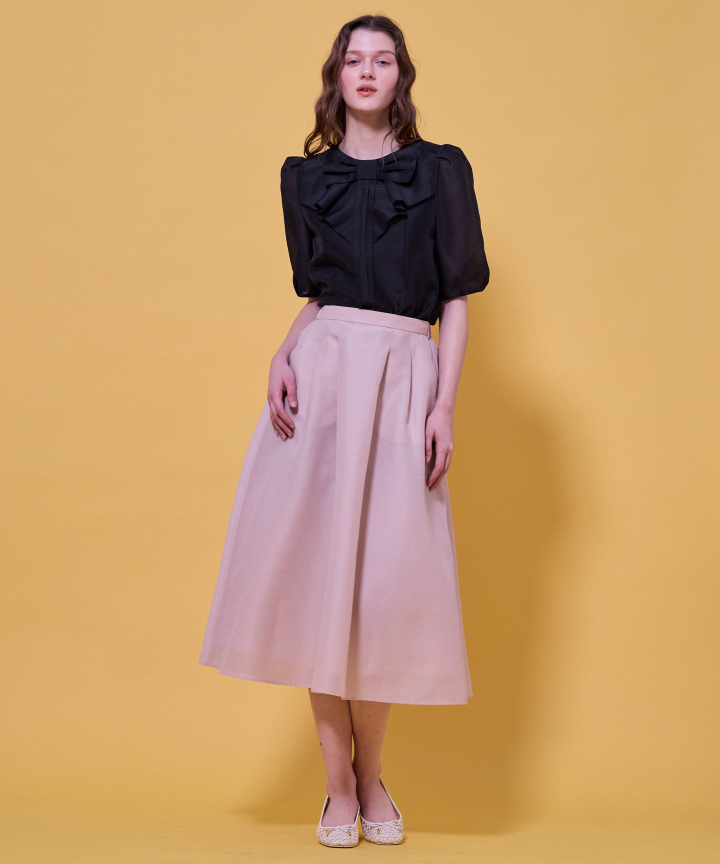 ハリのあるオーガンジー素材を使用しているため、リボンやフロントのタックデザインが立体的に際立ち、エレガントな存在感を放ちます。