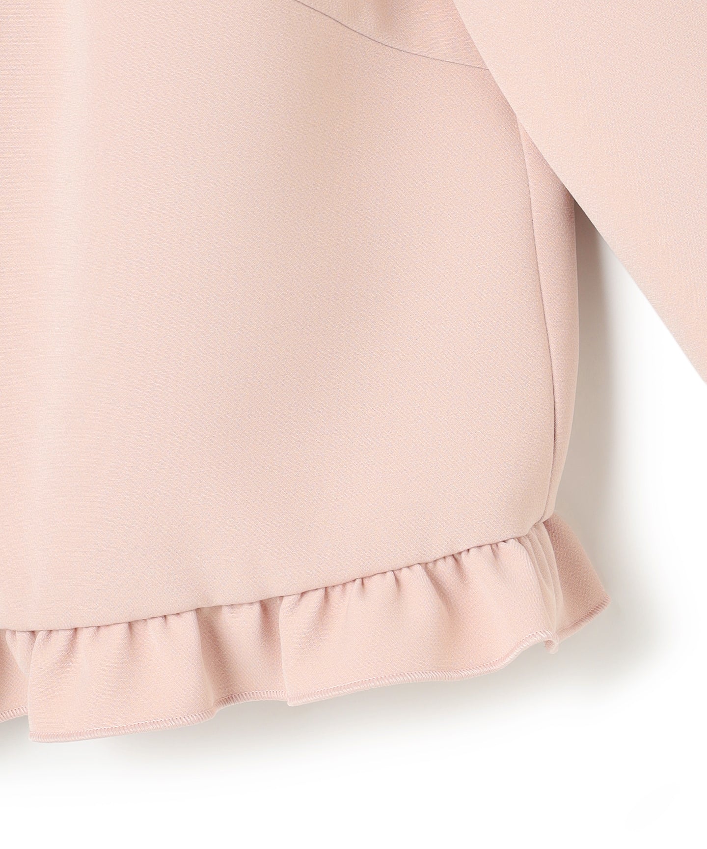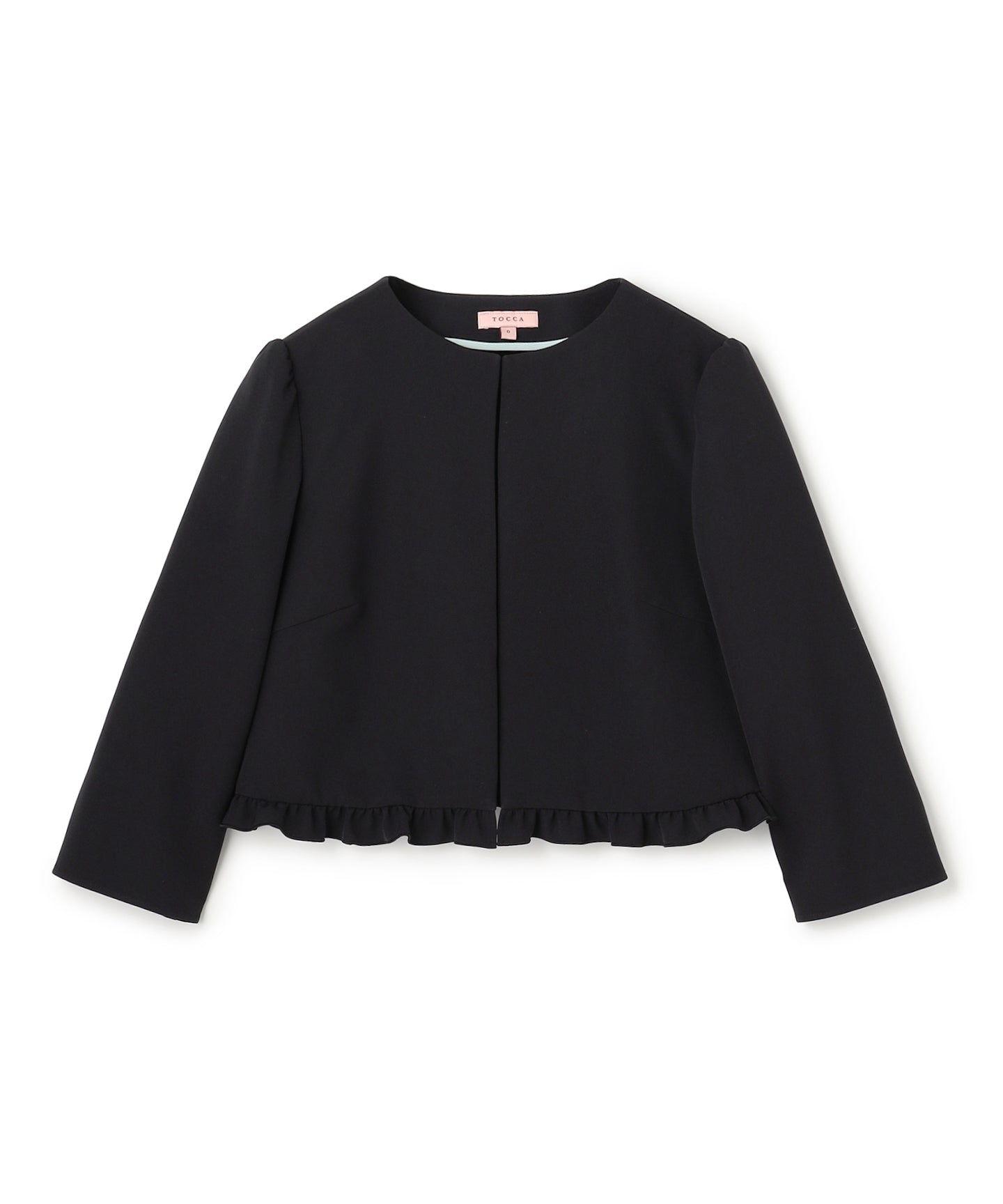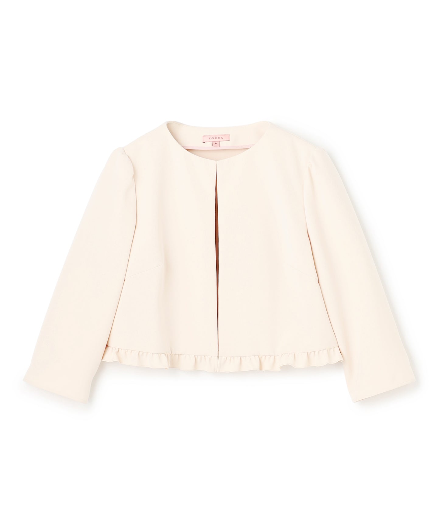 裾にあしらわれたフリルが可憐なアクセントを添える、フェミニンな印象のボレロ。羽織るだけで華やかさときちんと感を両立できる一枚です。 シンプルなノーカラーデザインにコンパクトなシルエットで、ドレススタイルをすっきりと上品に引き立て、さらりとした素材感で着心地も軽やか。手首を華奢に見せ、女性らしい抜け感を演出してくれます。
