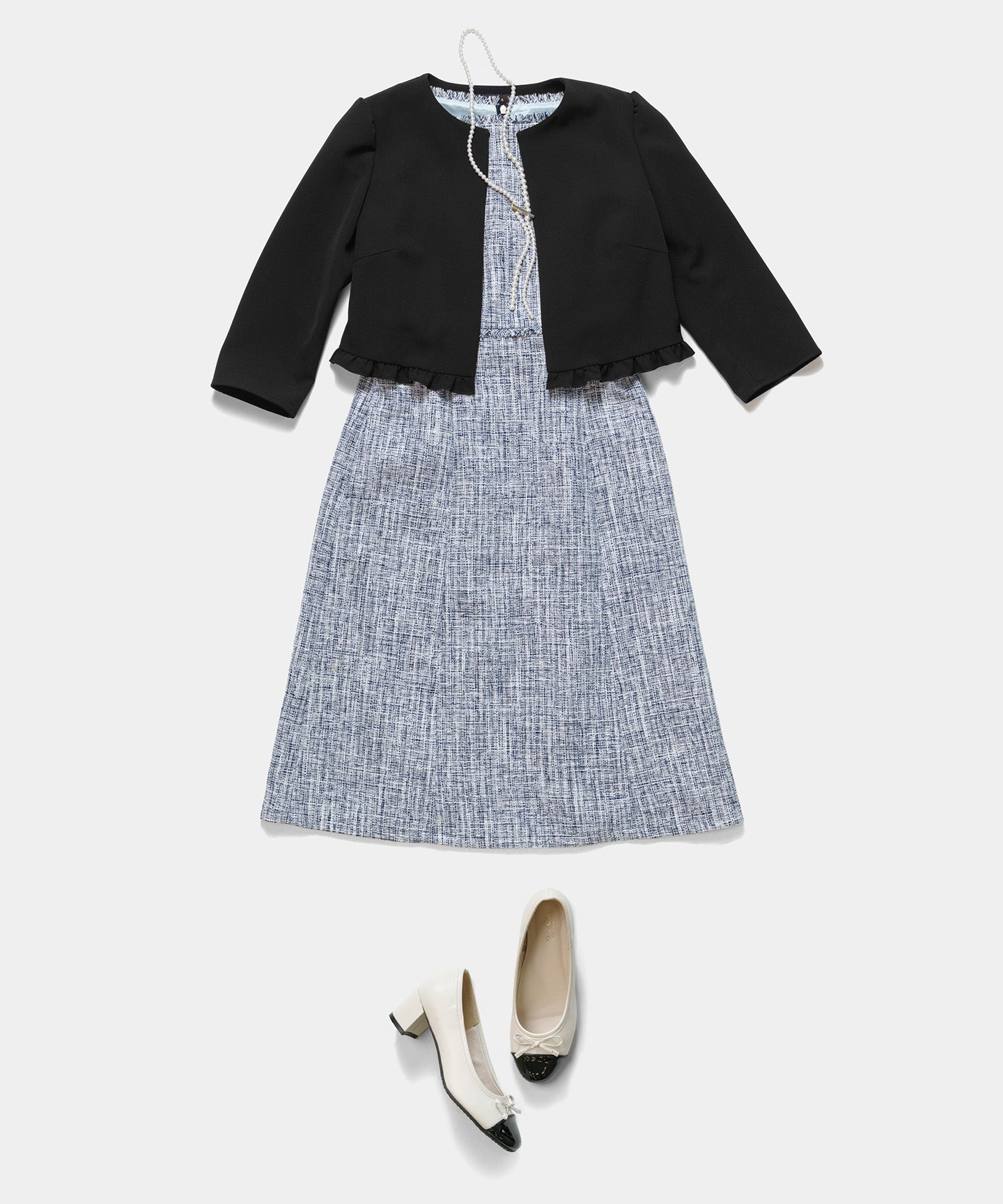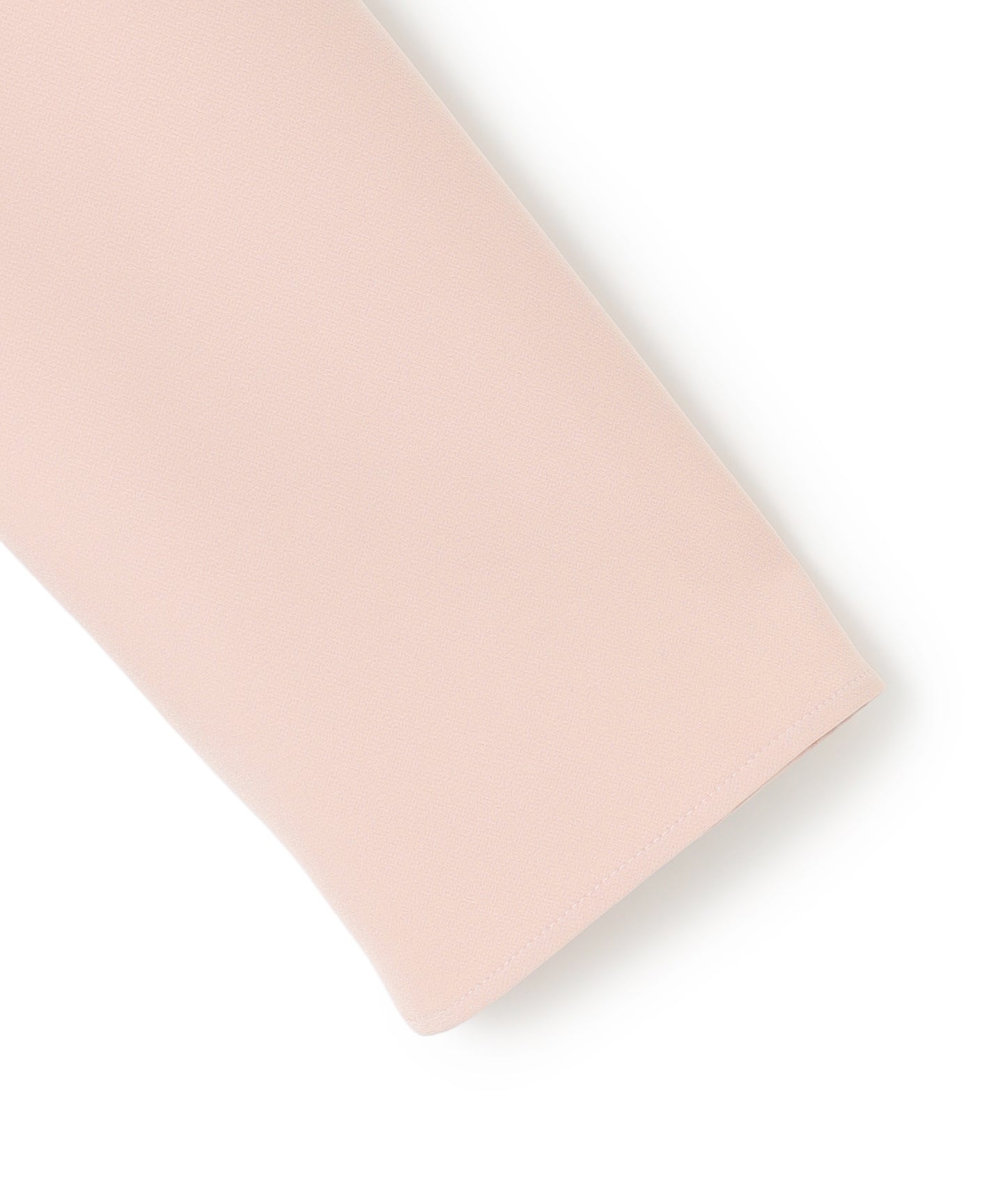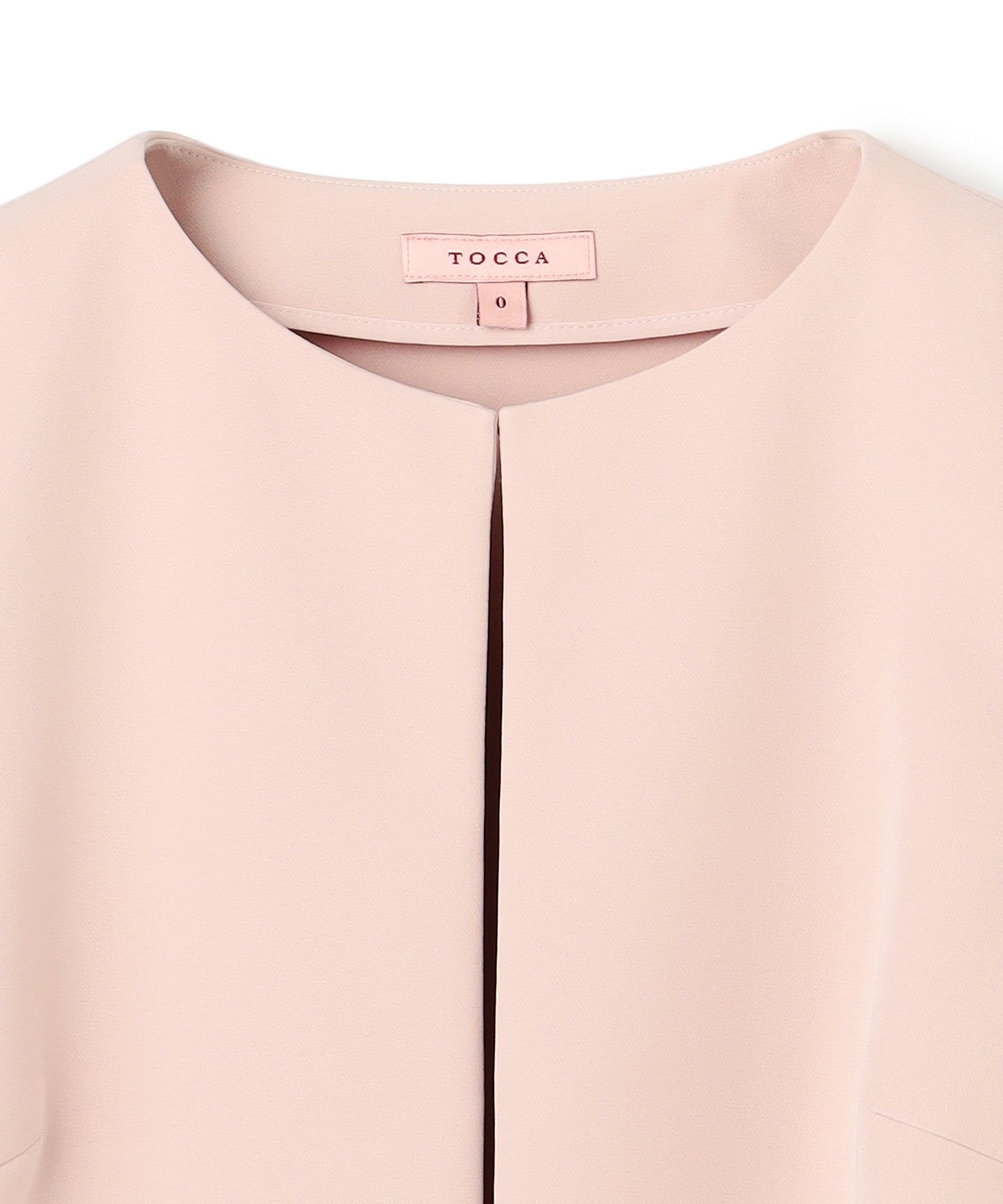 裾にあしらわれたフリルが可憐なアクセントを添える、フェミニンな印象のボレロ。羽織るだけで華やかさときちんと感を両立できる一枚です。 シンプルなノーカラーデザインにコンパクトなシルエットで、ドレススタイルをすっきりと上品に引き立て、さらりとした素材感で着心地も軽やか。手首を華奢に見せ、女性らしい抜け感を演出してくれます。