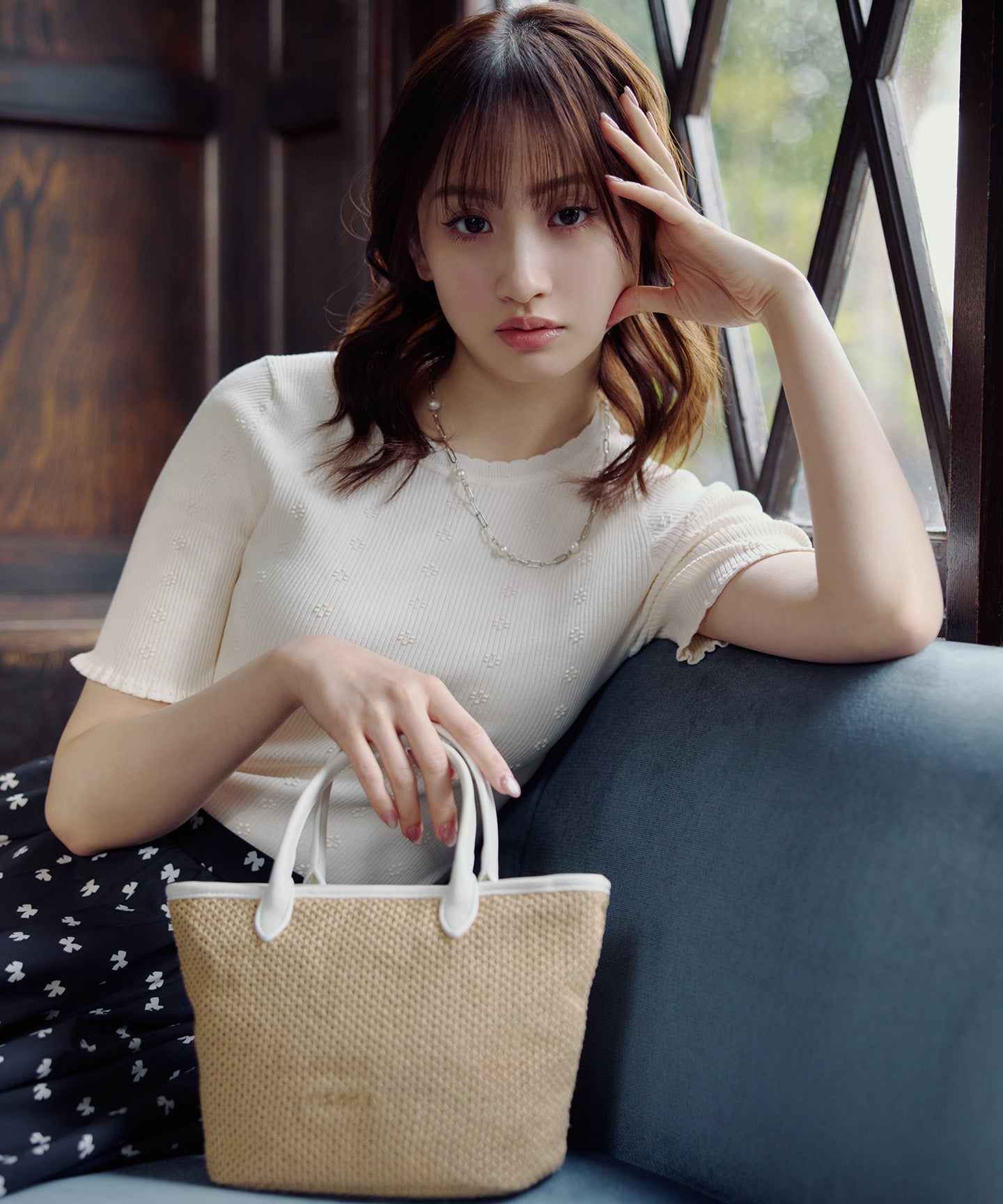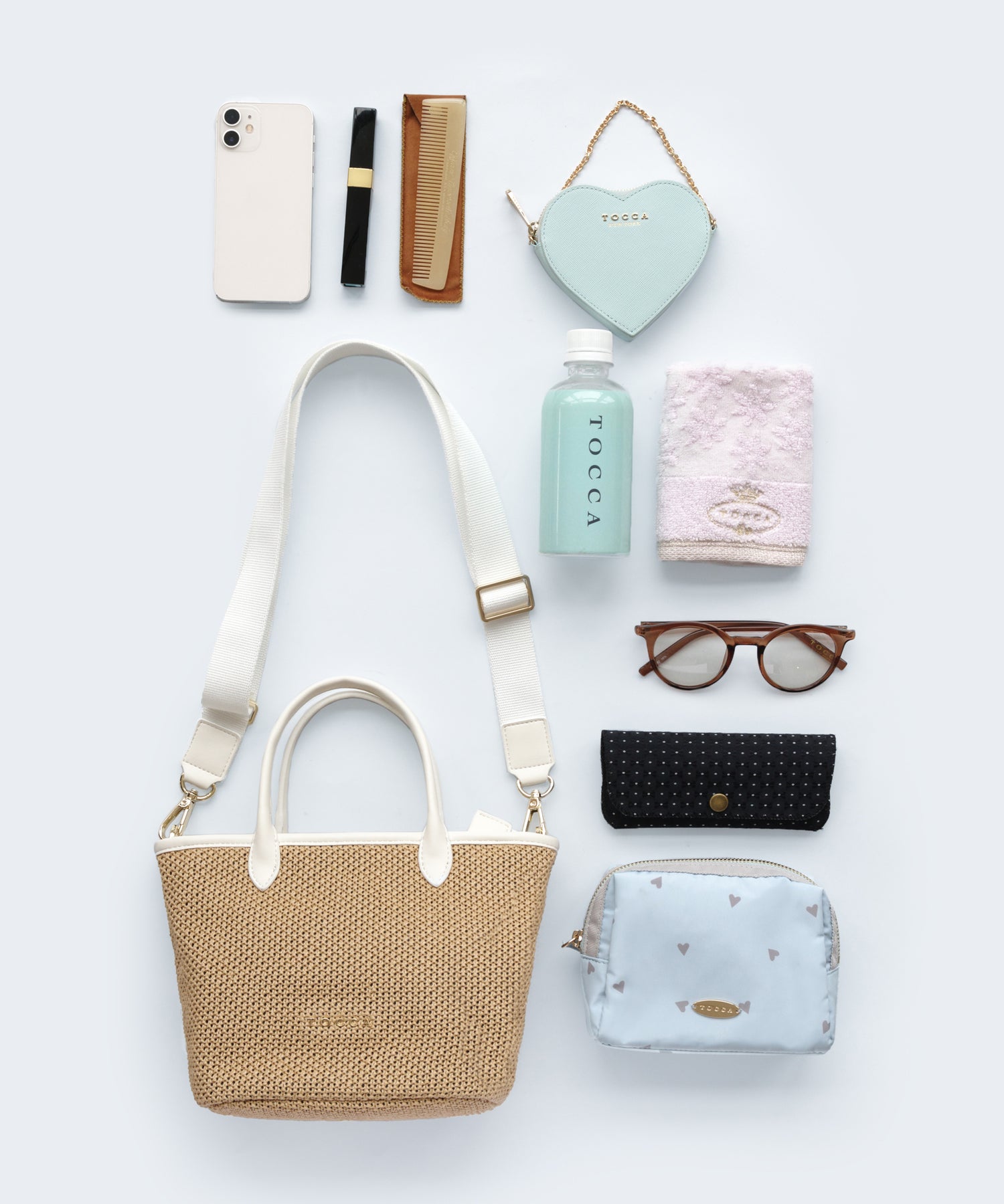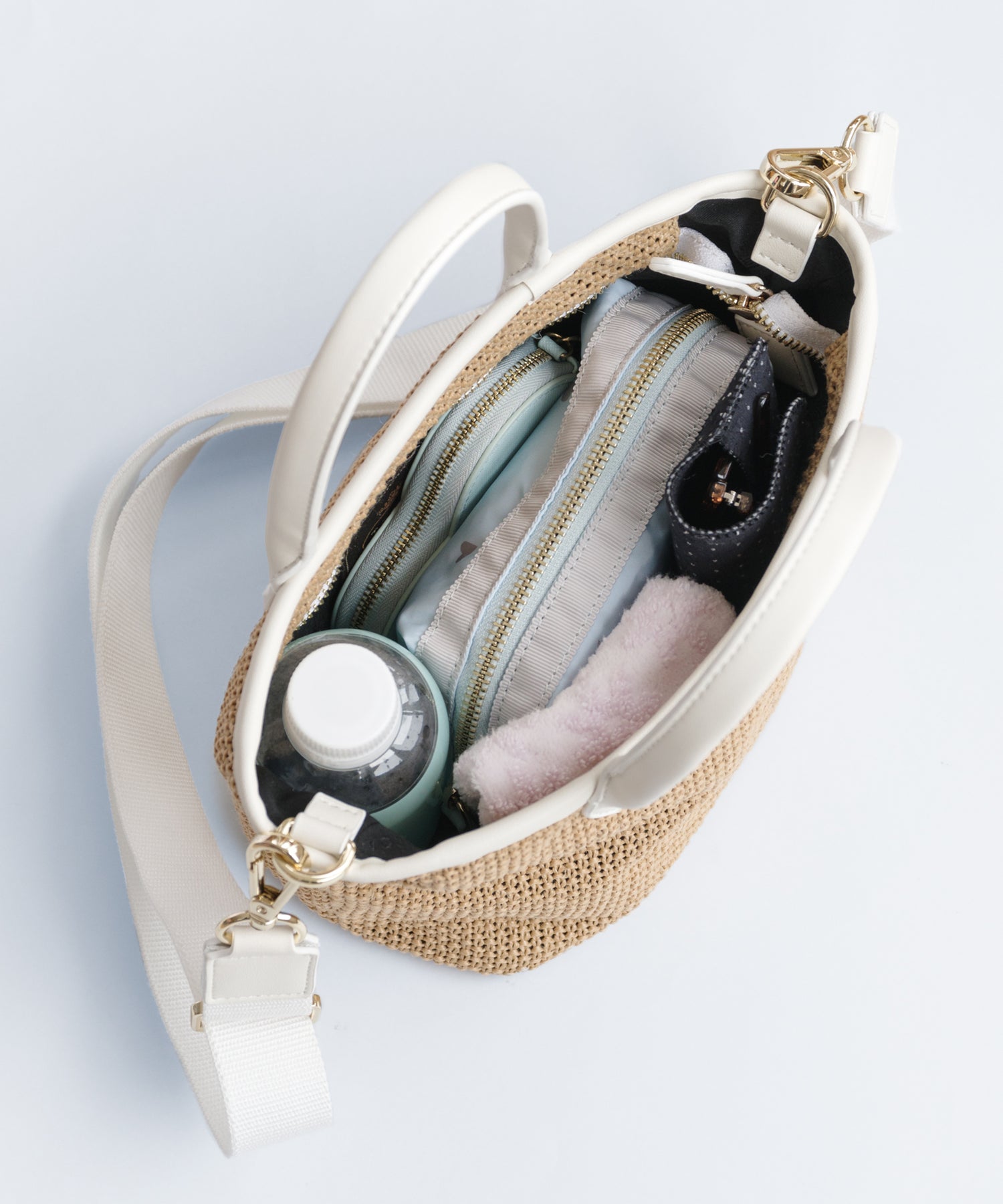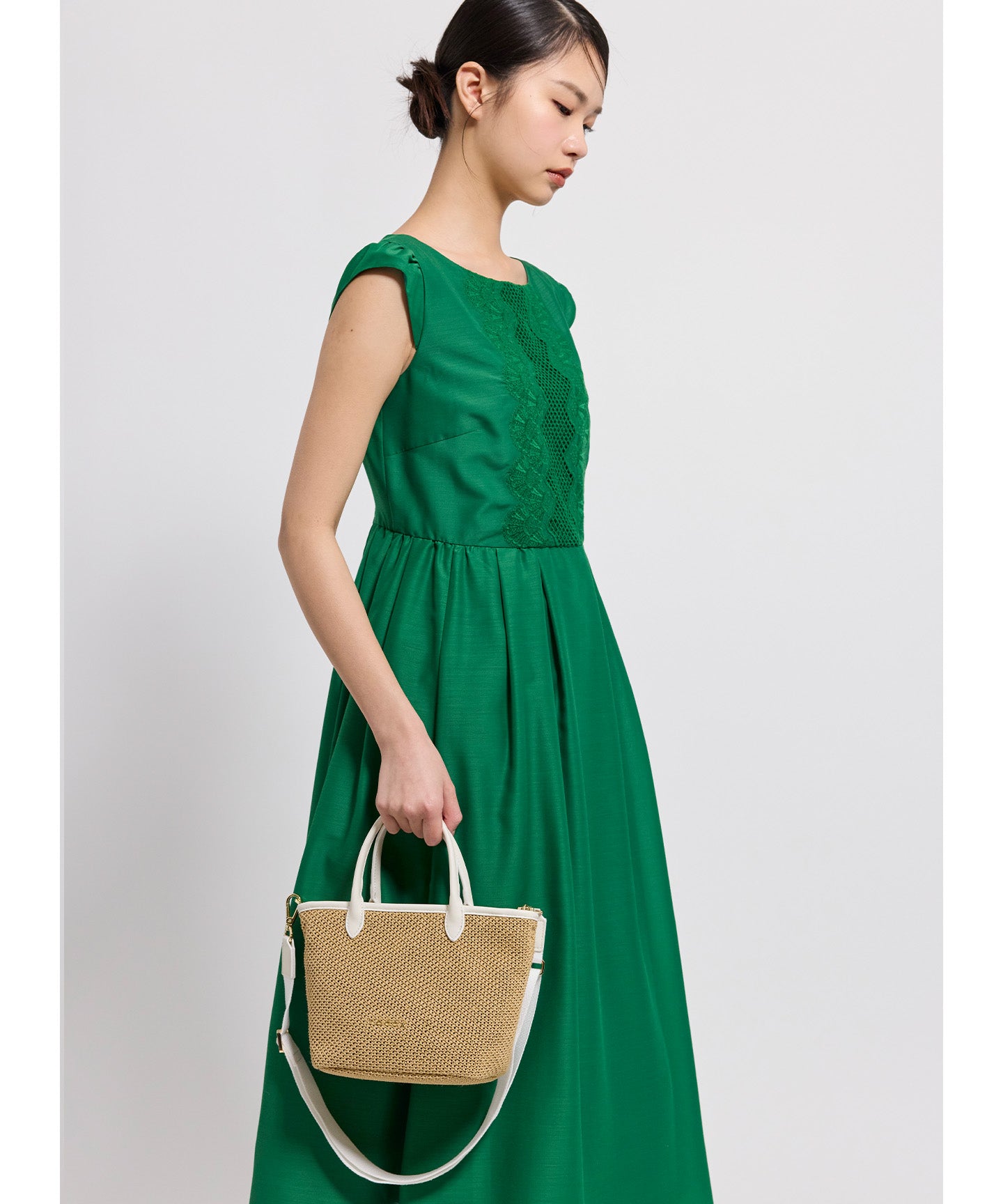 ベースの素材はベーシックなベージュのほかにモダンなチェック柄をチョイスし、モノトーンのパイピング・ハンドルカラーがアクセントに。きれいめはもちろん、カジュアルなスタイリングとも好相性で、ラフになりがちな夏のスタイリングを美しく彩ってくれるアイテムです。