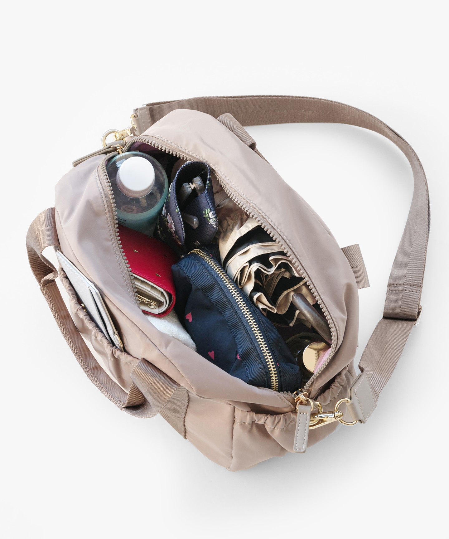 取り外し可能なショルダーテープでハンズフリーが叶い、軽量のナイロン素材を使用しているのでバッグ本体はとっても軽やか。