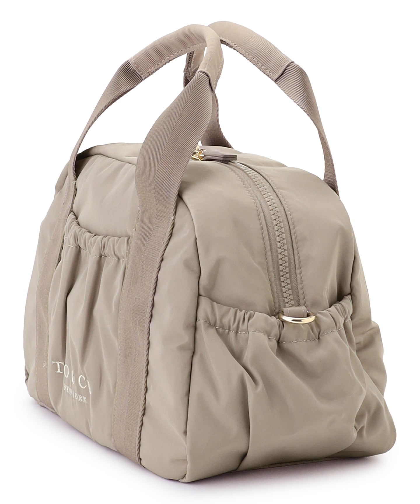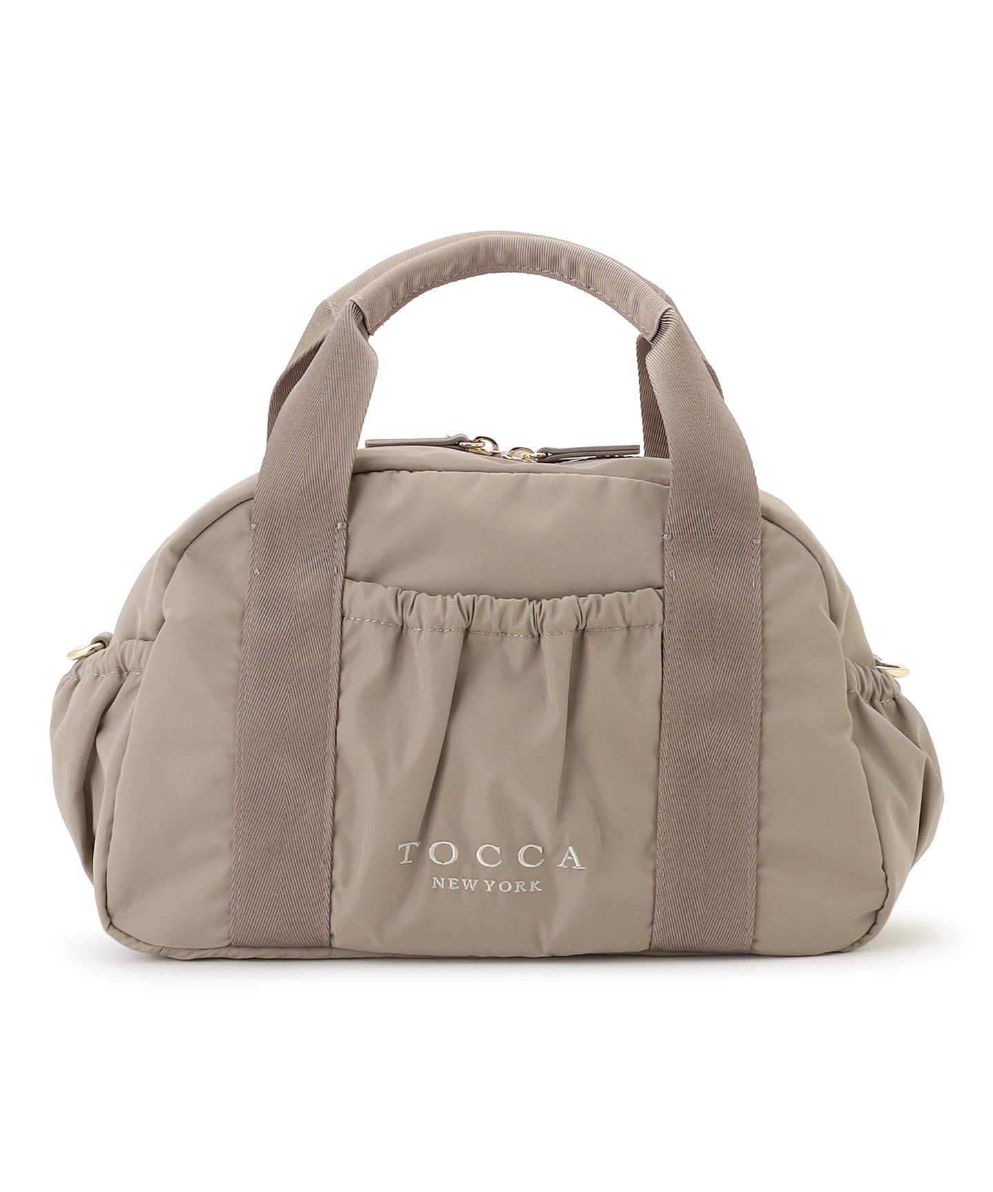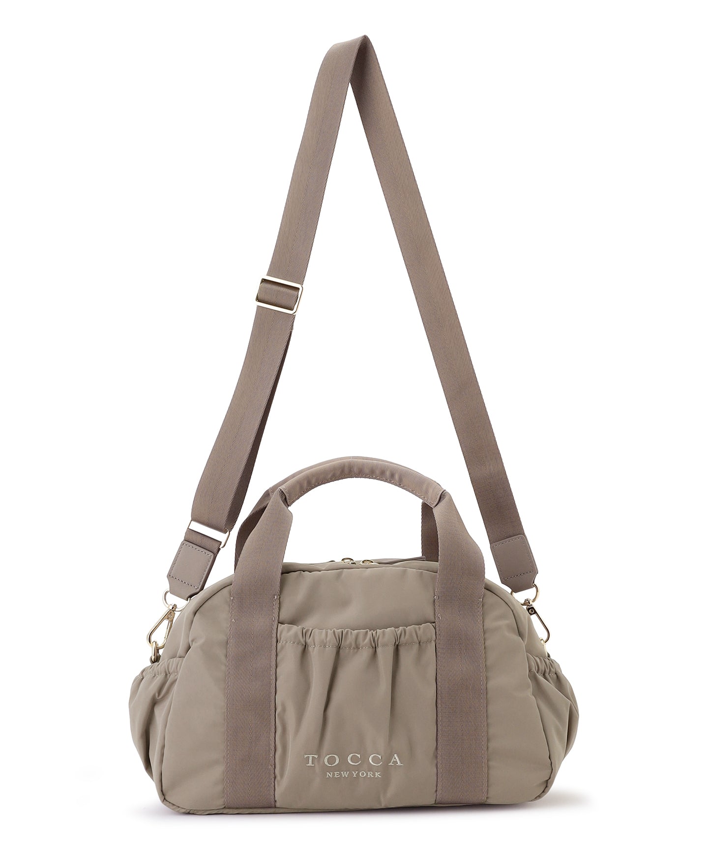 コロンとしたフォルムやポケットのギャザーディテールがほんのりフェミニンな、程よいサイズのボストンバッグ。