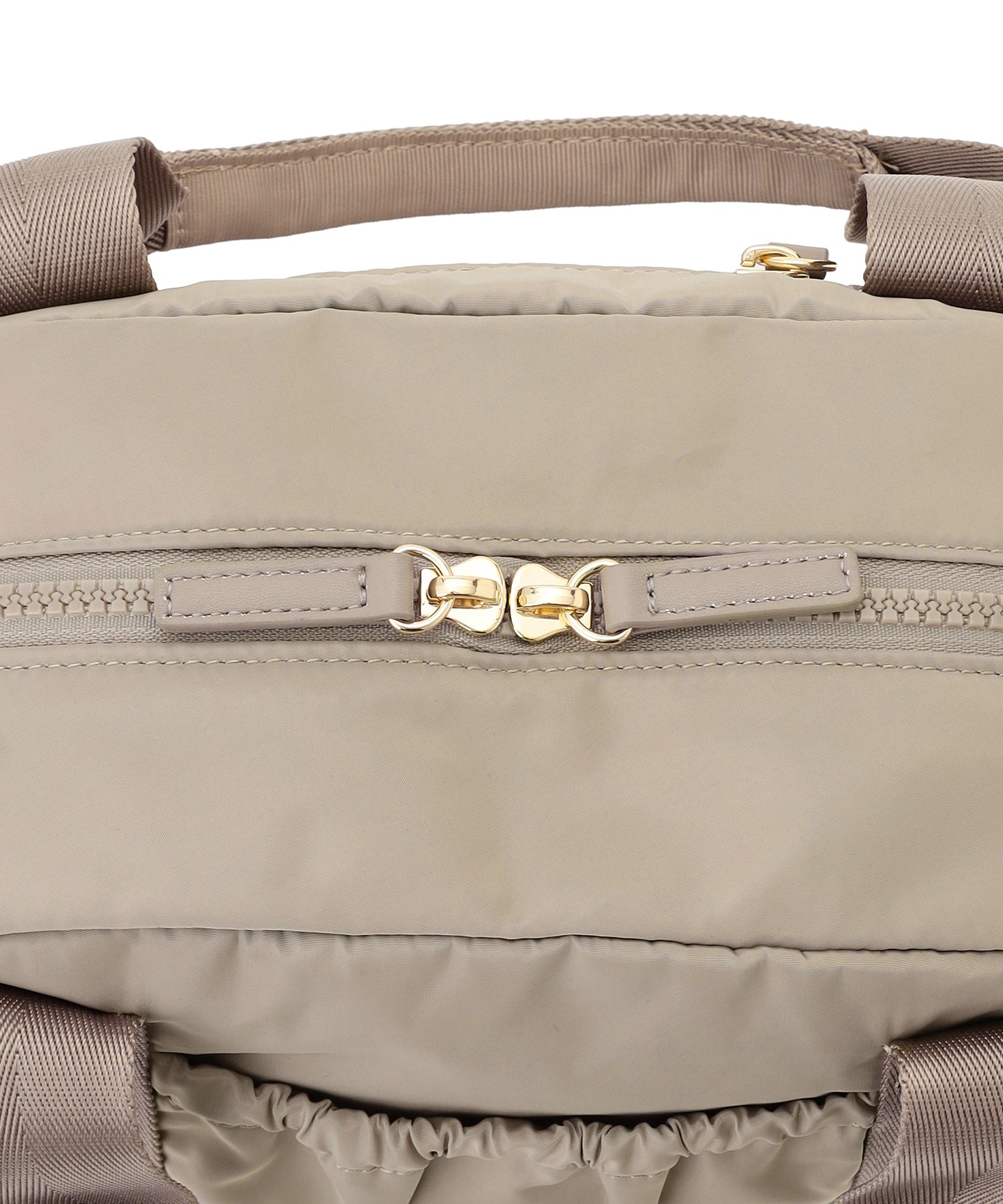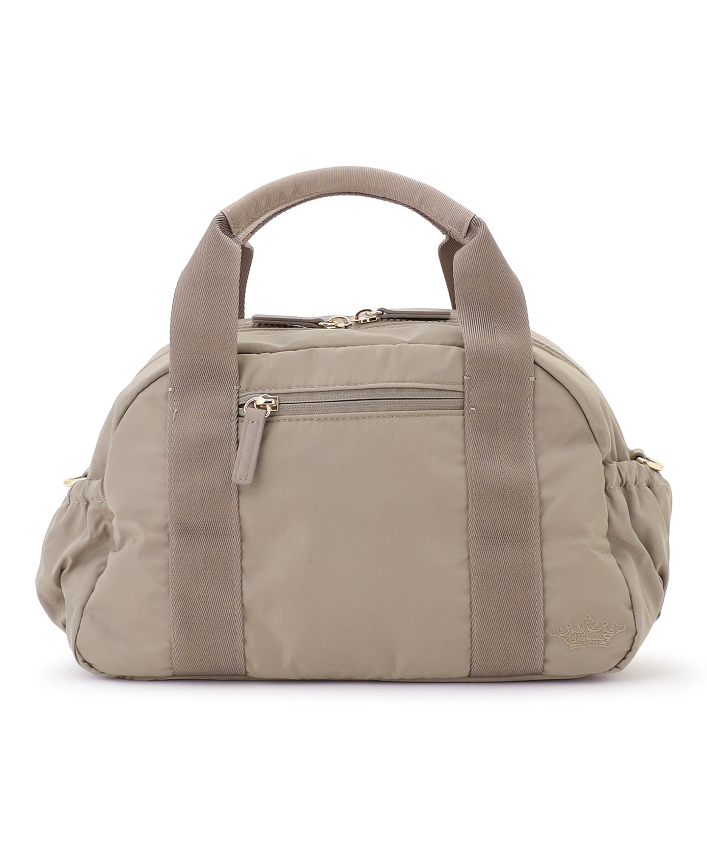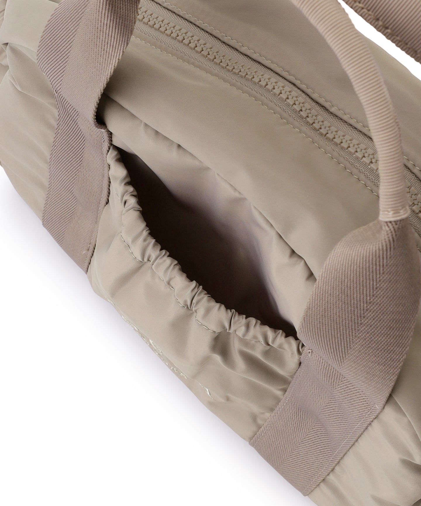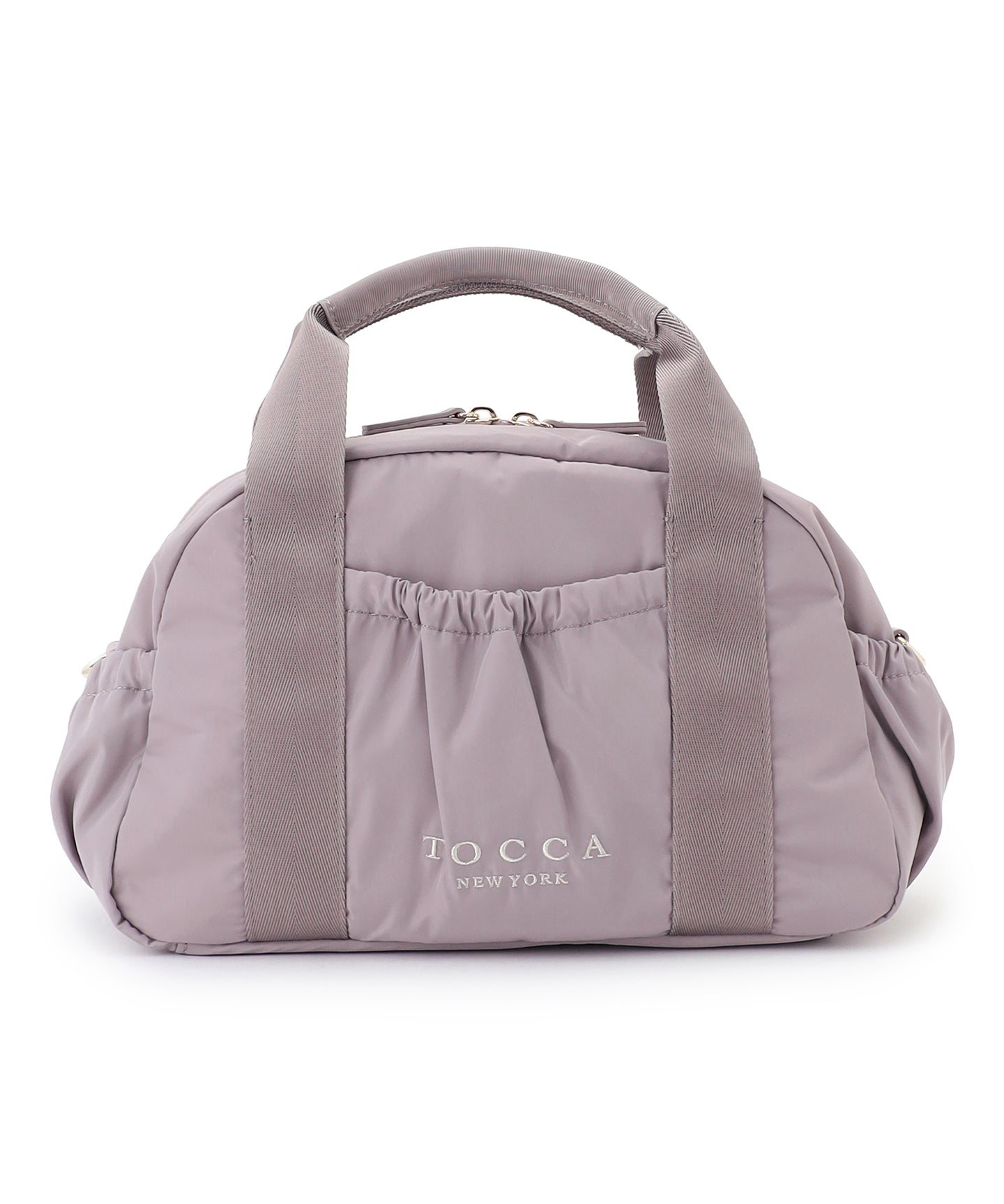 コロンとしたフォルムやポケットのギャザーディテールがほんのりフェミニンな、程よいサイズのボストンバッグ。