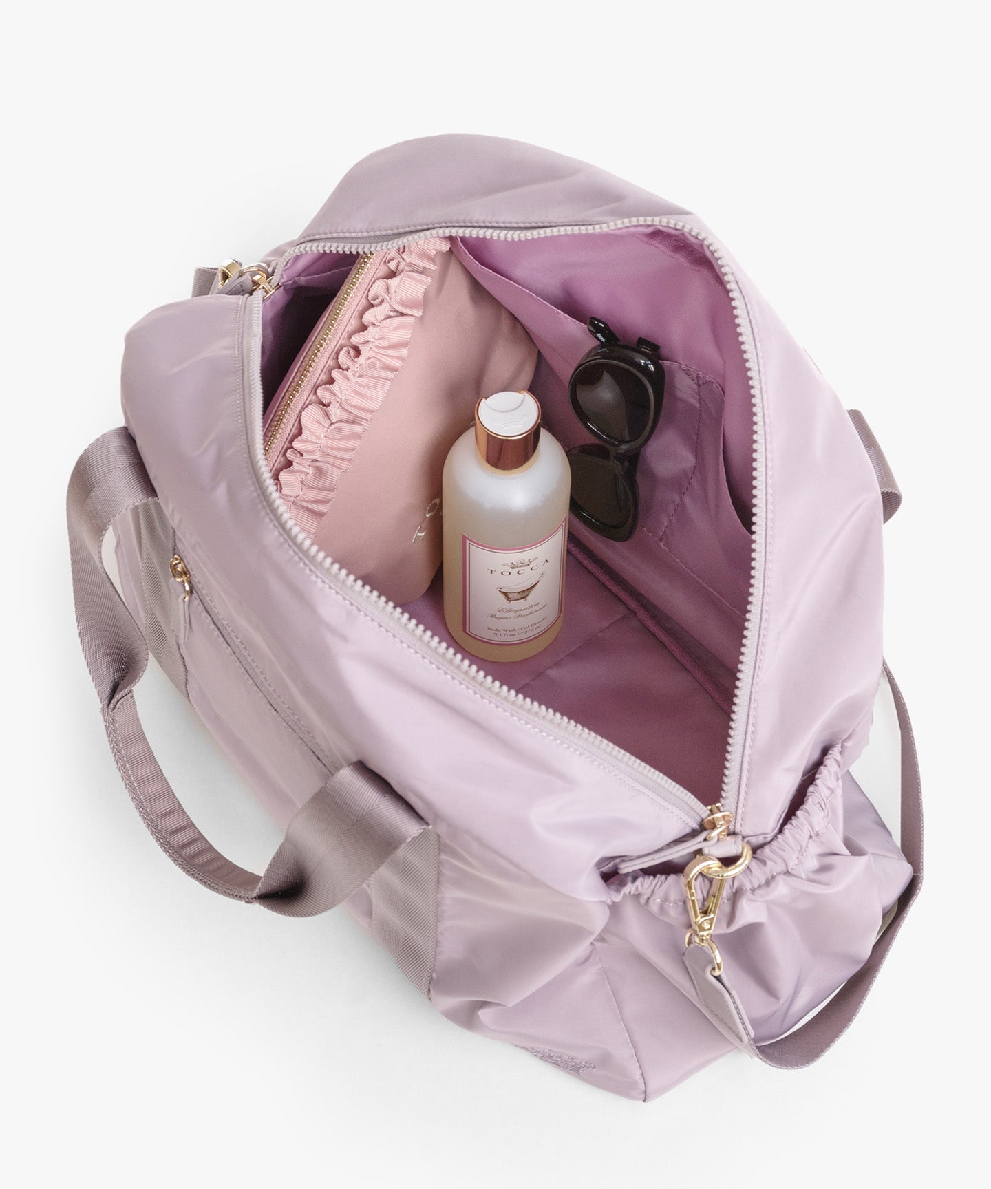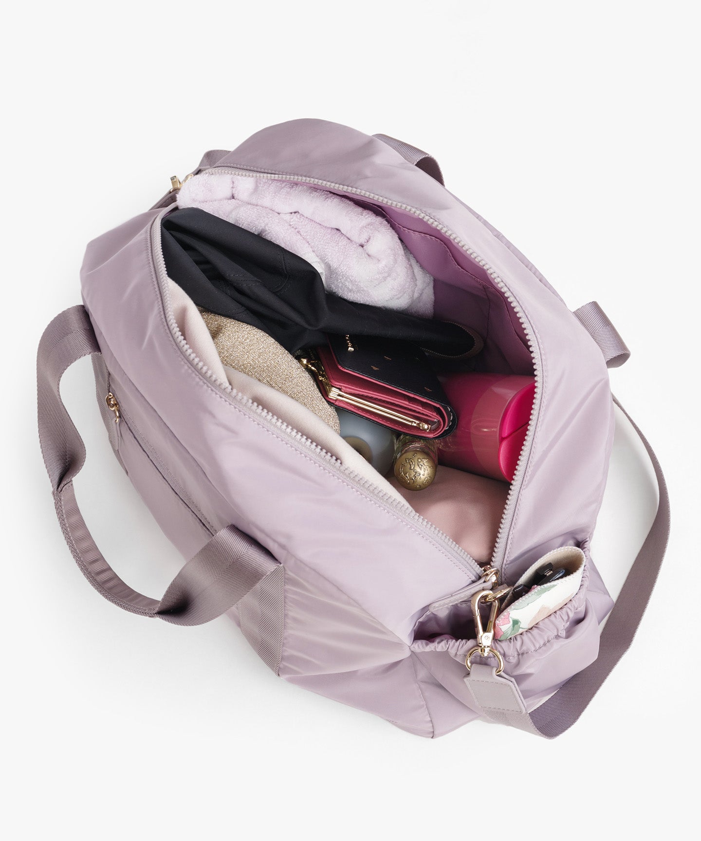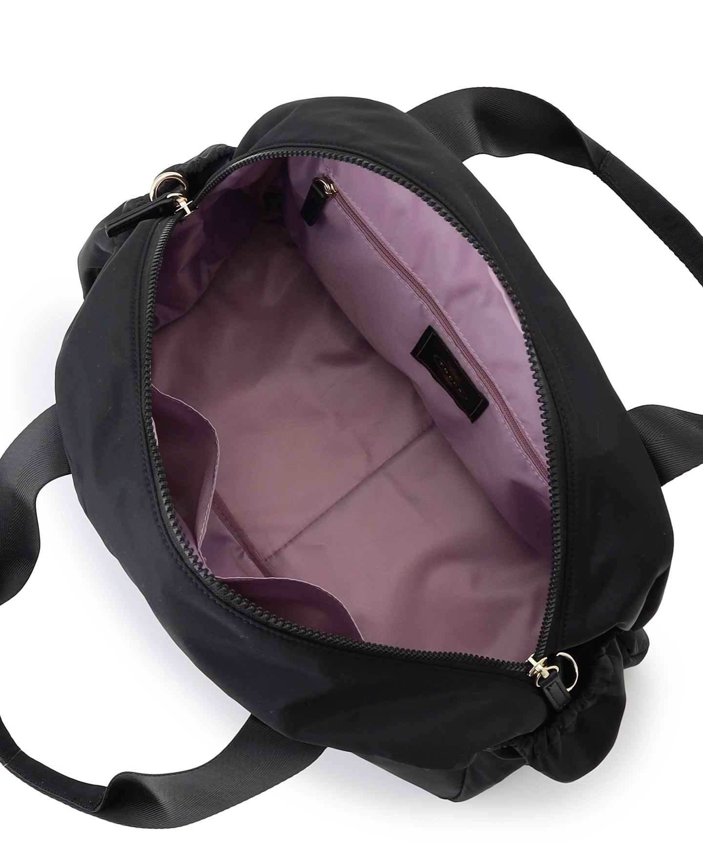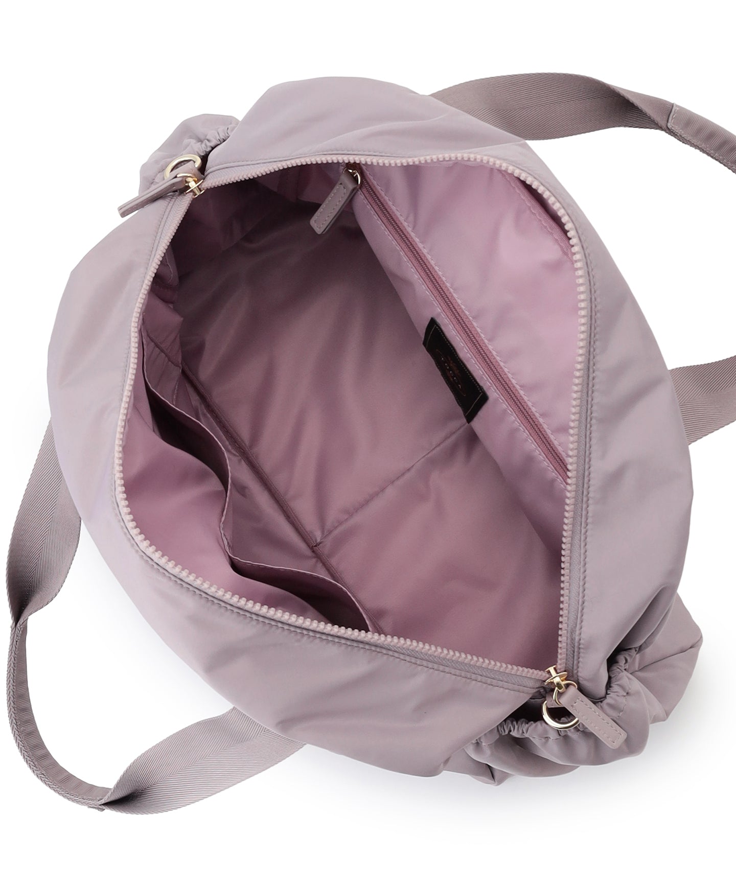 コロンとしたフォルムやポケットのギャザーディテールがほんのりフェミニンな、程よいサイズのボストンバッグ。外側は前後・左右すべてにポケットを付け、内側にもオープン・ファスナーポケットを装備。マチがしっかりありペットボトルや水筒、長財布や折り畳み傘など身の回りのものをたっぷり入れられ、見た目以上の収納力です。 取り外し可能なショルダーテープでハンズフリーが叶い、軽量のナイロン素材を使用しているのでバッグ本体はとっても軽やか。デイリーはもちろんご旅行先でも活躍する便利なアイテムです。