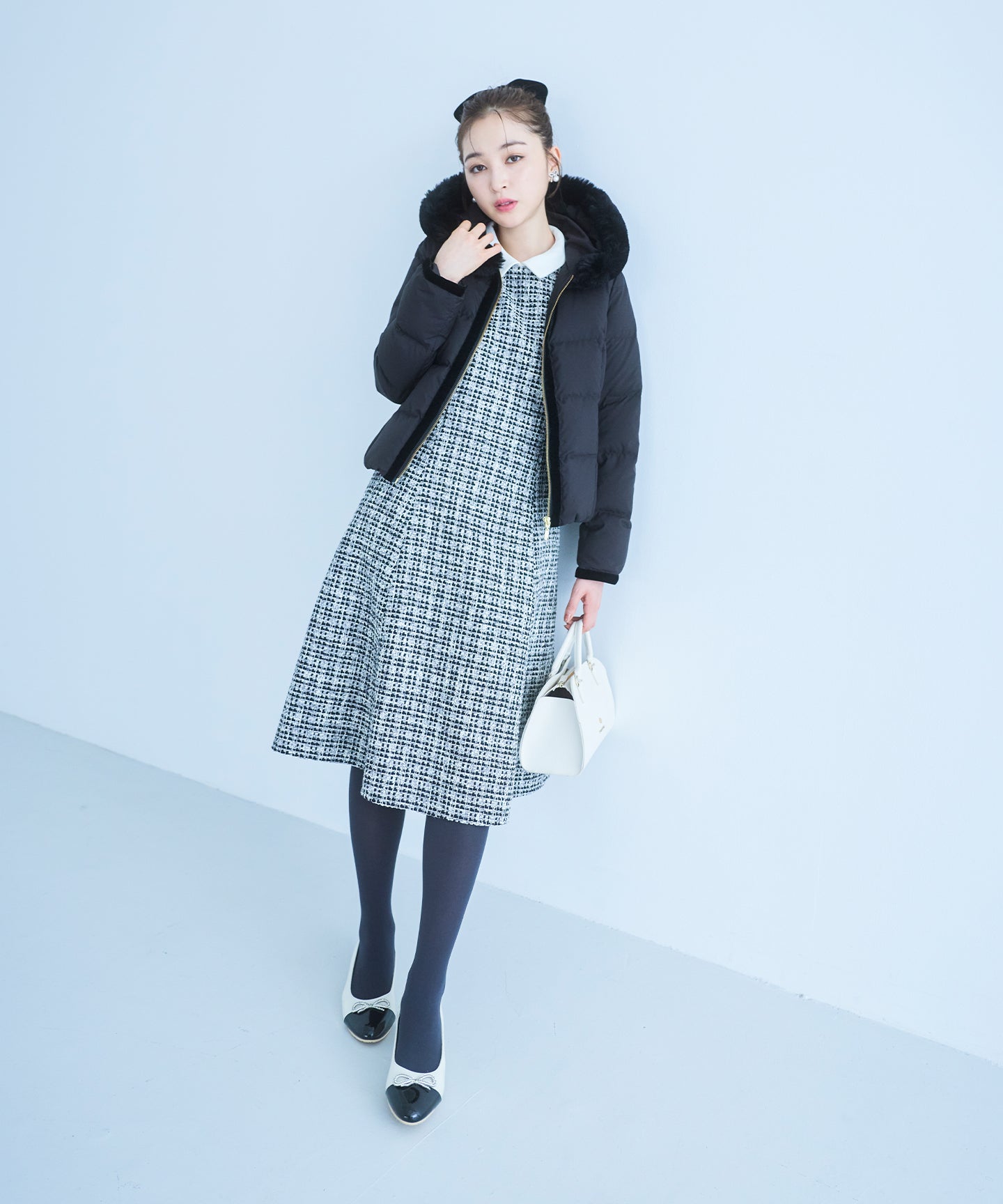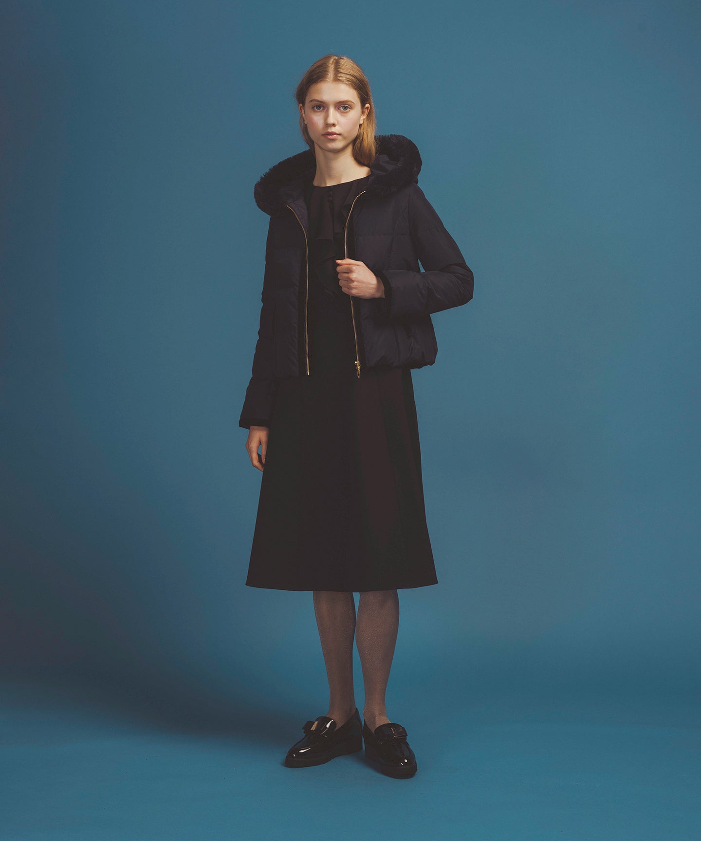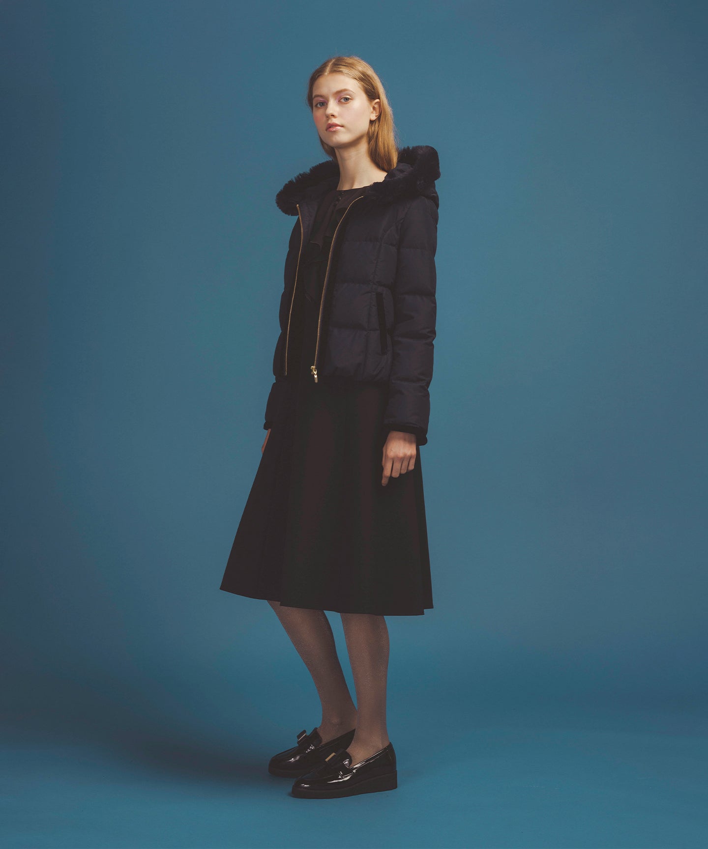 細部にまでこだわったディテールが、クラシックでエレガントな印象を引き立て、他にはない特別感を演出します。 ドレスやスカートと相性の良いコンパクトな丈感も、このダウンの大きな魅力。腰位置が高く見えることで、自然と脚長効果も生まれ、全体のバランスが美しく整います。スカートスタイルにはもちろん、ハイウエストのパンツと合わせたメリハリのある着こなしにも最適。