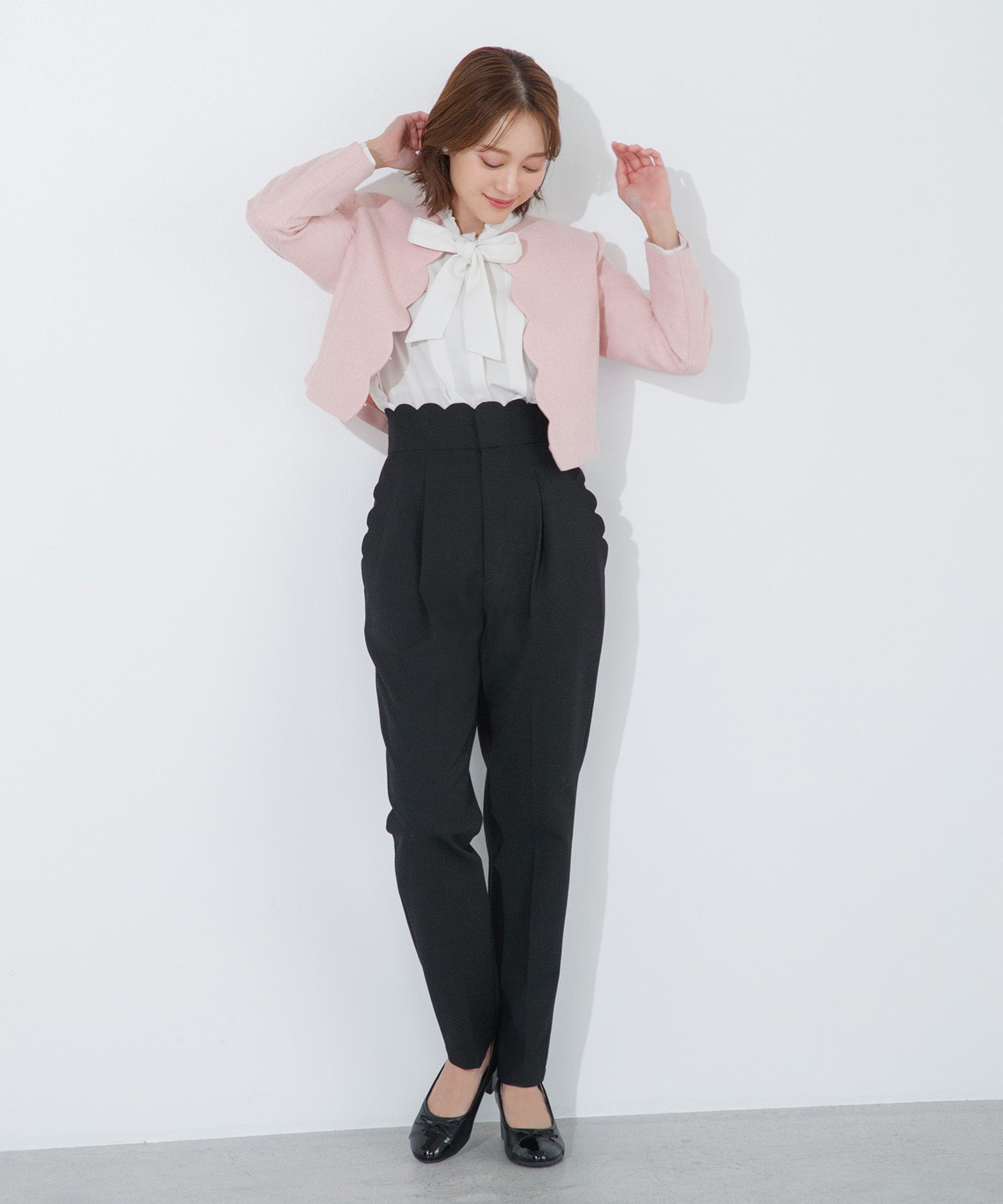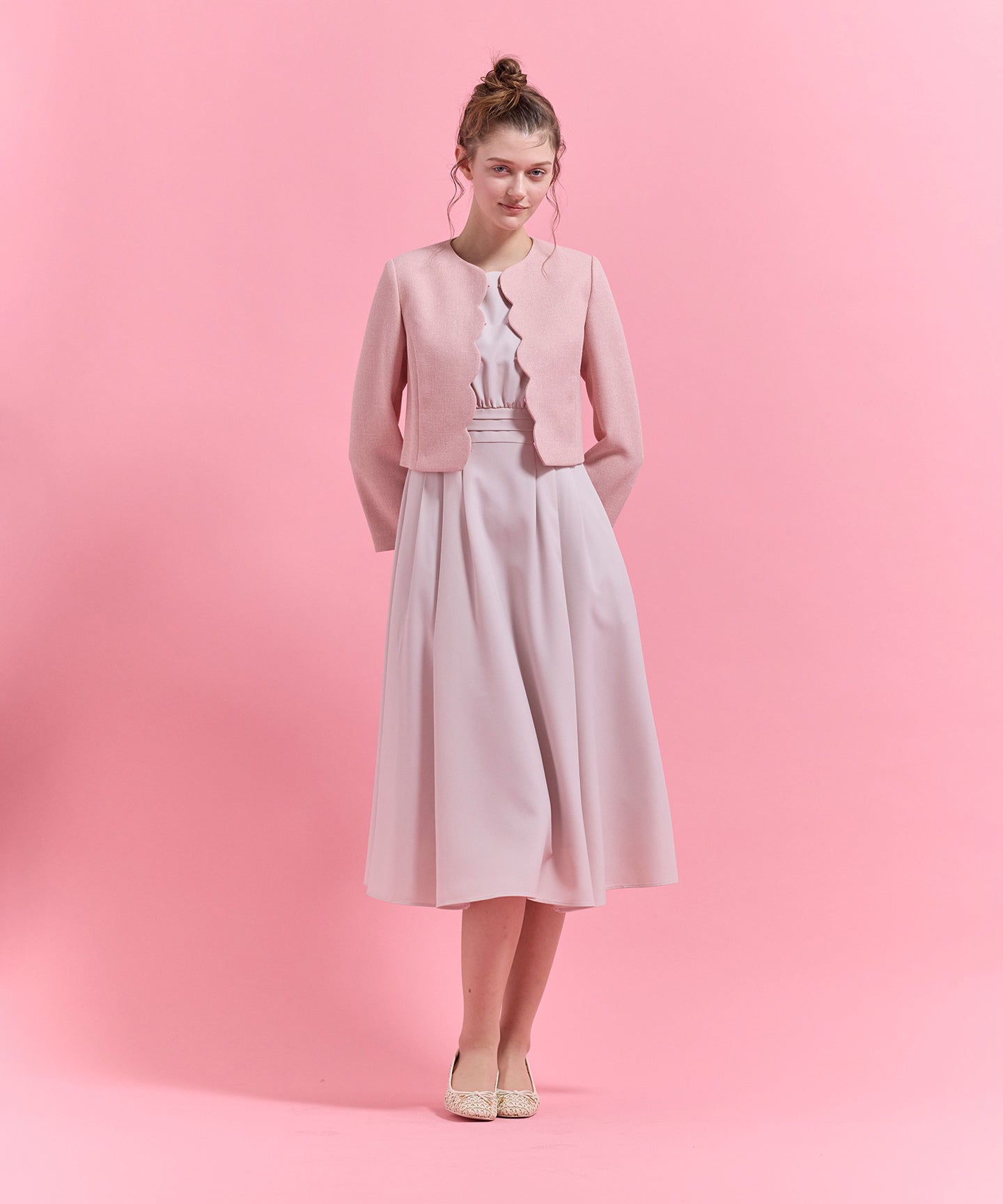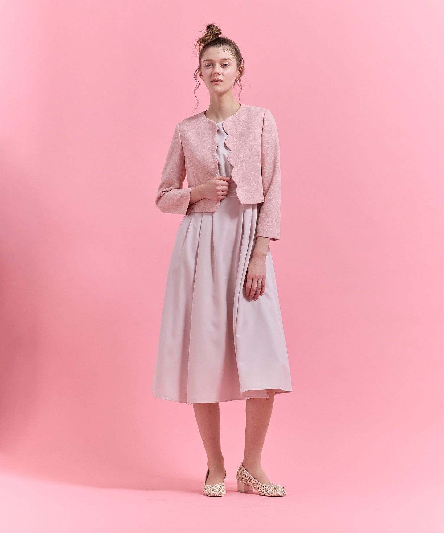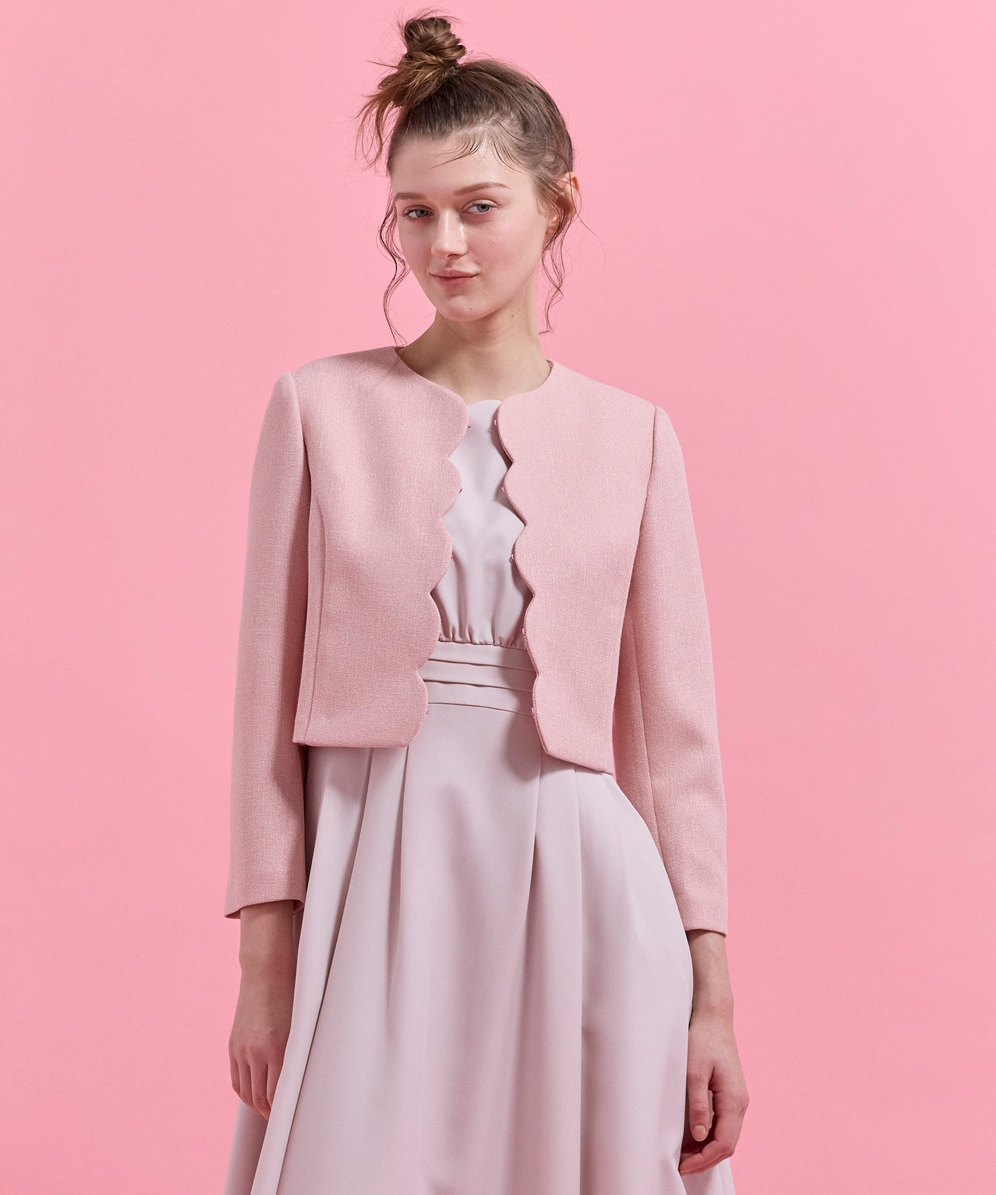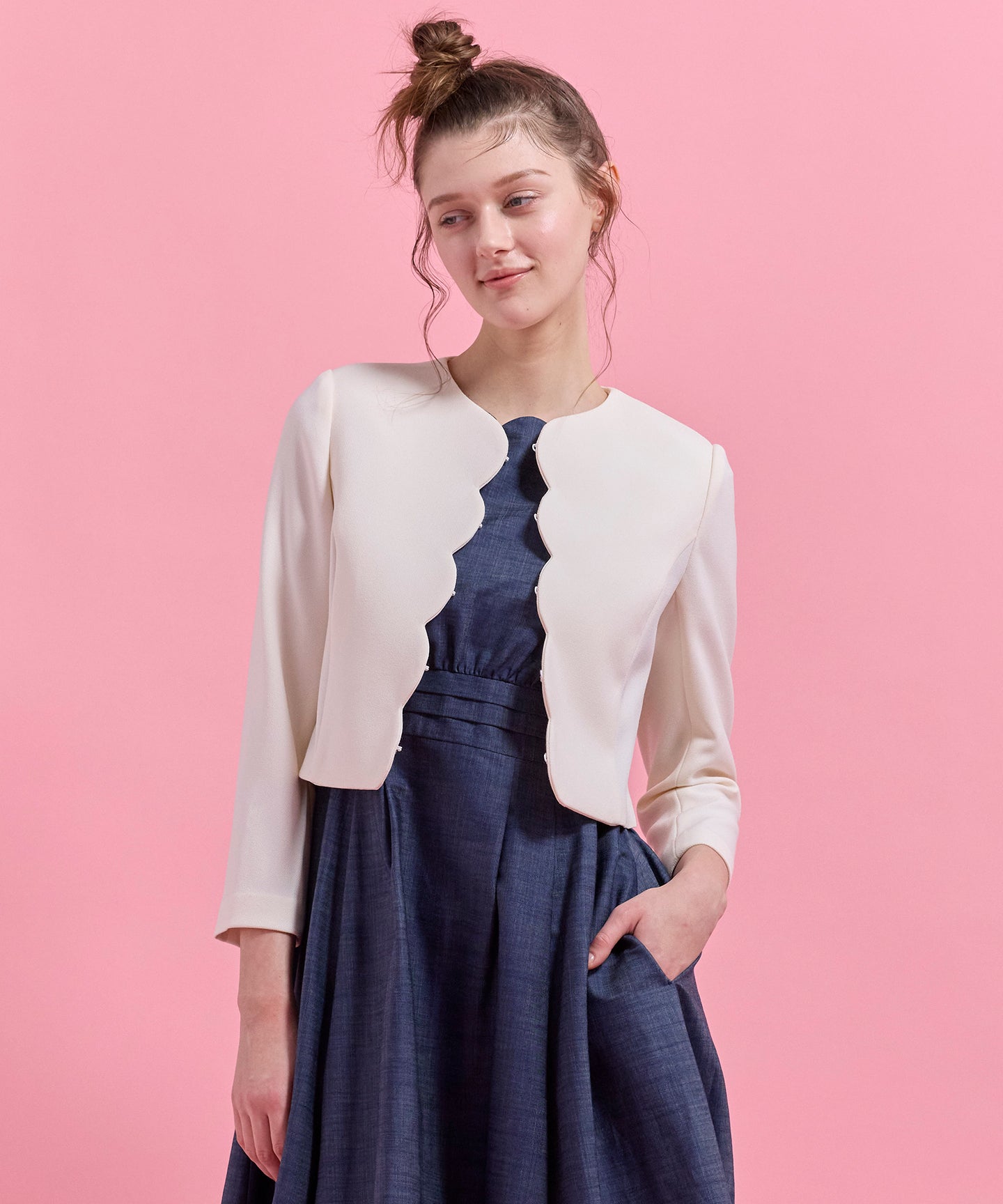 フロントに大胆なスカラップカットを施した、華やかで目を引くデザインのジャケット。 柔らかな風合いの生地感とコンパクトなシルエットが、上品で洗練された印象を与えてくれます。 ノーカラーのすっきりとした首まわりは、ドレスやブラウスとも好相性。前を閉じても開けても美しいシルエットを保ち、フォーマルなシーンからお出かけまで幅広く活躍します。 シンプルながらもスカラップディテールがスタイリングのアクセントとなり、装いに優雅なニュアンスを添える一着です。