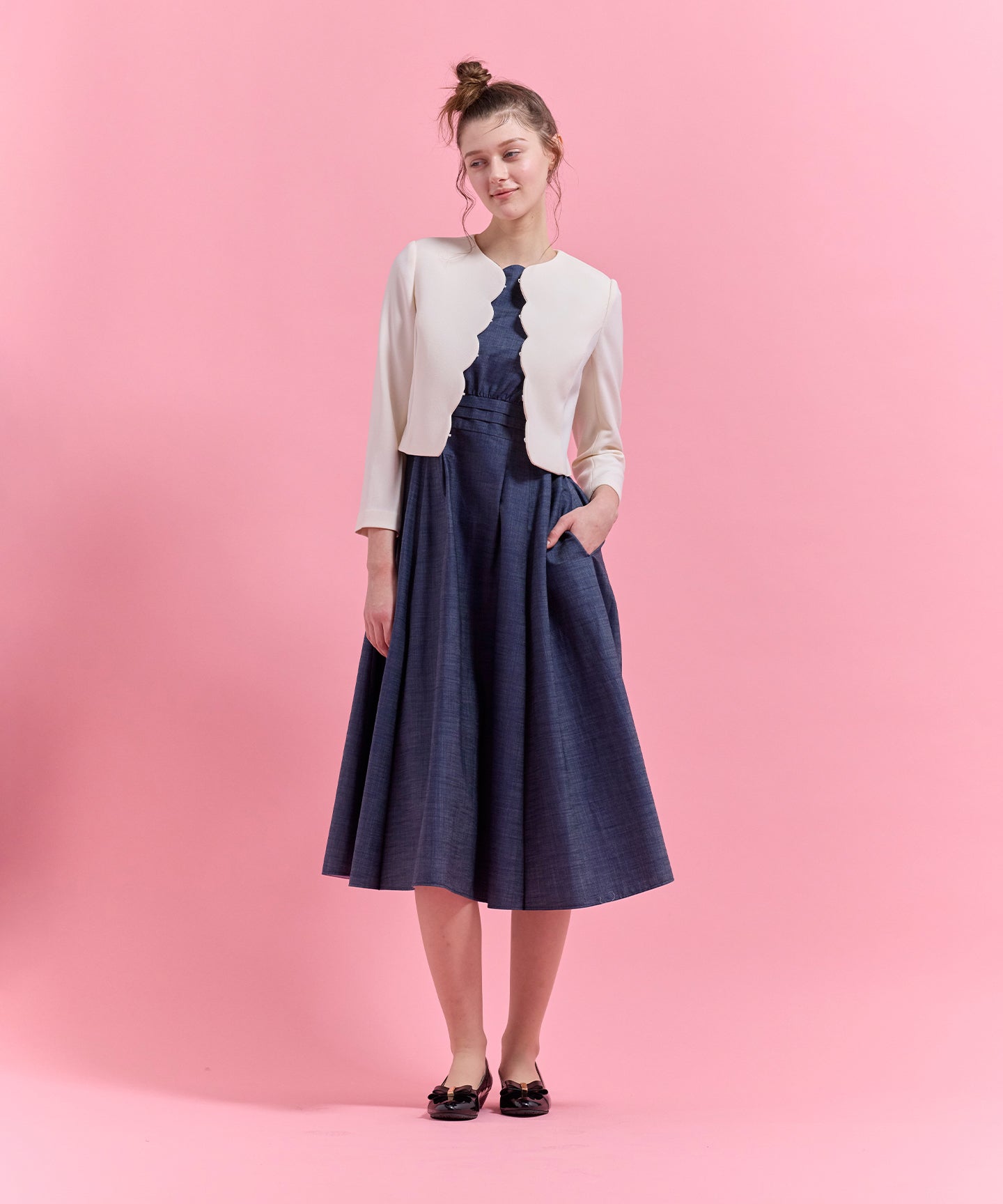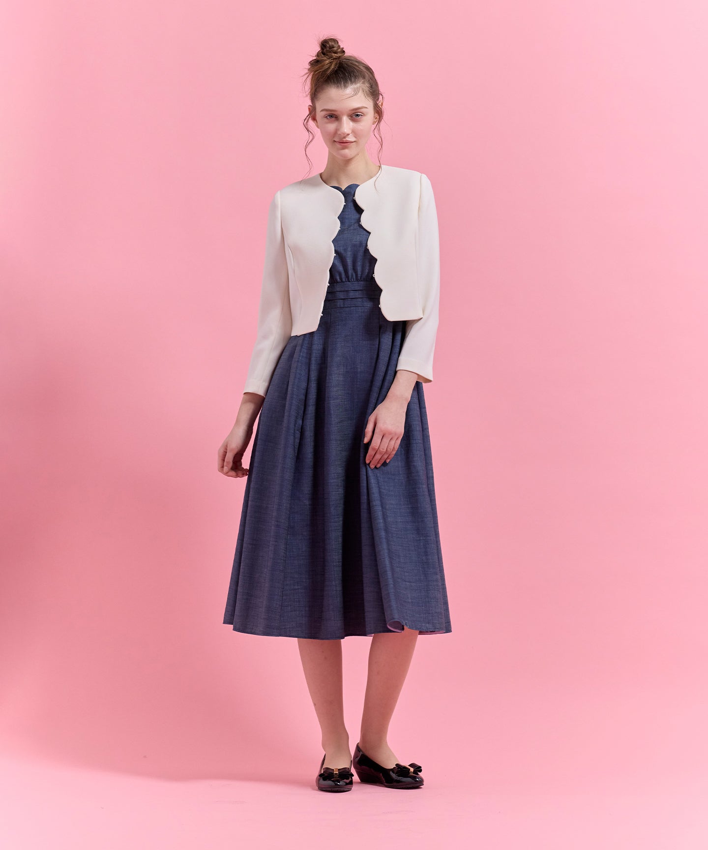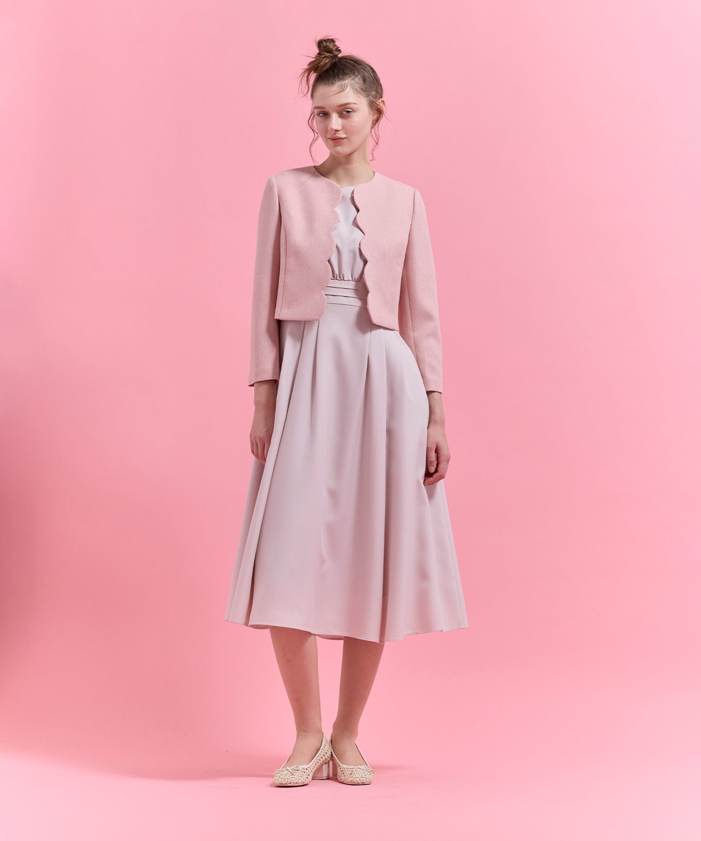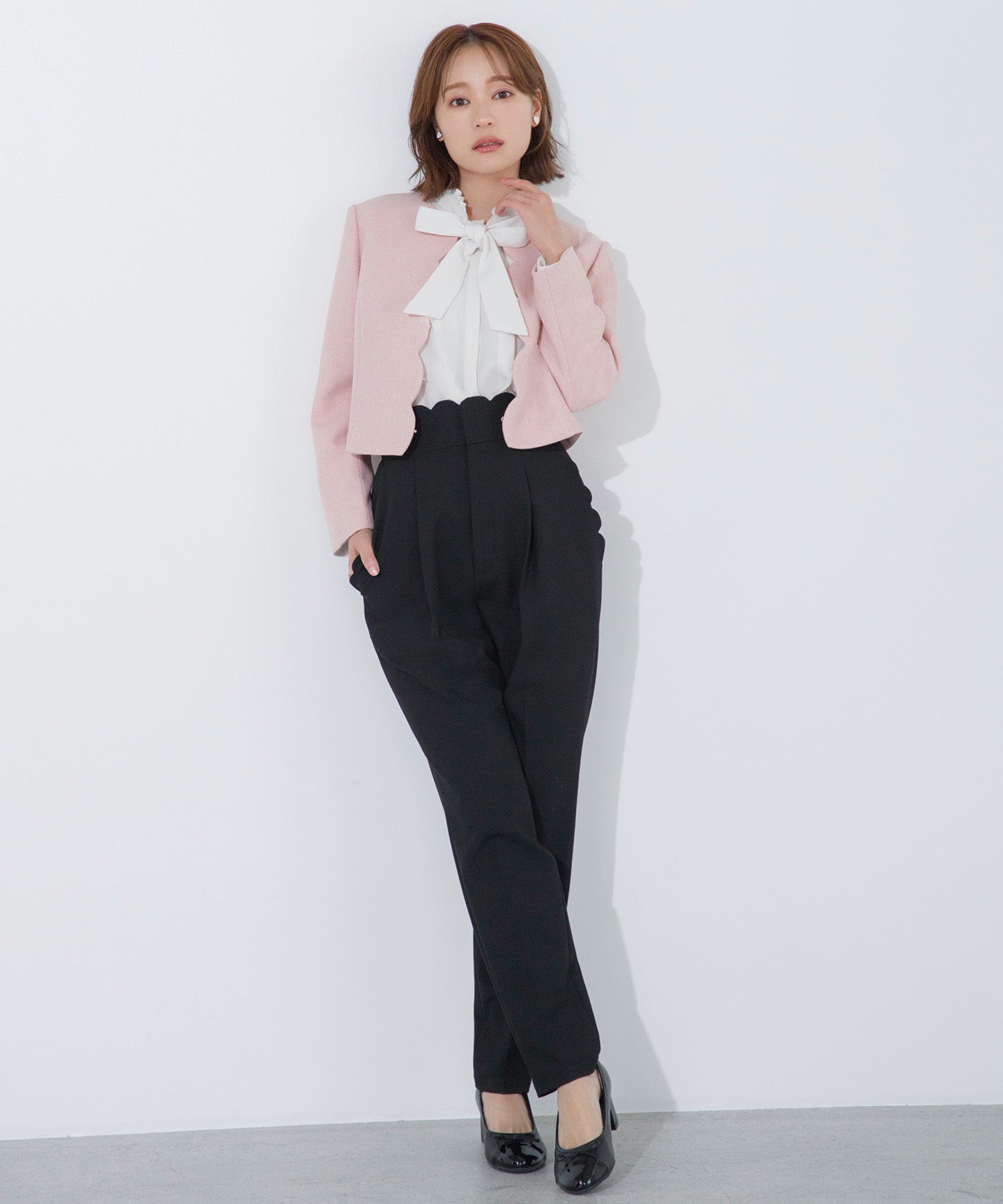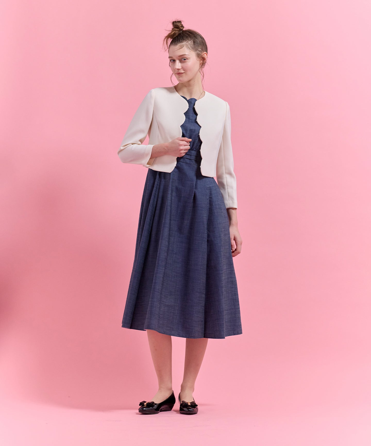フロントに大胆なスカラップカットを施した、華やかで目を引くデザインのジャケット。 柔らかな風合いの生地感とコンパクトなシルエットが、上品で洗練された印象を与えてくれます。 ノーカラーのすっきりとした首まわりは、ドレスやブラウスとも好相性。前を閉じても開けても美しいシルエットを保ち、フォーマルなシーンからお出かけまで幅広く活躍します。 シンプルながらもスカラップディテールがスタイリングのアクセントとなり、装いに優雅なニュアンスを添える一着です。